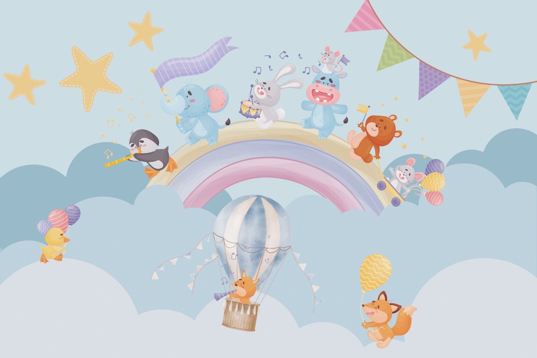 Float into a whimsical world with the musical animal rainbow parade mural. This playful rainbow wallpaper is a symphony of colour and cheer, perfect for a child's playroom or nursery. Watch as a joyful ensemble of animal marches across the sky on a vibrant rainbow, each character playing its own tune. The mural is designed to inspire and delight, turning a simple wall into a scene of jubilant harmony. As the stars twinkle and pennants flutter, this captivating rainbow animal wallpaper invites little ones to dream big and sing along with their new animal friends. Ideal for nurturing creative play and musical interest, the musical animals rainbow parade mural makes every day a celebration of imagination and fun.