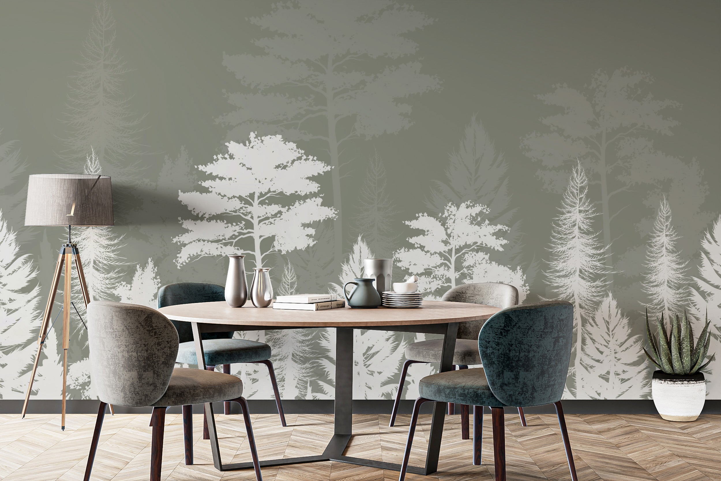 The mystic woods shadow play wall mural presents a serene dance of light and darkness, where the enchanting silhouettes of trees create a soothing haven. This mural is a masterpiece of design, ideal for those seeking a touch of nature's elegance in their home. The green wallpaper tones offer a subtle nod to the lushness of a jungle wallpaper while maintaining a minimalist charm that calms the mind and pleases the eye. Perfect for a study, bedroom, or living area, it invites a sense of quiet and contemplation. The intricate tree patterns stand tall, casting shadows that give depth and texture to your walls, fostering a space where imagination wanders, and peace prevails.