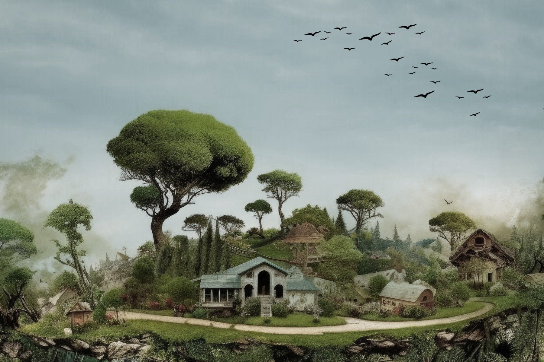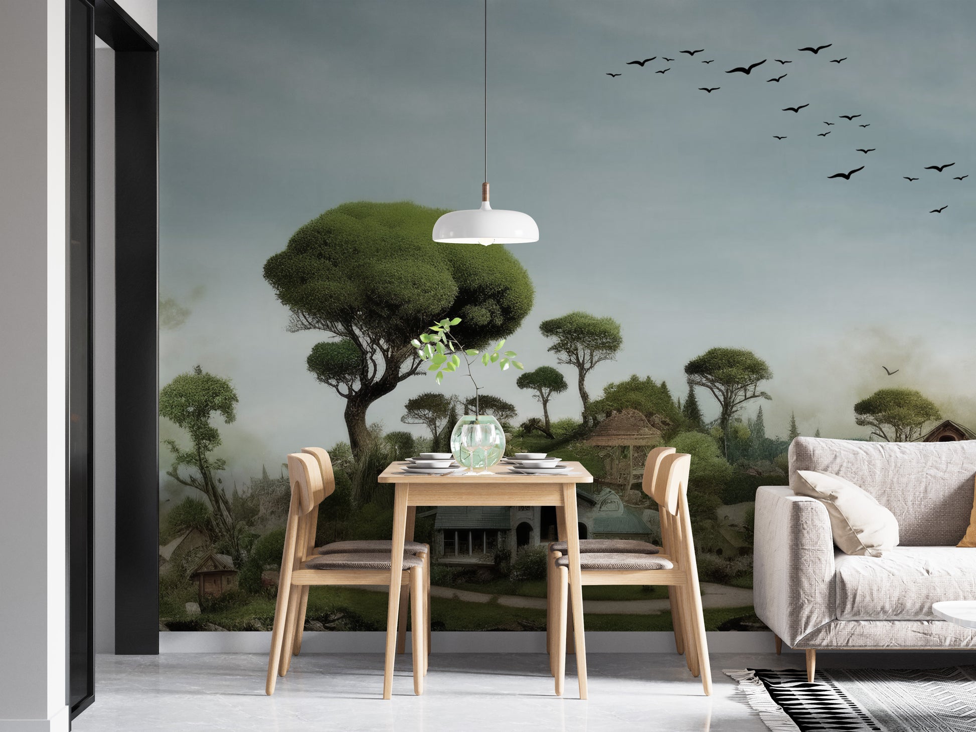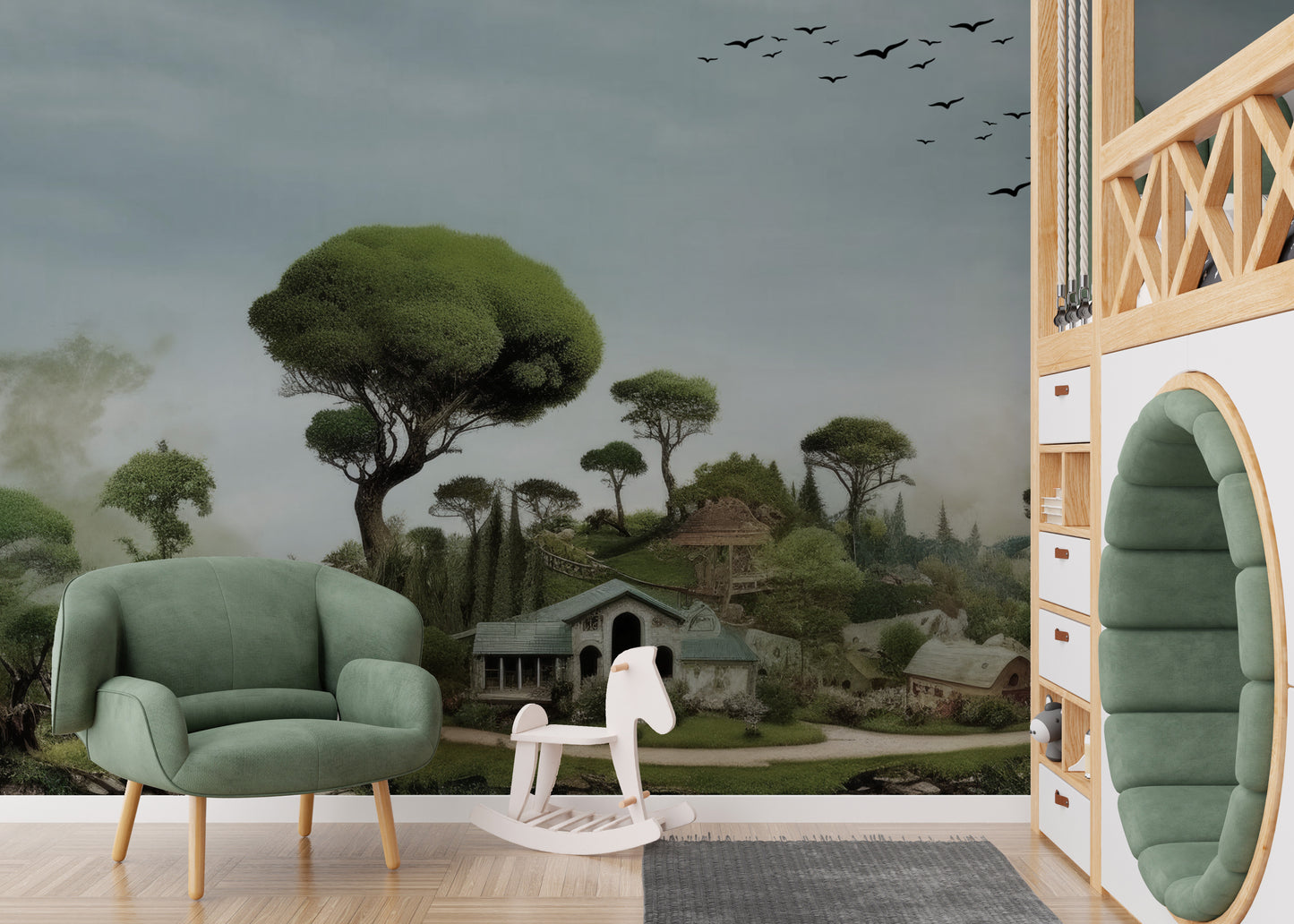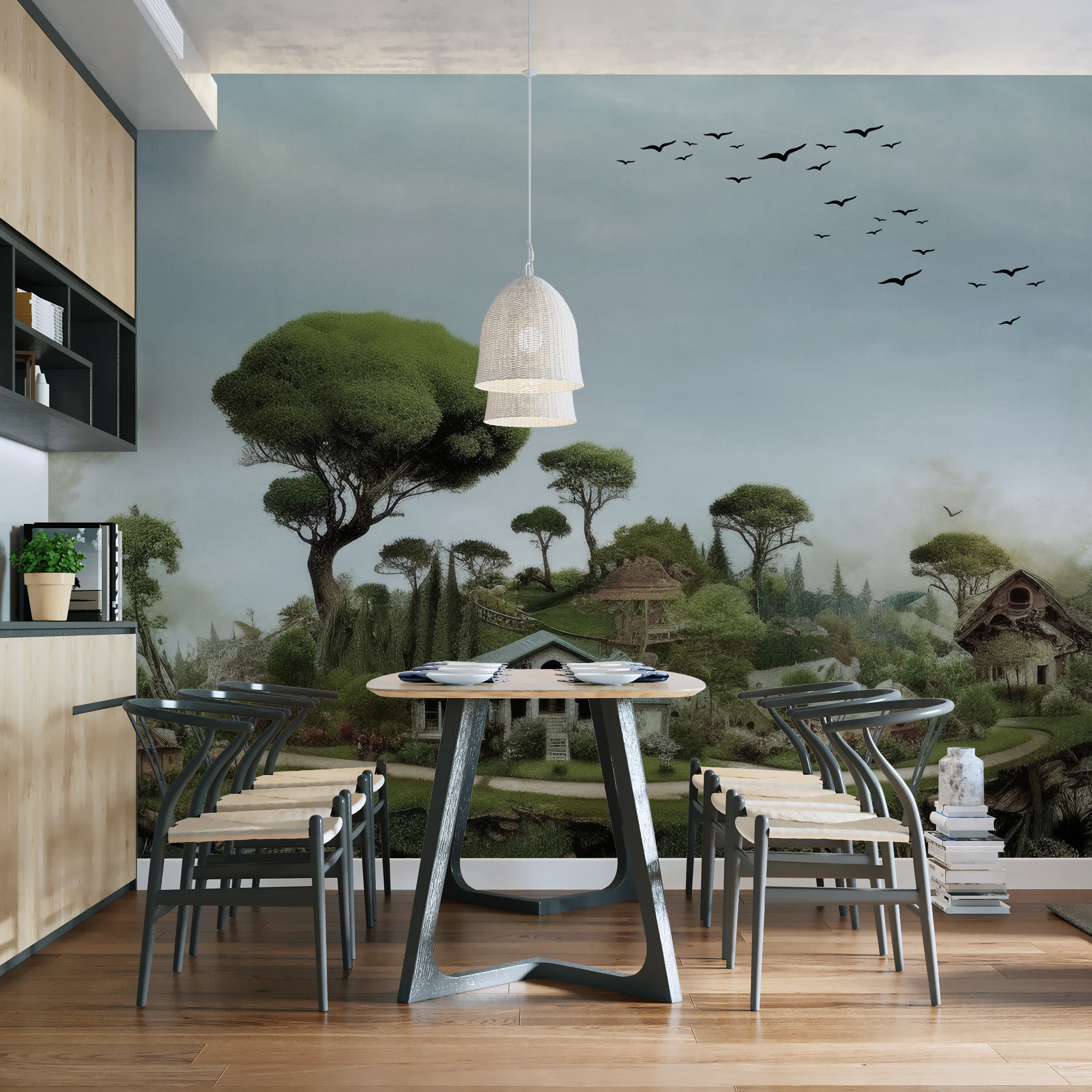 The mystical glade wall mural is a picturesque portrayal of an untouched haven where nature and quaint dwellings coexist perfectly. This piece of art invites the onlooker into a landscape where time slows, and the outside world gently fades away. It's a canvas where every tree, cottage, and winding path tells a silent story. As a backdrop, it doesn't merely adorn a wall but becomes a window to a world of serene beauty, encouraging moments of quiet contemplation and imagination. The mural stands as a testament to the beauty of pastoral life, offering a visual retreat to anyone who gazes upon its peaceful vista.