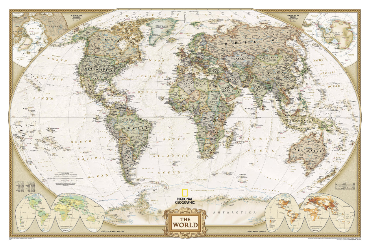 Discover global geography with the national geographic political world map wallpaper. This detailed political world map highlights country borders, major cities, and landmarks, making it perfect for classrooms, offices, or study rooms. The vintage design with earthy tones adds a classic touch, while the high-resolution print ensures every detail is clear and easy to read. Insets provide additional information on vegetation, land use, and population density. Whether you're a student, traveler, or geography enthusiast, this National Geographic political world map is an ideal educational tool for exploring the world's political boundaries and diverse regions.
