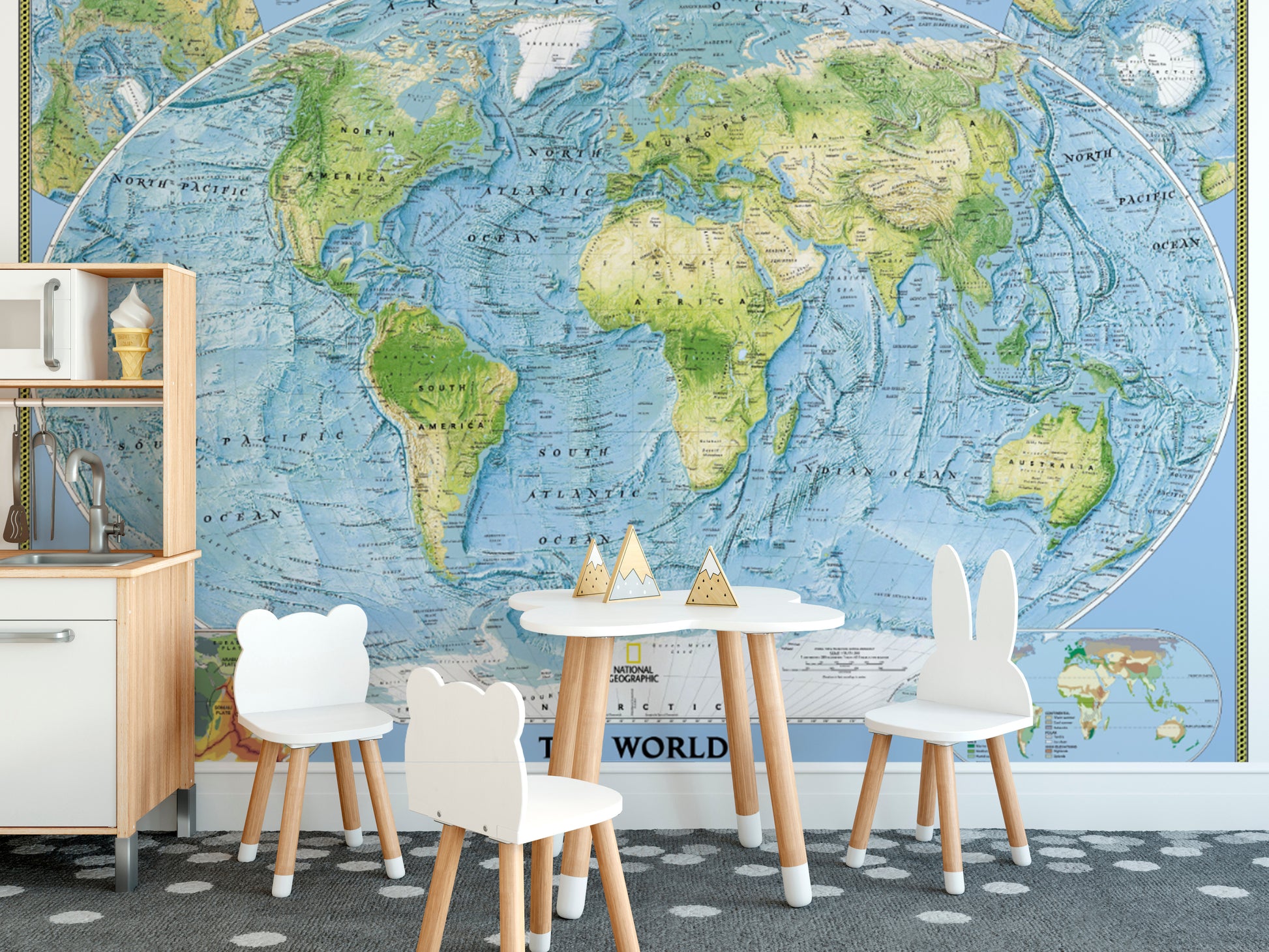 Bring the world to your wall with the national geographic world map wallpaper. This detailed world physical map highlights mountains, rivers, deserts, and ocean trenches, making it perfect for geography enthusiasts and students. The high-resolution map displays vibrant colors and precise topographic details, allowing you to explore the Earth's diverse landscapes. Insets feature tectonic plate boundaries and climate zones, offering a comprehensive geographical view. Whether for a classroom, office, or study room, this geographical feature world map combines education and style. Discover the beauty of our planet with this National Geographic world map that's informative and visually stunning.