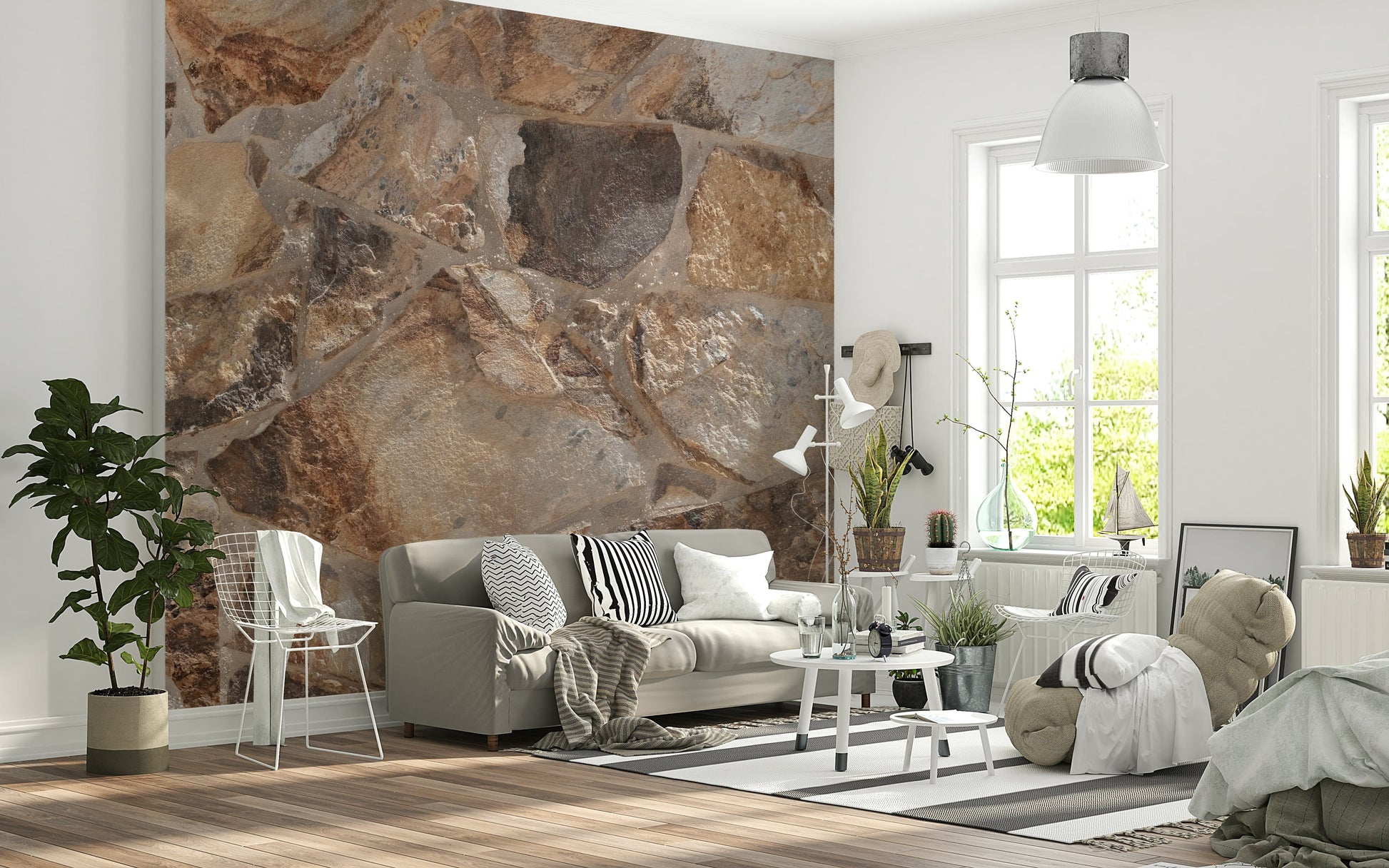 Revitalize your home with natural stone fusion wallpaper. This design features an array of stones with unique patterns and rich colors, producing a natural and striking effect. Use this wallpaper for walls in a bathroom or office to add a touch of nature to your daily life. The design blends well with natural and modern interiors.