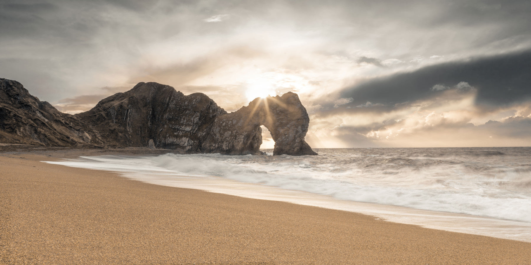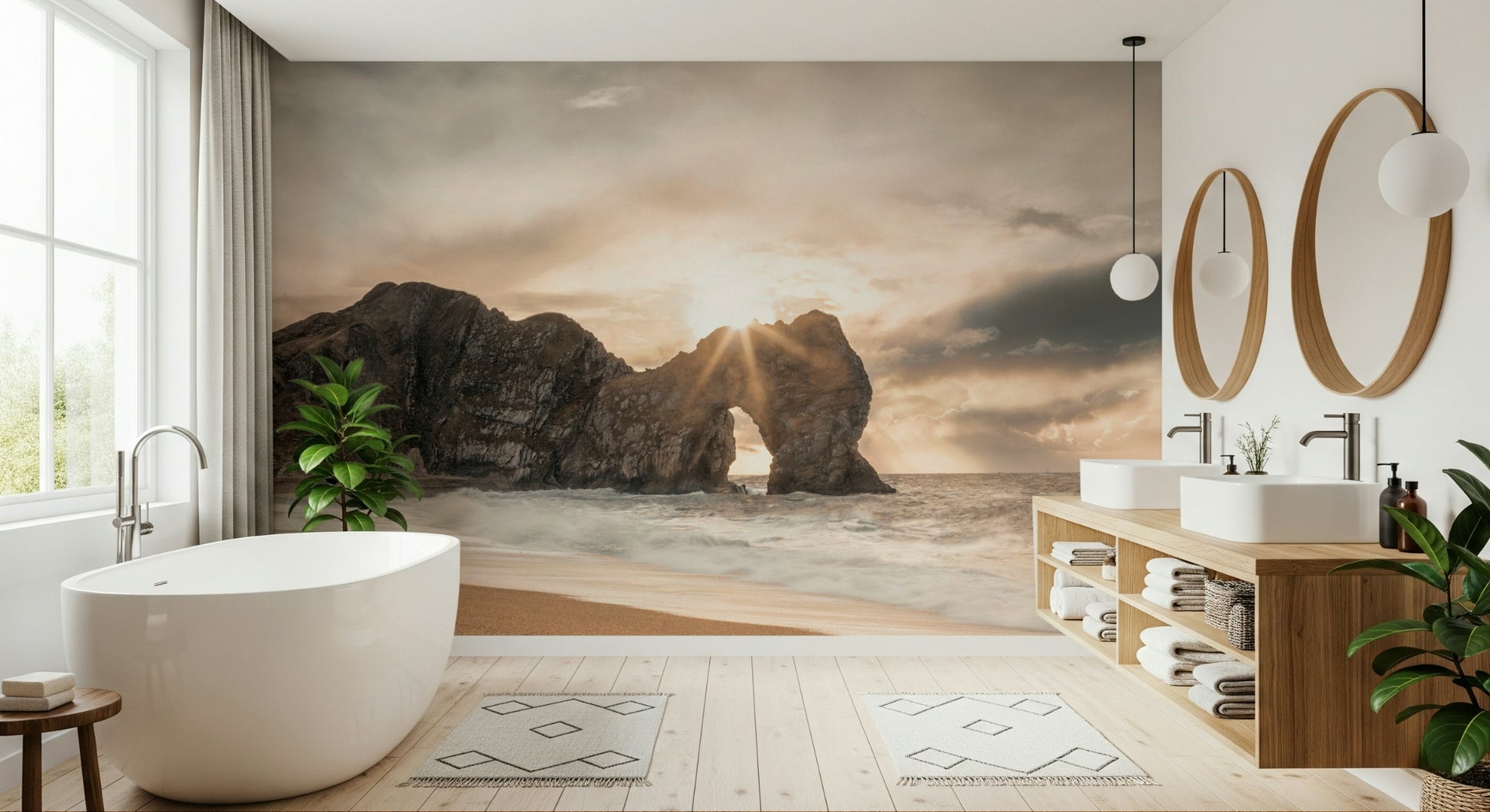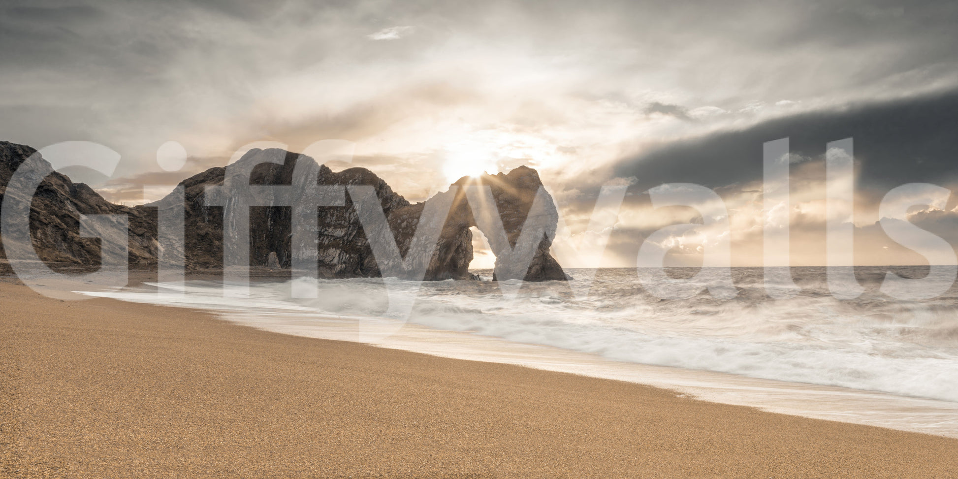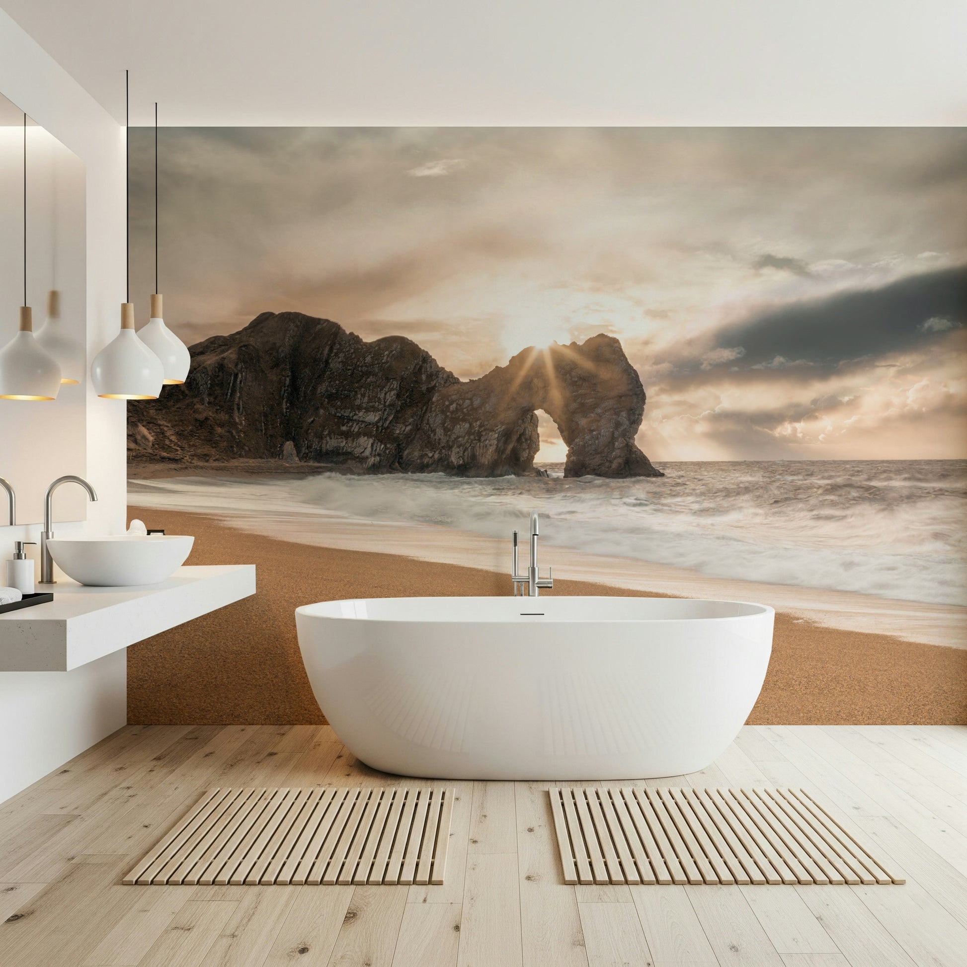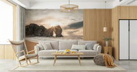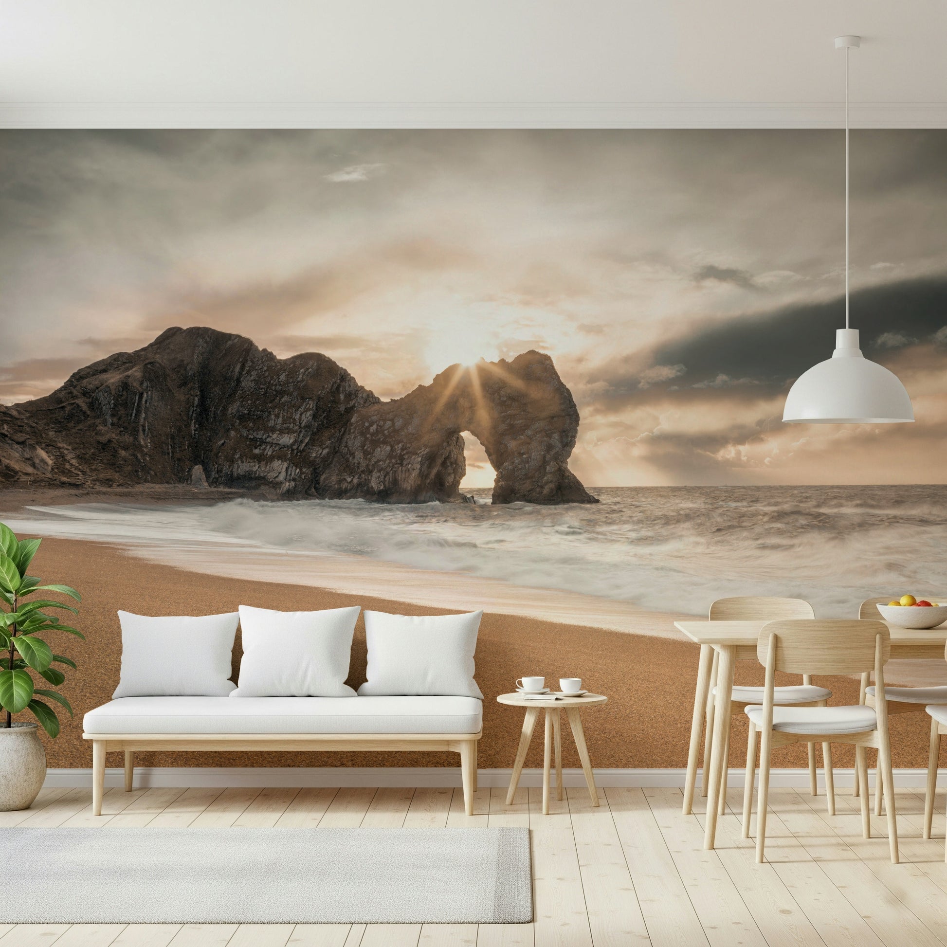 Bask in the tranquil beauty of this coastal scene. Warm sunlight pierces through a natural rock arch, illuminating the sandy beach and crashing waves. The muted color palette creates a soothing ambiance, perfect for any room seeking a touch of serenity. This wallpaper for walls brings the outdoors in, complementing interiors with its calming influence and natural elegance. Ideal for bedrooms, living rooms, or home offices.