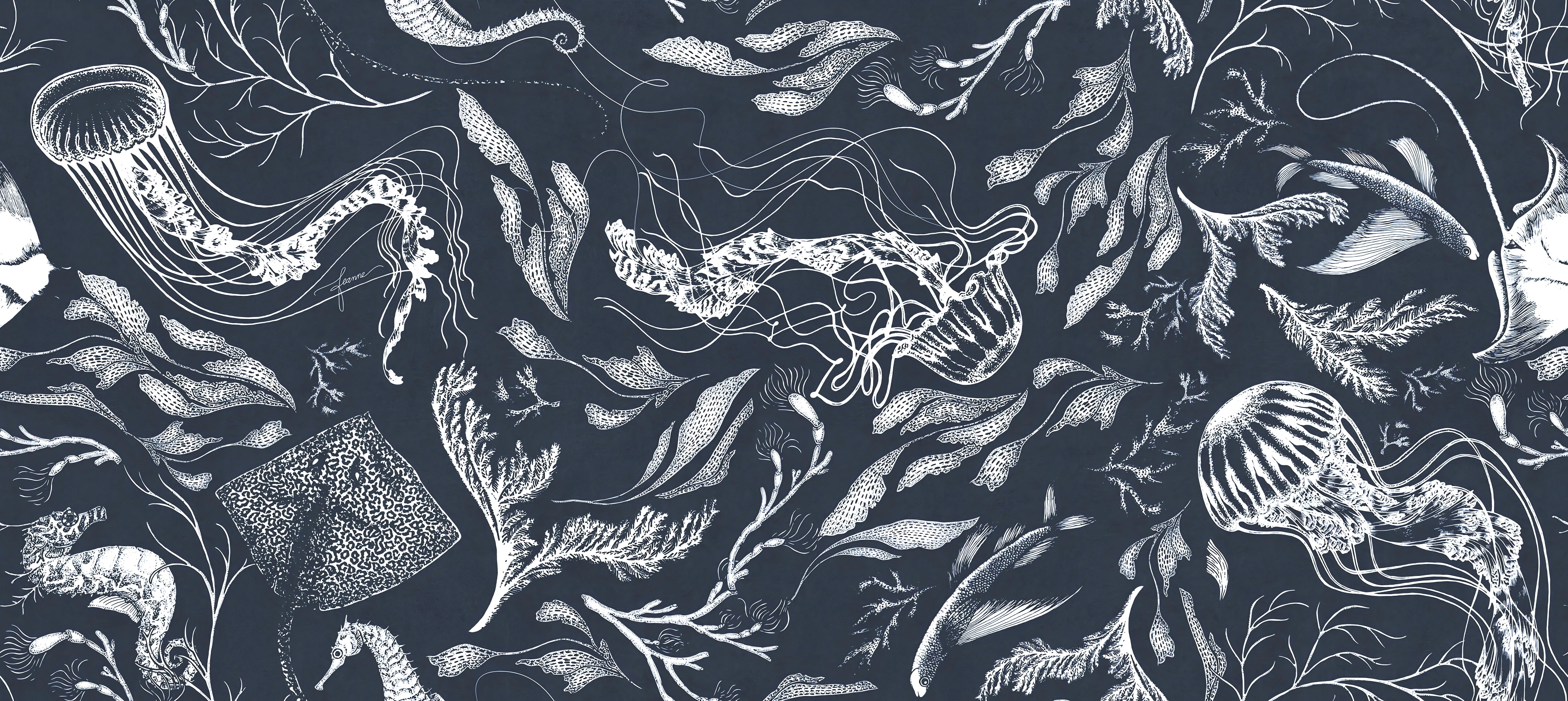 Coastal navy marine life wallpaper with detailed underwater patterns.