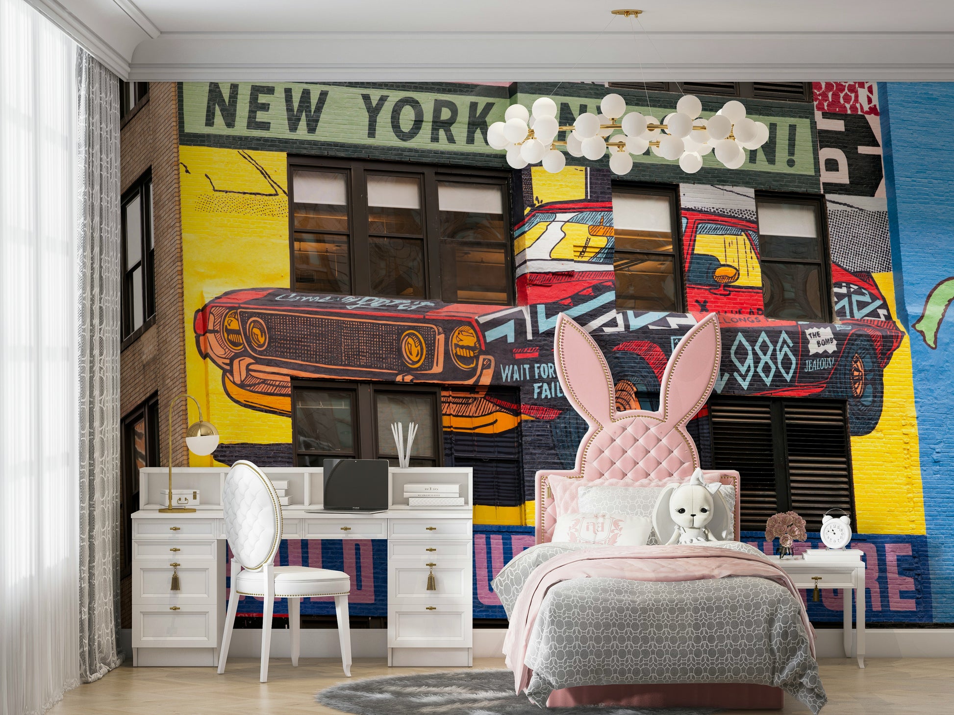 Inject energy and attitude into your space with the New York Invasion Wall Mural, a fearless pop art masterpiece bursting with color, movement, and messaging. Featuring a bold comic-style car, phrases like “BUILD YOUR OWN FUTURE” and “WAIT FOR ME FAILE,” and references to 1980s rebellion culture, this mural channels the raw creativity of NYC street art. Perfect for modern lofts, creative studios, or statement feature walls, it’s a celebration of individuality, expression, and urban style. Ideal for those who live loudly, dream big, and design without limits.