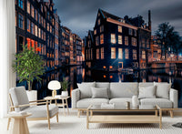 Transform your walls with this captivating wallpaper for walls that showcases Amsterdam’s distinctive charm at night. The image focuses on the reflection of the city lights on the canal, offering a stunning visual effect. Buildings with glowing windows line the waterway, creating a feeling of warmth and tranquility. This wallpaper brings a peaceful, elegant ambiance to bedrooms, studies, or even a sophisticated home office. The interplay of light and shadow enhances the architectural details and creates a unique focal point in any space.