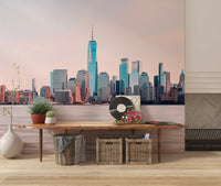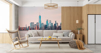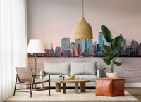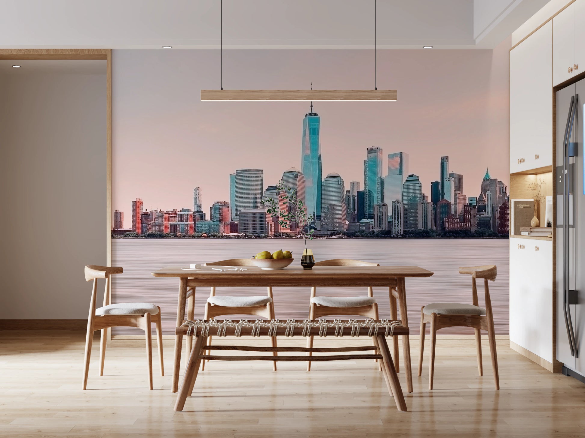 Transform your space with this serene cityscape featuring the iconic New York City skyline. The soft, muted color palette of pinks, blues, and grays creates a calm and sophisticated atmosphere. The gentle water reflections add a sense of tranquility, making it suitable for bedrooms, living rooms, or even home offices. This wallpaper for walls brings the beauty of urban landscape to any room, enhancing it with a touch of modern elegance and understated grandeur. It works beautifully as a feature wall, instantly adding depth and visual interest to interior spaces.