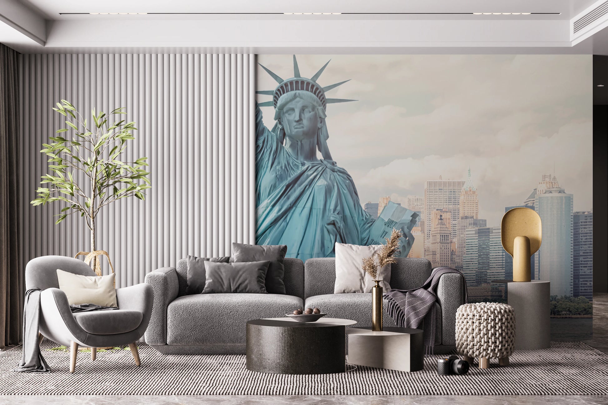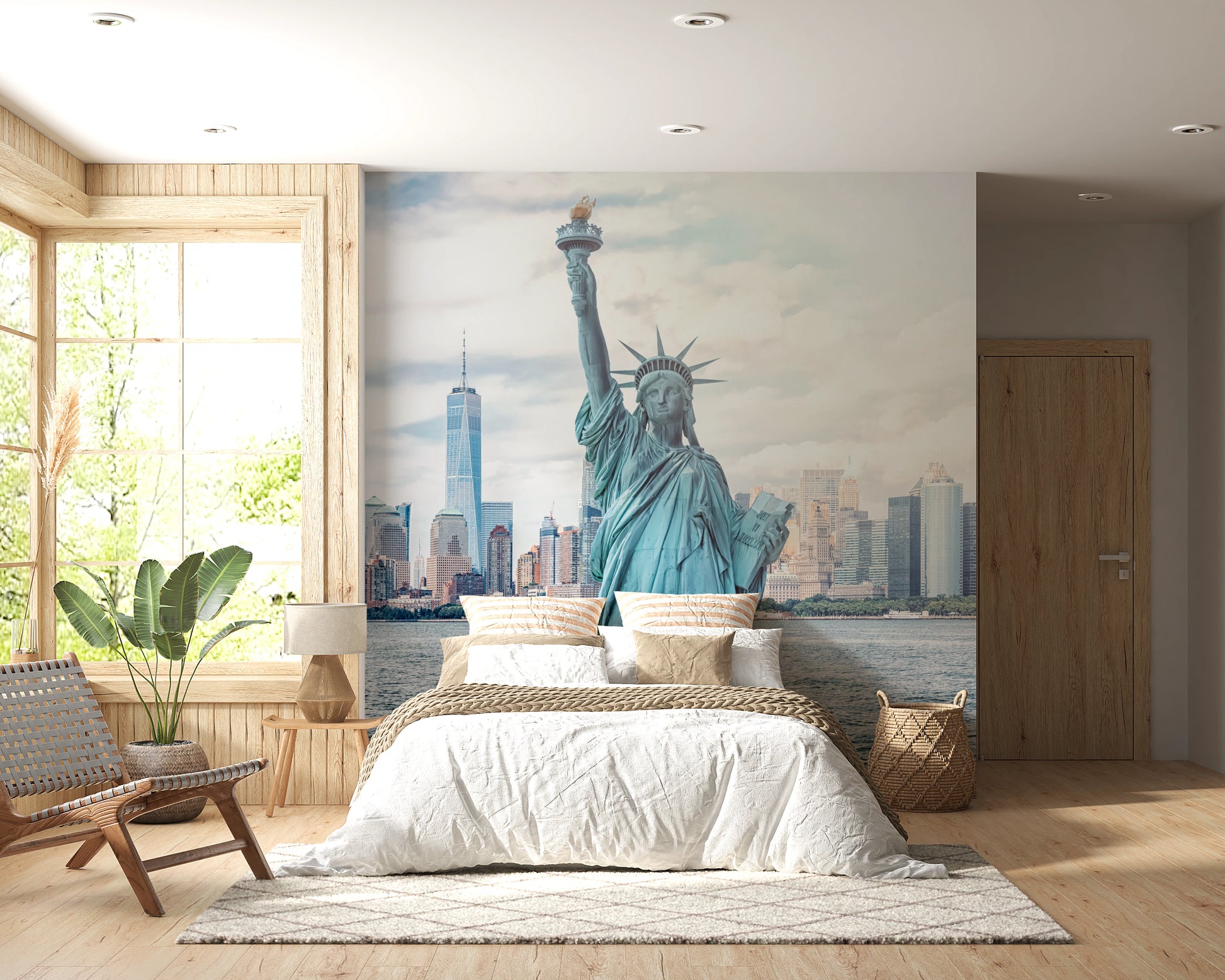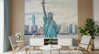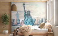 Elevate your space with this awe-inspiring depiction of freedom on your walls. The Statue of Liberty and the vibrant New York City skyline command attention, inviting you into a world of history and culture. This wallpaper for walls features a soft, light color palette. Its delicate details lend a calming, yet stimulating, effect. Enliven a dining room with a sense of grandeur. It works well as a backdrop for offices. With its neutral tones and powerful imagery, this design makes a statement. Introduce sophistication into teen rooms and entryways.