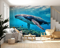 Invite the serenity of the deep sea into your home with this captivating wallpaper for walls. This design features a majestic whale gliding gracefully amidst vibrant coral reefs and schools of colorful fish. The rich, cool blues of the water contrast beautifully with the warm oranges and reds of the coral, creating a visually stunning focal point. Perfect for adding a touch of tranquility to living rooms, bedrooms, or even bathrooms, this wallpaper transforms your space into an underwater oasis, fostering a sense of calm and wonder. Let this breathtaking scene be an everyday escape, enriching your interior spaces with its beauty.