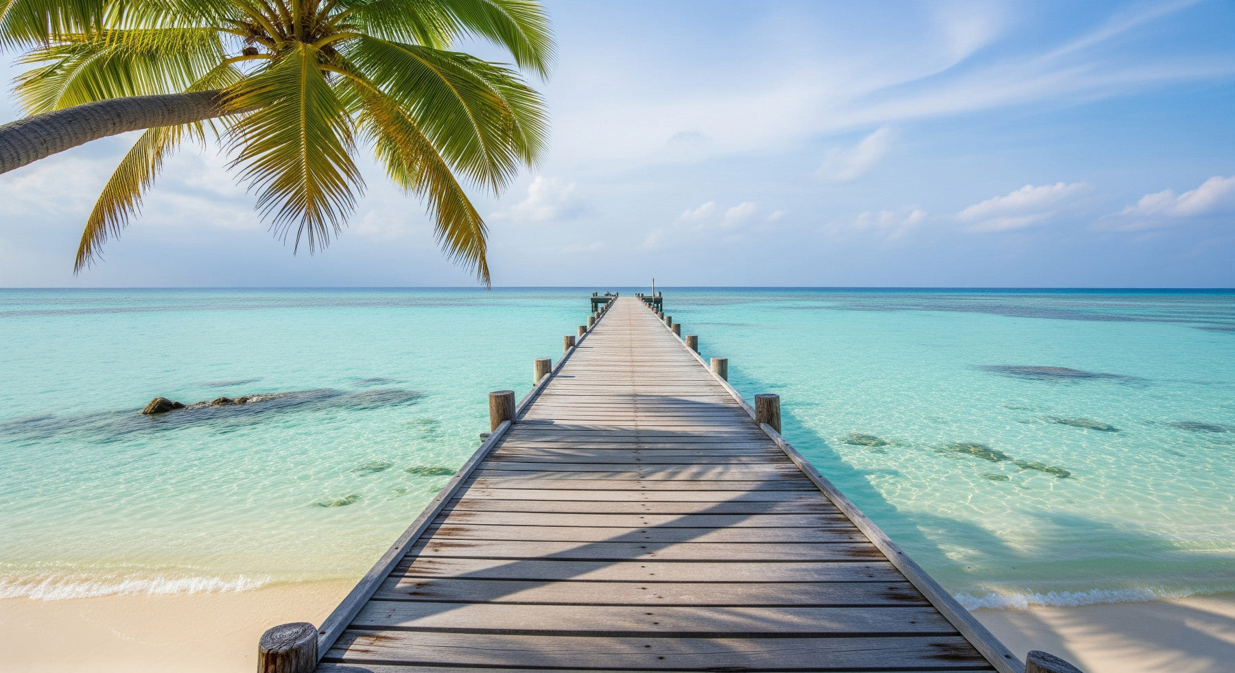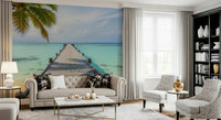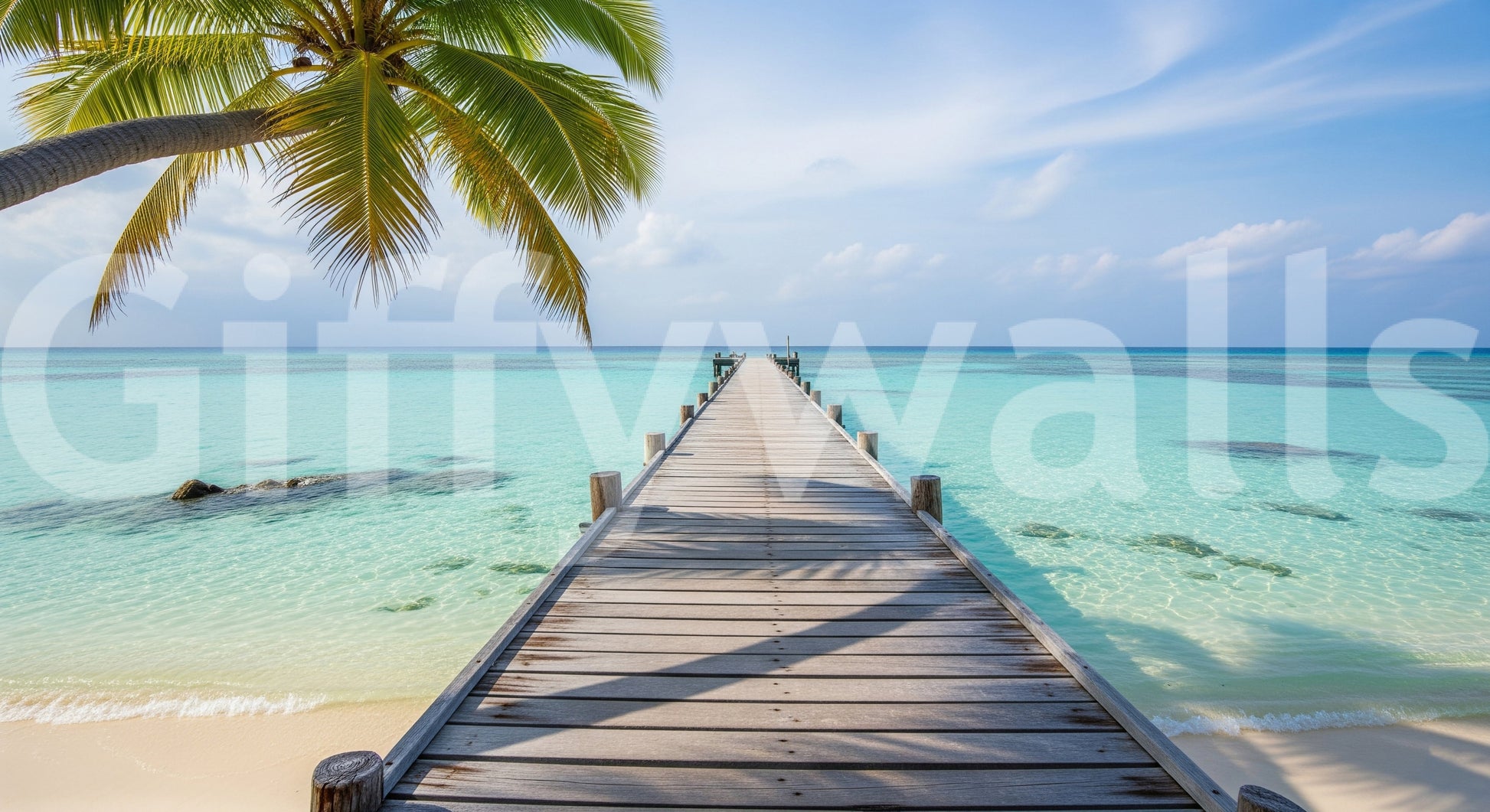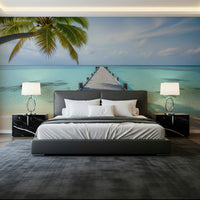 Transform your living space with this serene ocean pier scene. This wallpaper for walls features a wooden pier stretching into crystal-clear turquoise waters, framed by a lush palm tree. The soft color palette creates a calming, coastal atmosphere. It's perfect for bringing a touch of paradise to living rooms, bedrooms, or even bathrooms, creating a sense of spaciousness and tranquility. The design enhances the natural light in any room, making it feel brighter and more inviting. The realistic detail adds depth, turning your wall into a picturesque escape.