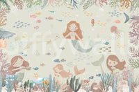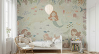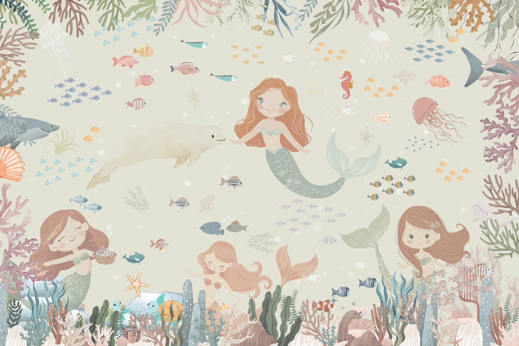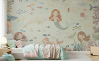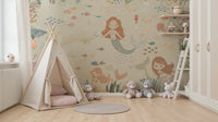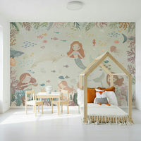 Drift into a peaceful underwater scene with this delightful wallpaper for walls. It features gentle mermaids, friendly sea animals, and lush coral. The design has soft hues of pink, green, and beige that create a serene and inviting atmosphere. This wallpaper is ideal for children's bedrooms, nurseries, or bathrooms. It offers a charming ambiance, making interiors feel relaxing and playful.