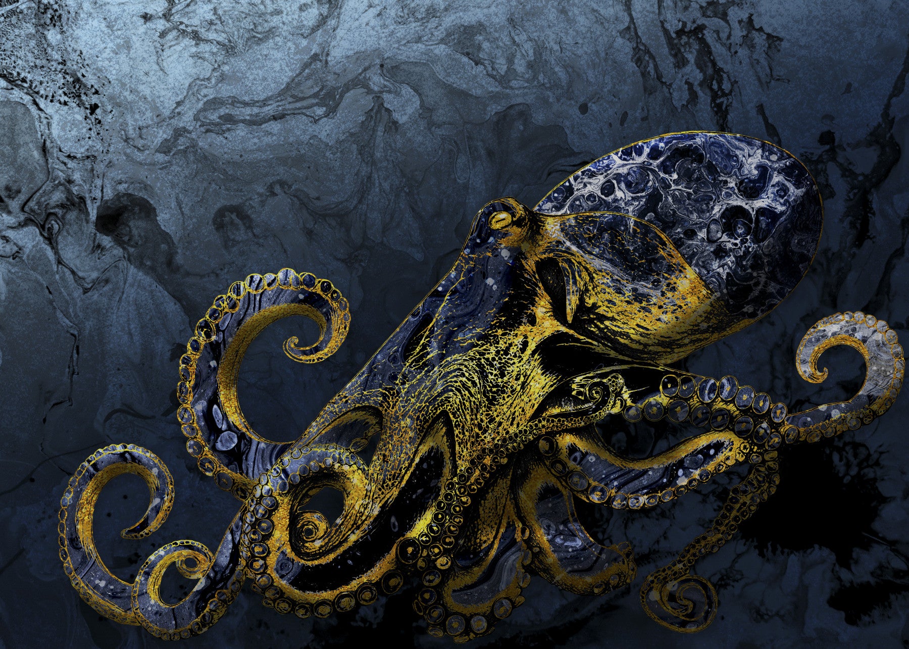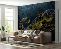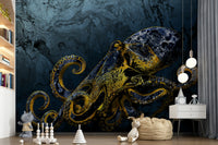 Dive into the depths with this striking octopus design. The combination of gold and inky blues creates a captivating look. Its unique marbling effect adds depth and sophistication. This wallpaper for walls brings a touch of the ocean's mystery into your home. Imagine it in a living room, creating an eye-catching feature wall. Or perhaps it enhances a study, sparking curiosity and contemplation. Its rich palette makes it a great choice for bedrooms seeking a touch of drama and elegance. The fluidity of the pattern will complement both modern and classic interiors.