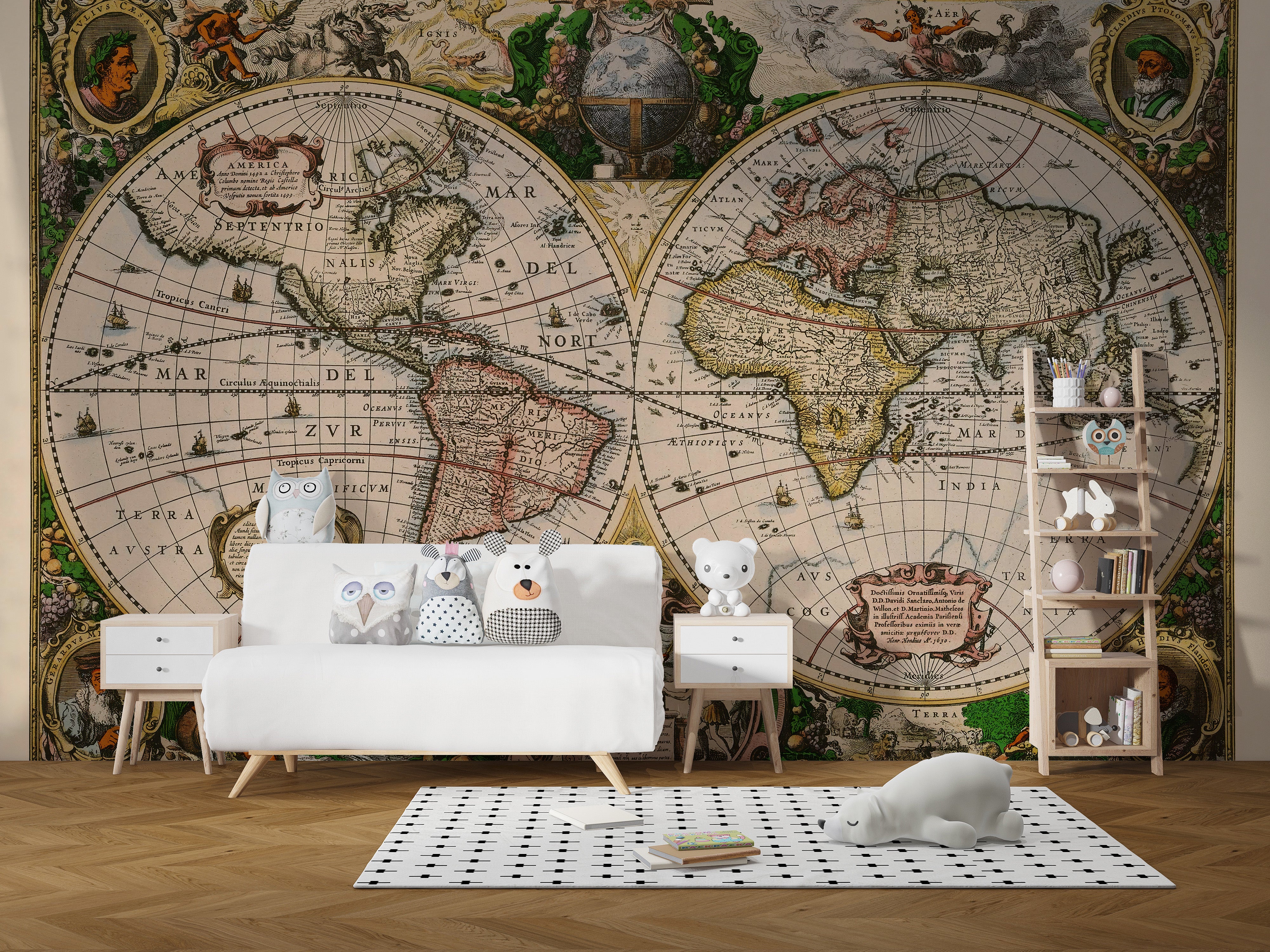 Transform any room into a statement of elegance and curiosity—be it your living room, home office, kids room, or even a playschool. With its classic color tones, this world map wallpaper seamlessly complements wooden furniture and various decor styles, adding a touch of sophistication.