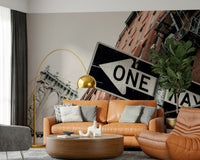 One Way, Brooklyn Wall Mural featuring an urban street scene with iconic Brooklyn architecture.