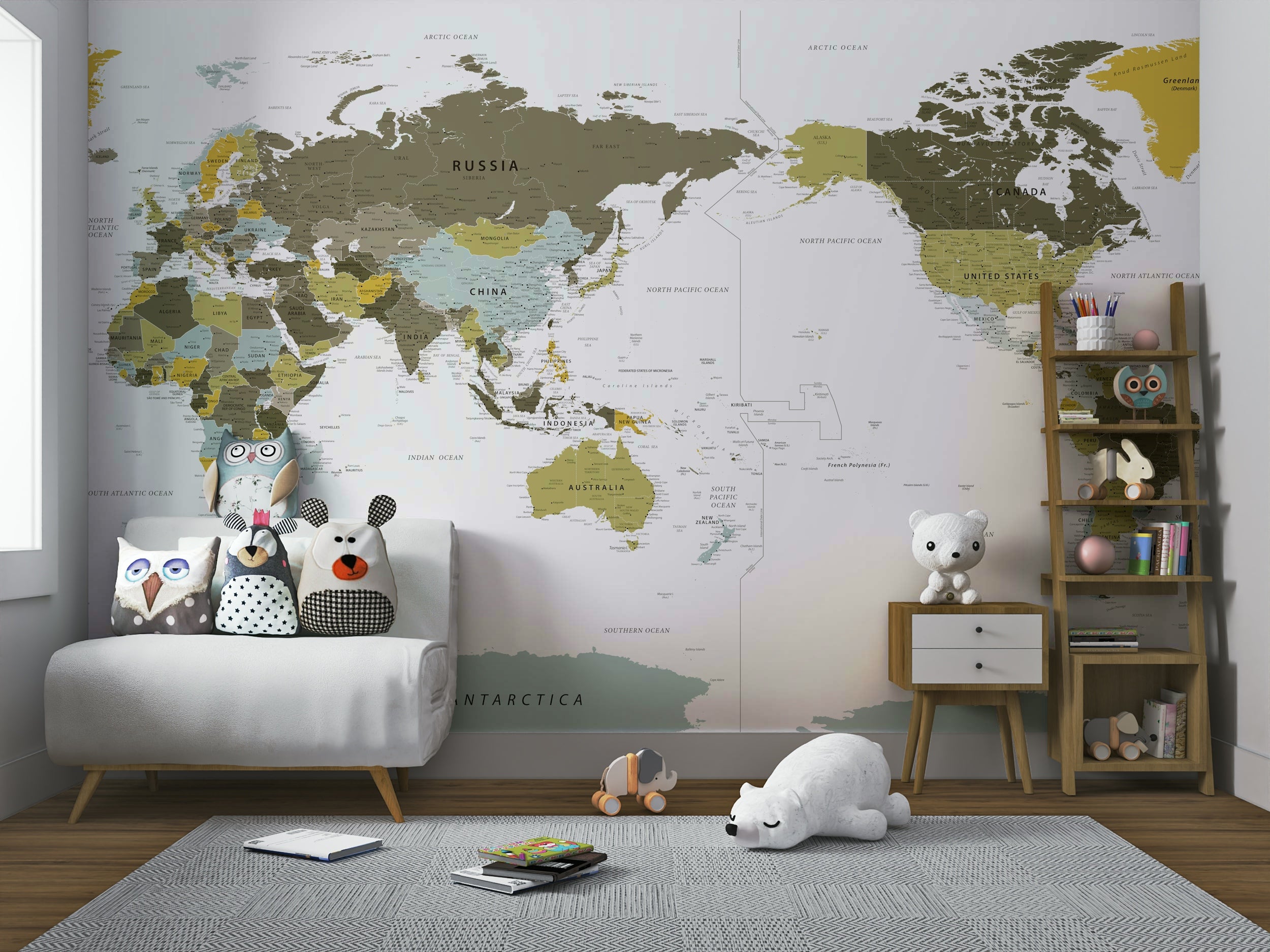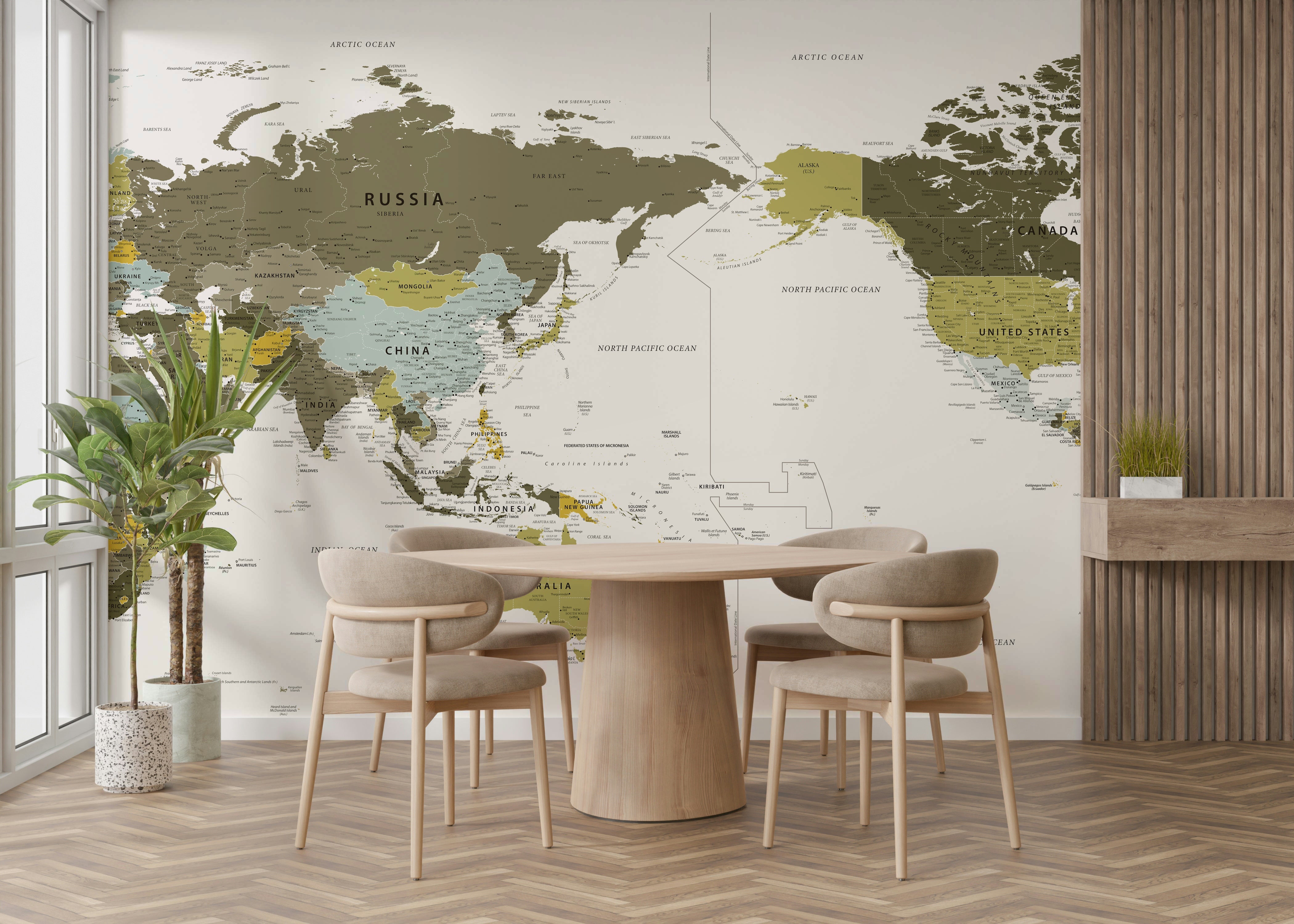 Explore the world from a unique perspective with this captivating olive green Pacific-centered world map wallpaper. The subdued, earthy tones create a calming and sophisticated mood, while the detailed cartography provides a wealth of geographical information. Each country is subtly highlighted in varying shades of olive and beige, enhancing the map's visual appeal and readability. This wallpaper is perfect for home offices, classrooms, or anywhere you want to bring a touch of geographic elegance and a peaceful atmosphere.