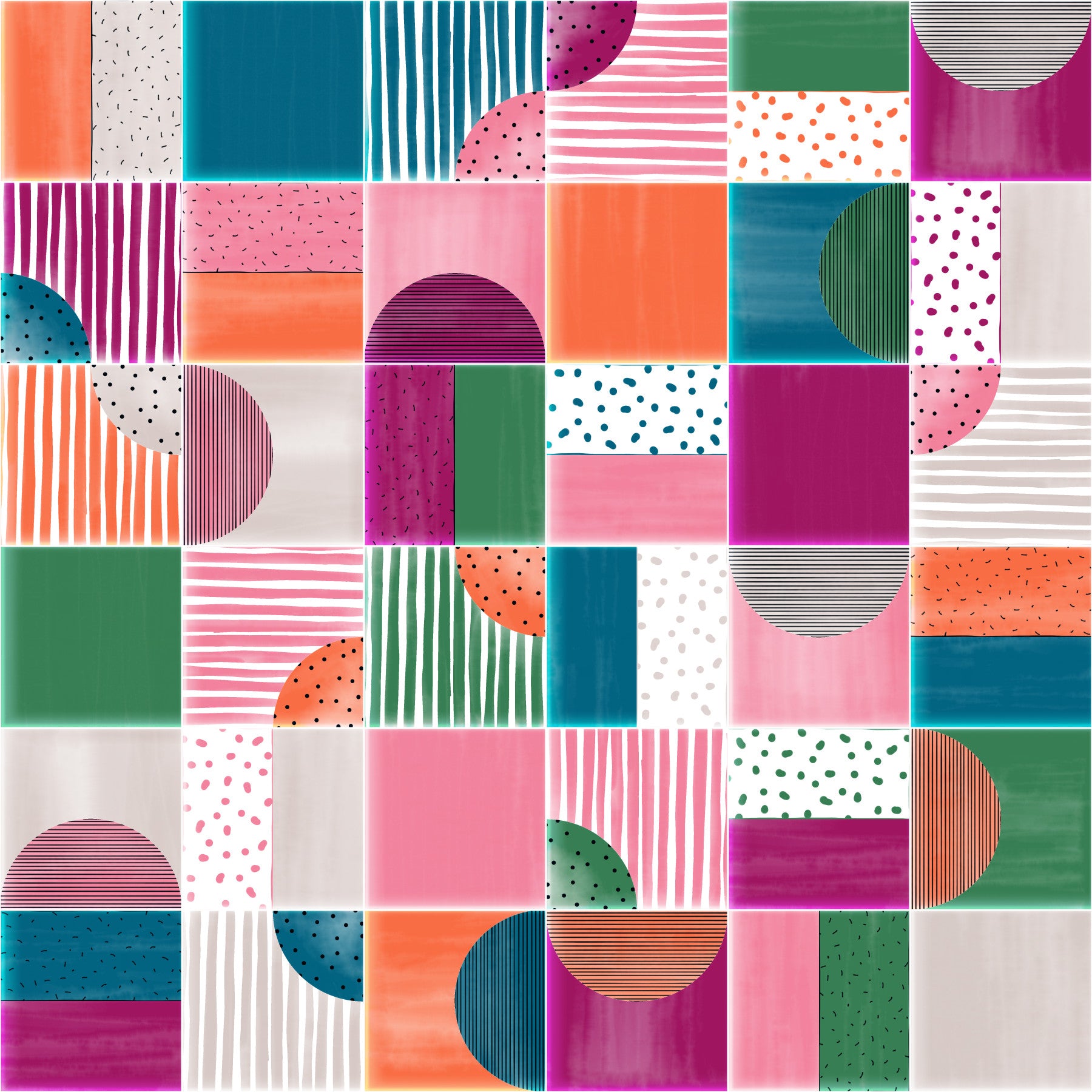 Get ready to party with the Painted Modern Tiles Kid Party wallpaper! This vibrant and playful design is perfect for adding a touch of whimsy to any space. Featuring a delightful arrangement of painted tiles, this wallpaper boasts a kaleidoscope of cheerful colors like pinks, greens, teals, and oranges, creating a lively and energetic atmosphere. Bold stripes, scattered dots, and geometric semi-circles dance across the surface, offering a modern yet youthful aesthetic. The brushstroke textures add an artistic, hand-painted feel, making each tile feel unique. Ideal for kids' rooms, play areas, or any space that needs a dose of fun, this wallpaper brings the celebratory spirit of a kid's party right to your walls. Transform your space with this joyful and captivating design!