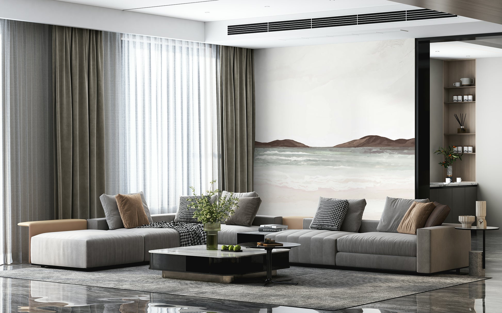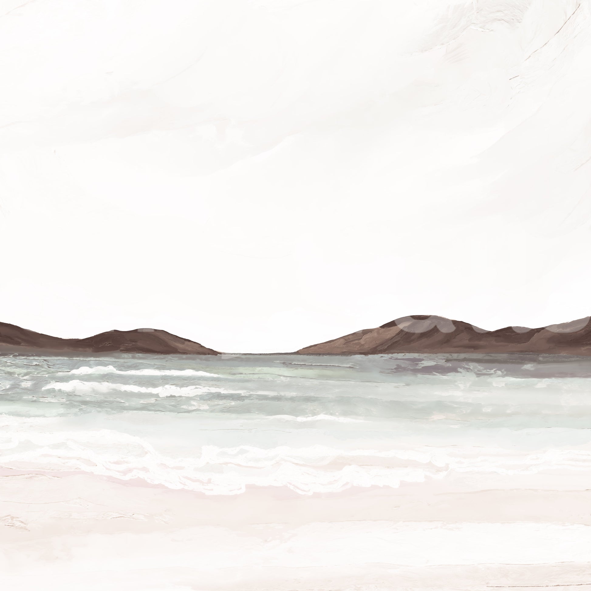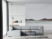 Transform your rooms with this painted coastal landscape wallpaper for walls. Delicate brushstrokes blend beige sands, soft blue waters, and earthy brown hills. This design brings a peaceful, organic aesthetic to any room. The muted color scheme offers a sophisticated, calming effect, making it ideal for bedrooms, bathrooms, or home offices. Watch how the subtle texture creates visual interest, adding depth and dimension to your walls. Enhance your décor with this versatile design that easily complements natural wood tones and minimalist furnishings.