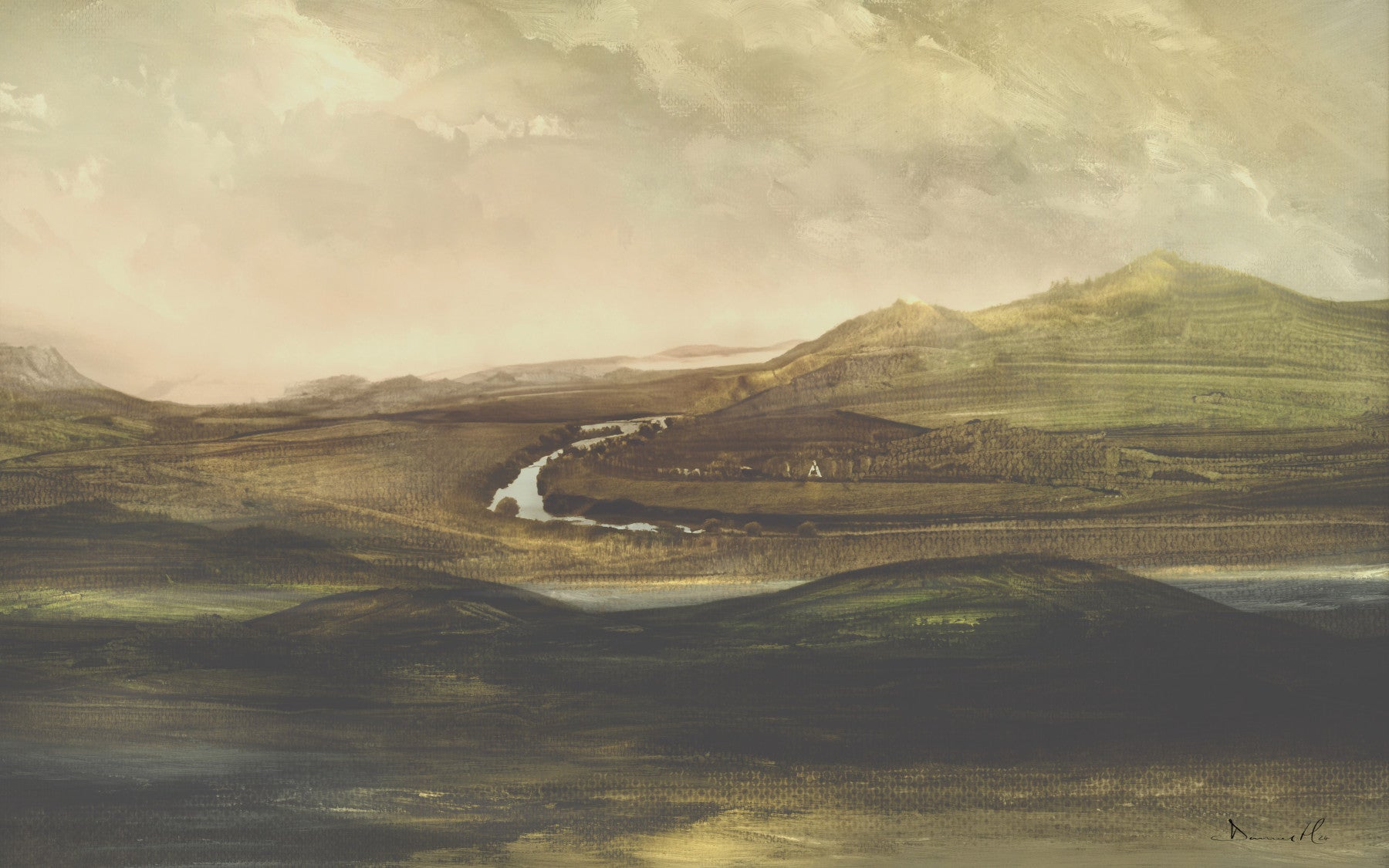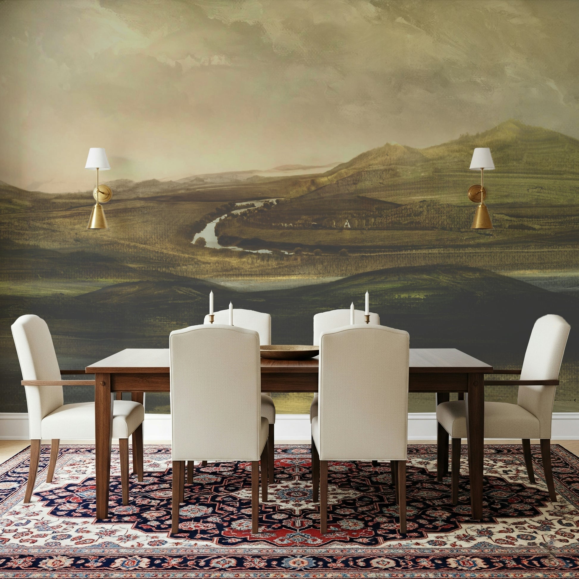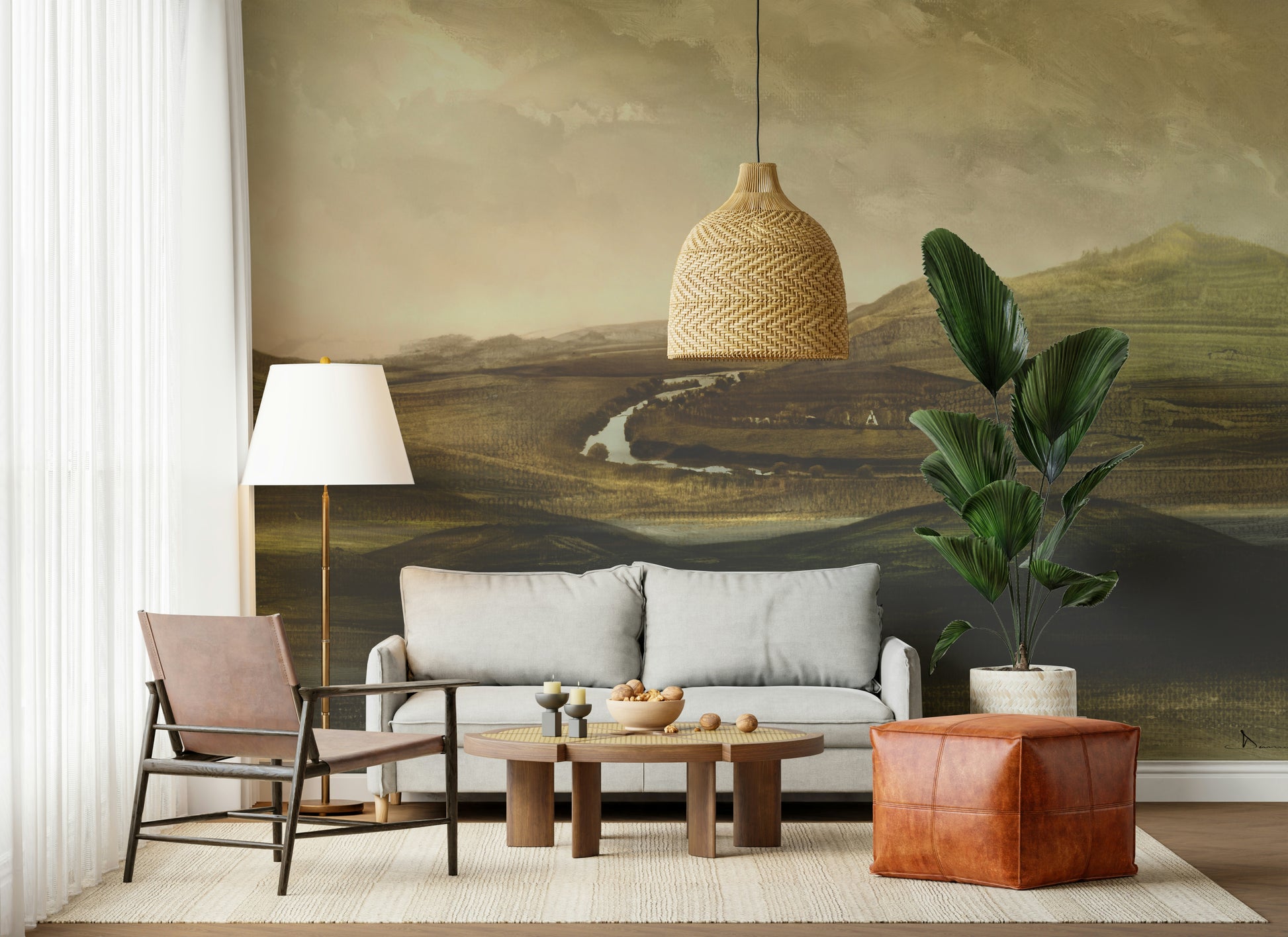 Transform rooms with this scenic landscape. It showcases rolling hills and a serene river, created with expressive brushstrokes in earthy hues. The wallpaper for walls presents a calming ambiance, ideal for a living room, bedroom, or office. The soft tones and vista design offer a touch of nature, creating visual depth and expanding the feel of any space. It promotes a relaxed vibe in minimalist or traditional decors.