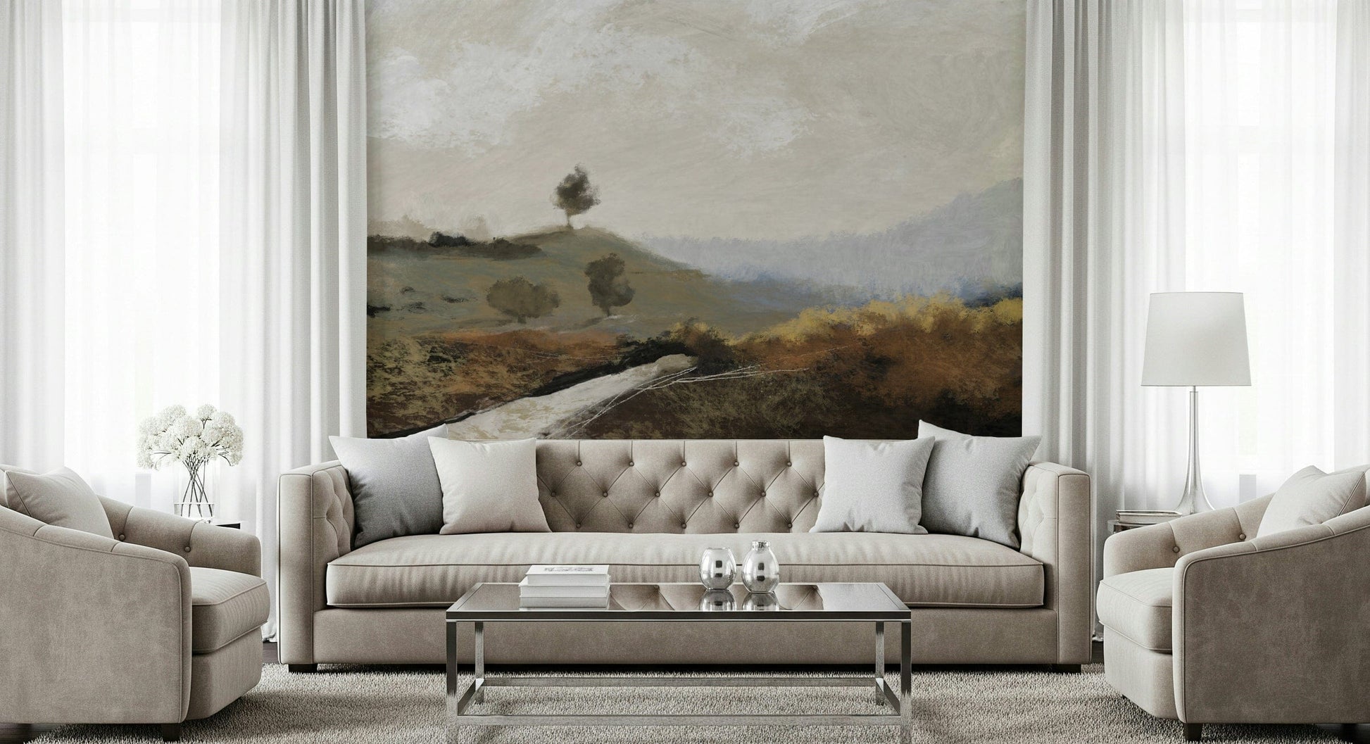Experience the serenity of a hand-painted landscape. This wallpaper for walls captures a tranquil vista with soft brushstrokes and a muted color palette. Hues of beige, brown, and blue blend to create a calming atmosphere. The design evokes a sense of peace. This versatile design suits bedrooms, living rooms, or offices, creating a relaxing backdrop and complements minimalist or rustic interiors.