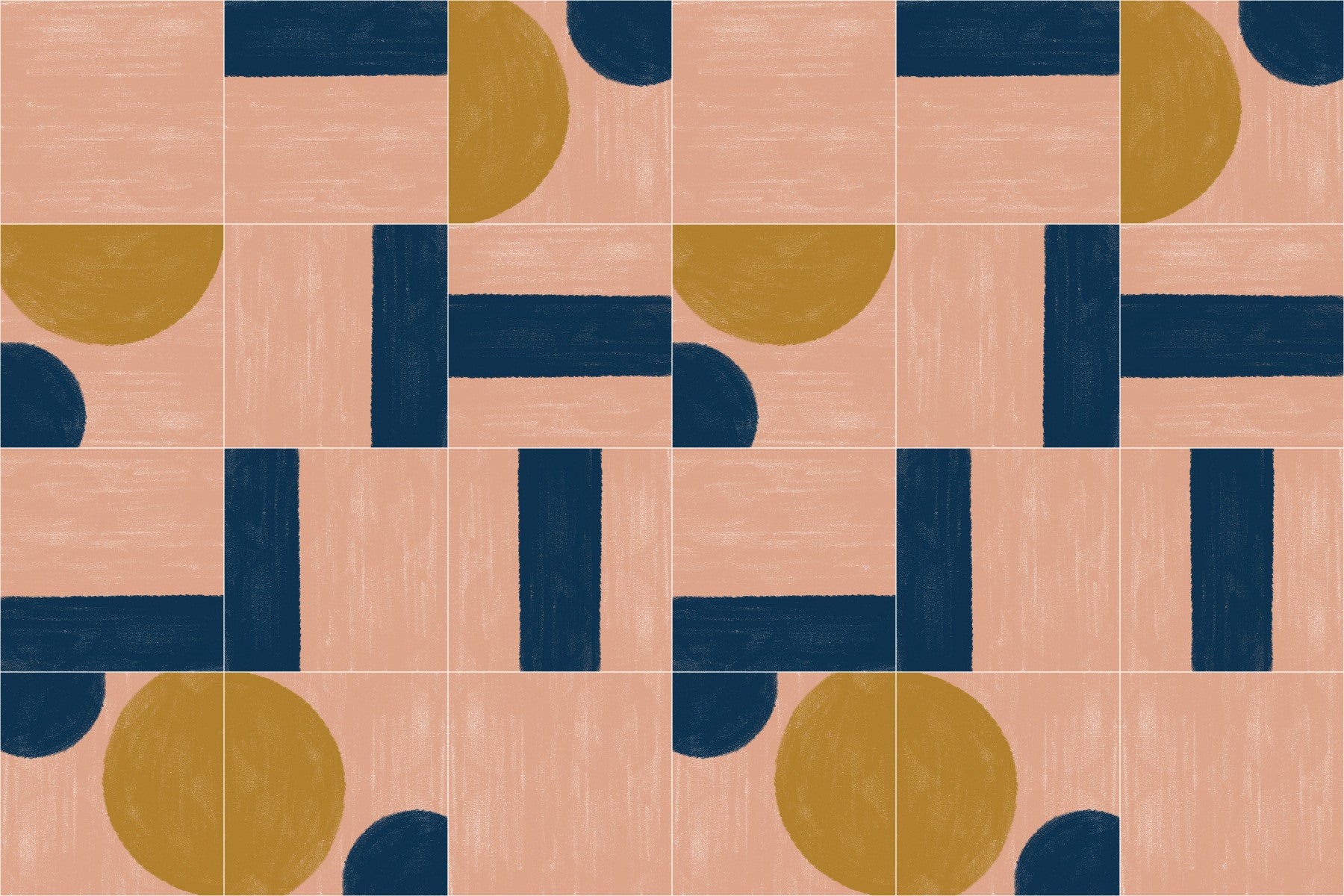 Embrace the allure of artistic expression with Painted Wall Tiles Two a visually captivating wallpaper that reimagines the traditional tiled aesthetic. This design presents a modern take on geometric harmony, featuring an intriguing arrangement of painted shapes in a delightful color palette. Warm blush backgrounds are punctuated by deep navy and golden-yellow circles and bars, evoking a sense of contemporary sophistication and playful elegance. The slightly textured, hand-painted effect adds depth and dimension, lending a unique, artisanal feel to any space. Each tile-like section contributes to the overall composition, creating a dynamic and visually engaging pattern that is both calming and stimulating. This wallpaper is perfect for adding a touch of artistic flair to bedrooms, living rooms, or even creative workspaces, bringing a sense of modern art into your everyday life. Transform your walls into a gallery of painted dreams with this striking design.