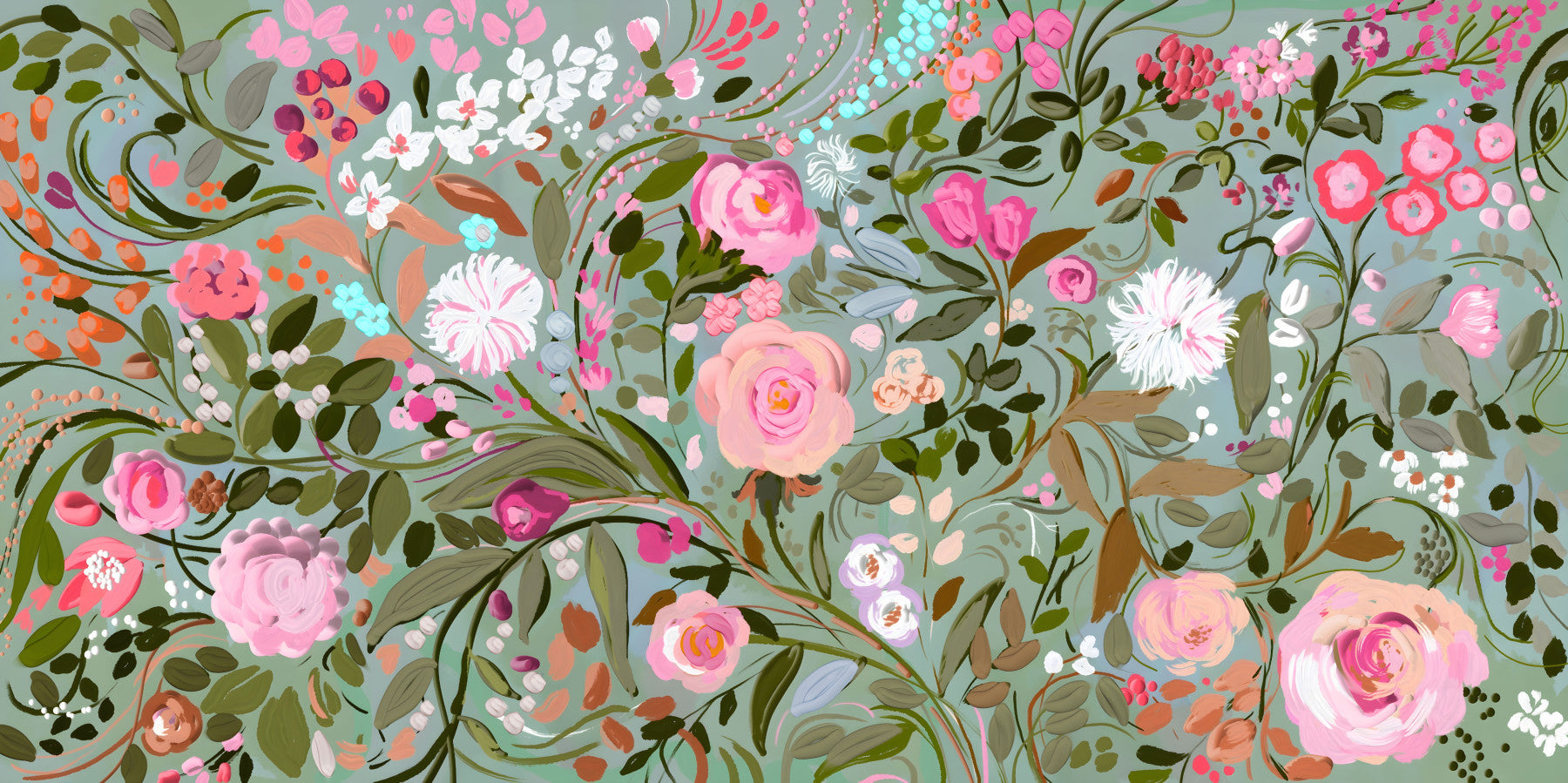 A contemplative painterly floral wallpaper mural for a feature wall.