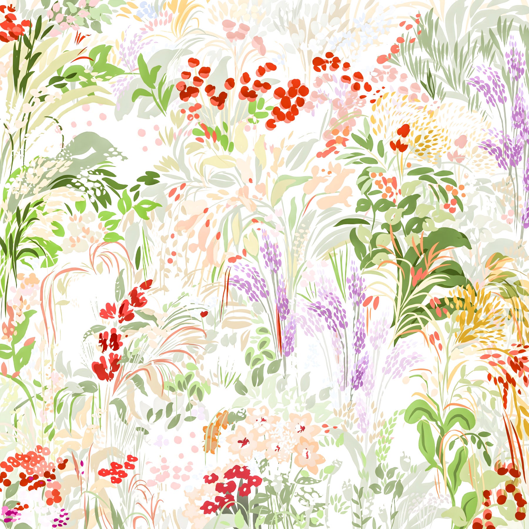 Hand-painted meadow wallpaper featuring flowing greenery and vibrant blossoms on a light background.