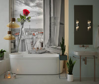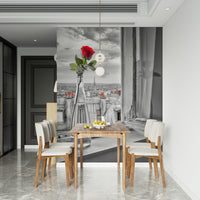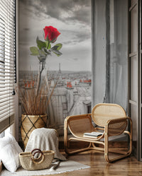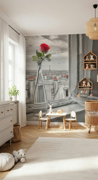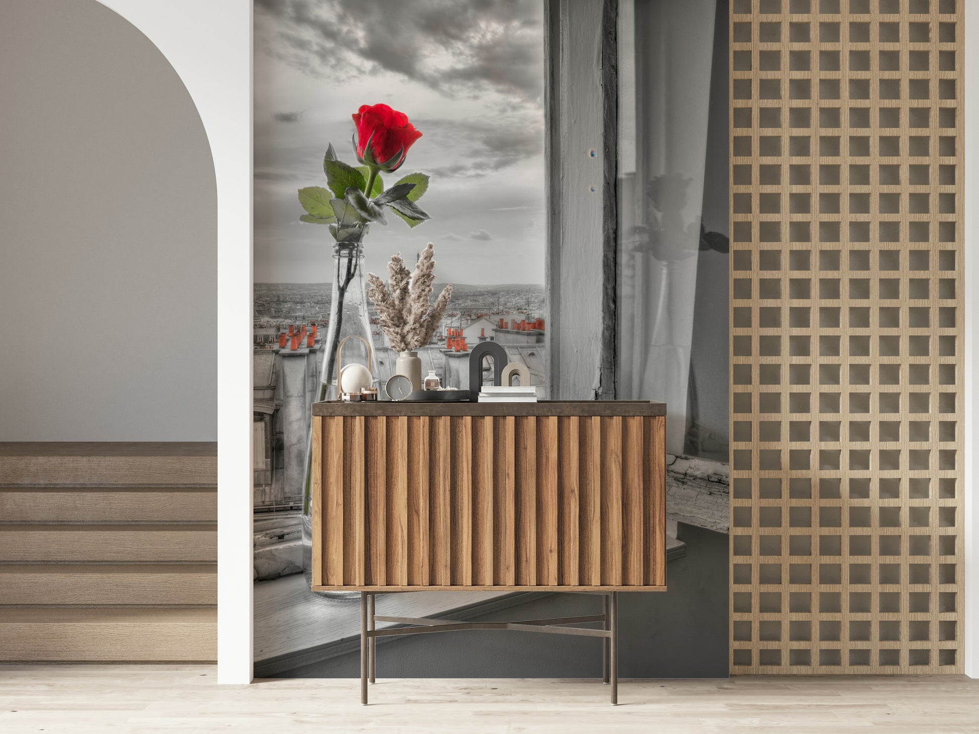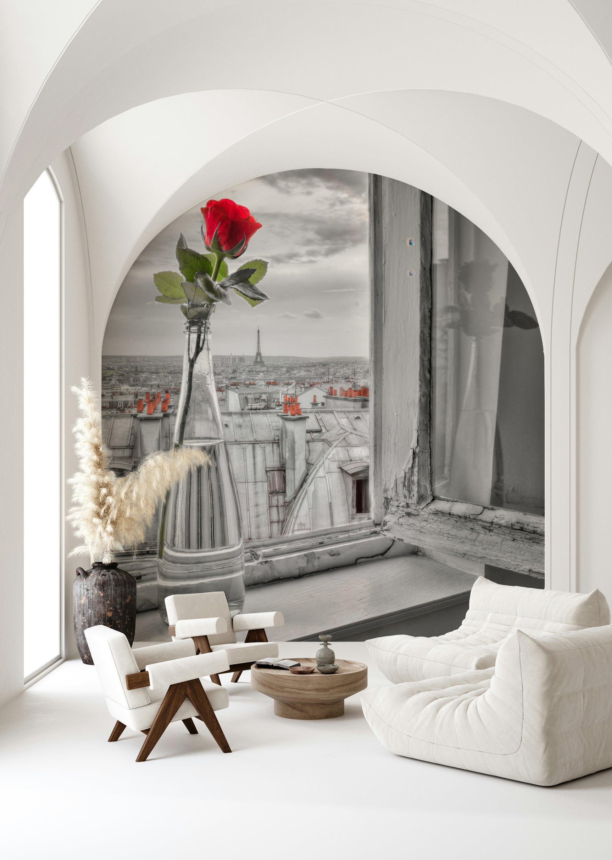 Bring a touch of Parisian charm to your home with this elegant wallpaper. A single red rose pops against the monochrome backdrop of the city skyline, with the Eiffel Tower in the distance. The distressed window frame adds a vintage feel, creating a focal point. This wallpaper for walls offers a stylish and unique scene. Its calming colors and romantic accent make it suitable for bedrooms, living rooms, or hallways. Add some French flair to your space by incorporating this wallpaper, which complements interiors with its balanced design and striking focal point.