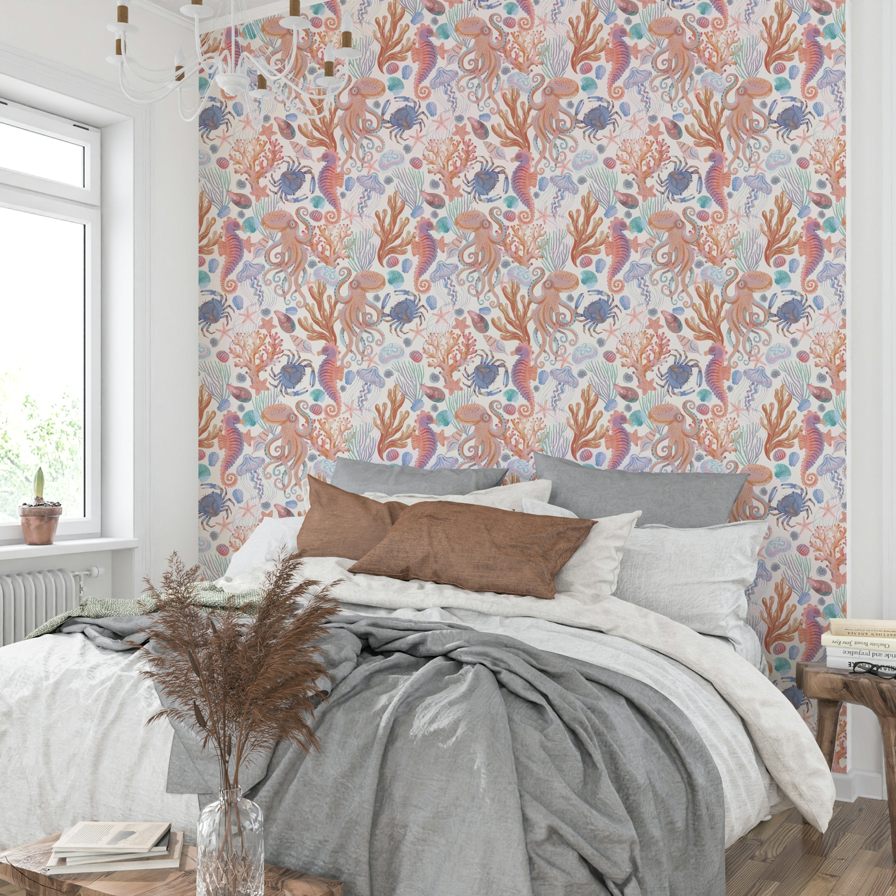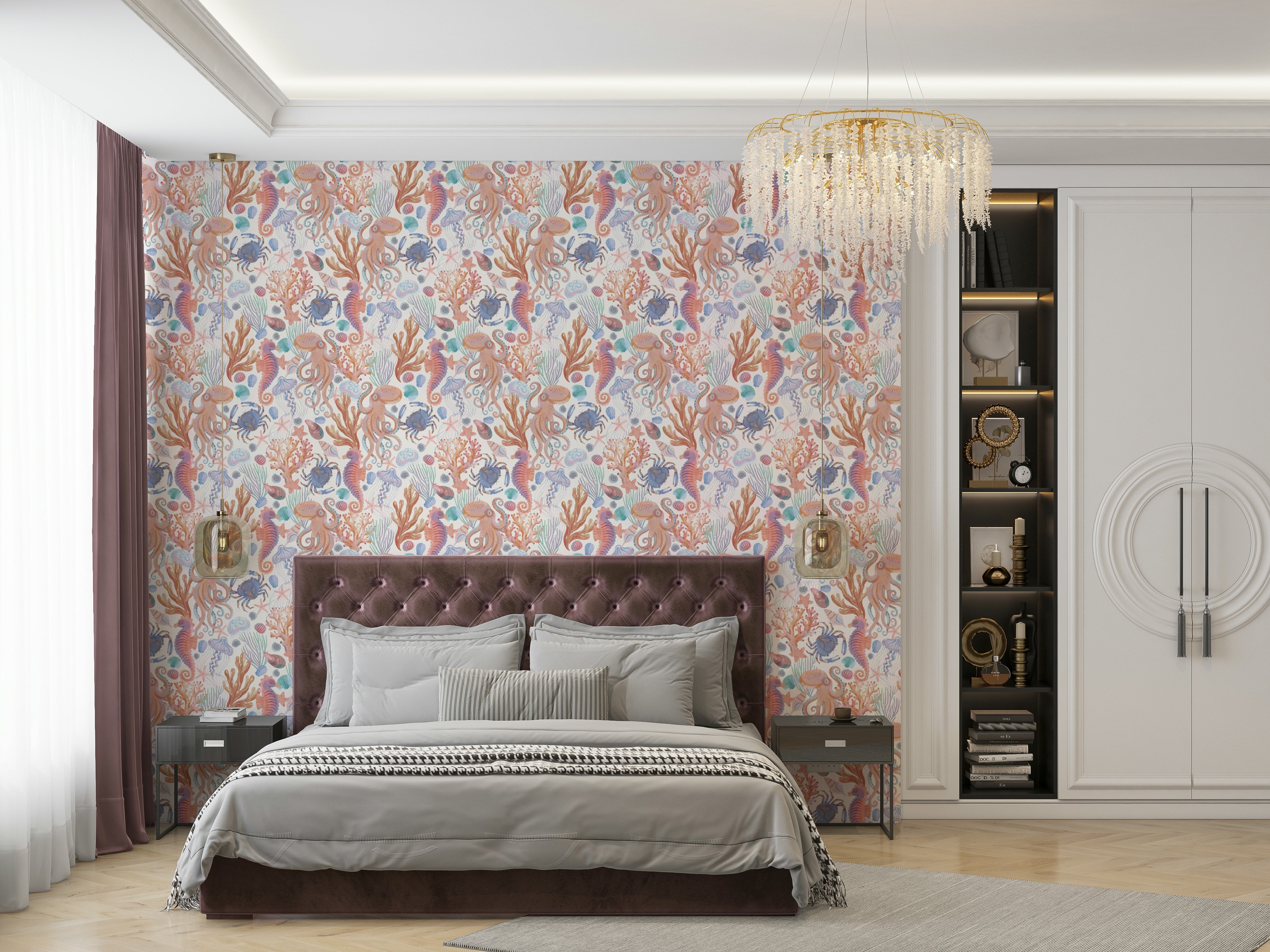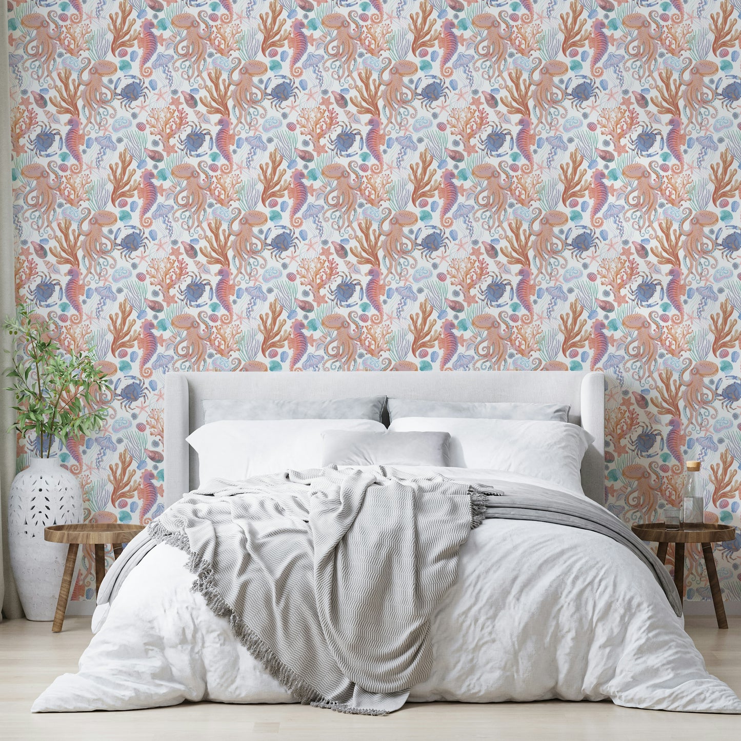 Dive into tranquility with this enchanting wallpaper. Pastel hues paint a dreamy underwater scene, featuring playful octopuses, graceful jellyfish, and charming seahorses amidst vibrant coral and seashells. The delicate watercolor style evokes a sense of calm and coastal charm, perfect for creating a serene and whimsical atmosphere in any space. This design blends the beauty of the sea with a cozy cabin aesthetic, making it ideal for bedrooms, living rooms, or home offices seeking a touch of seaside magic. The intricate details and soft color palette create a captivating and peaceful visual experience.