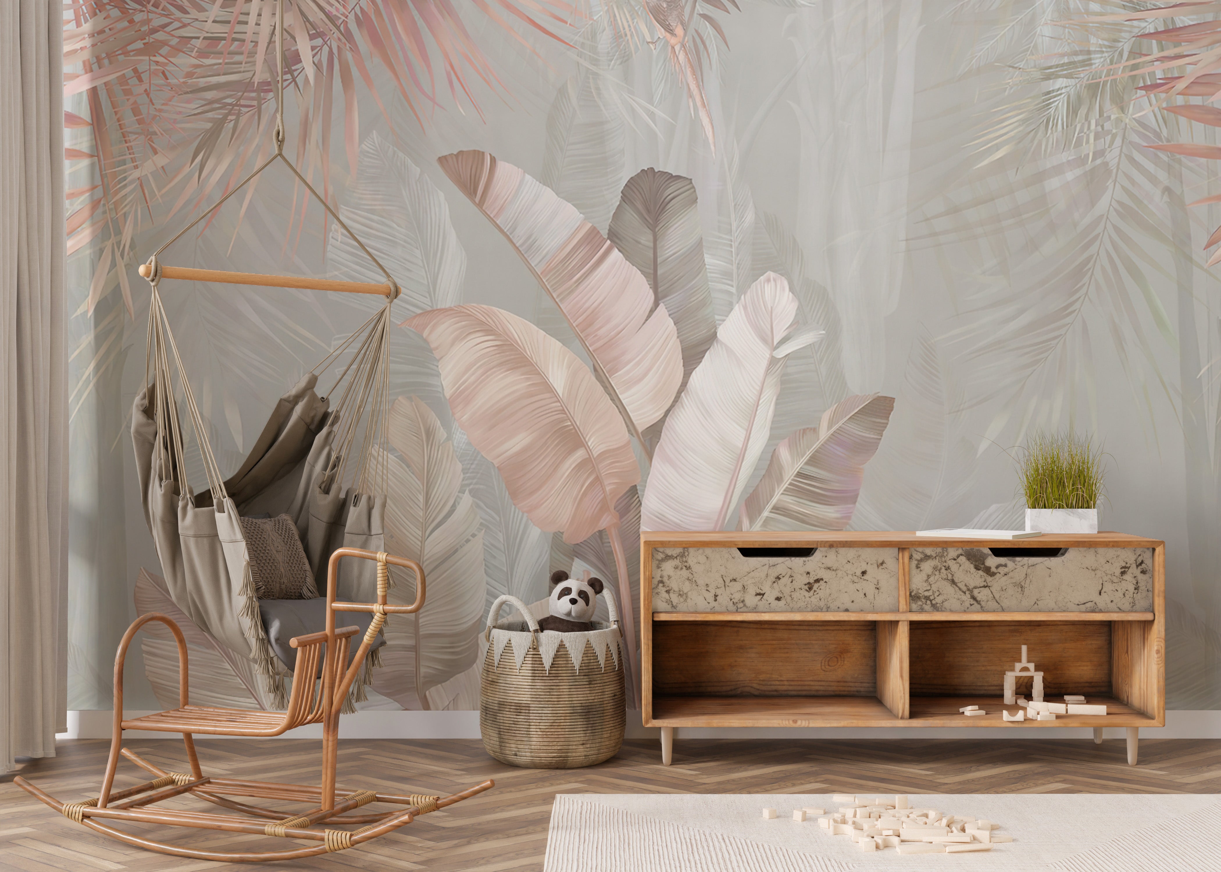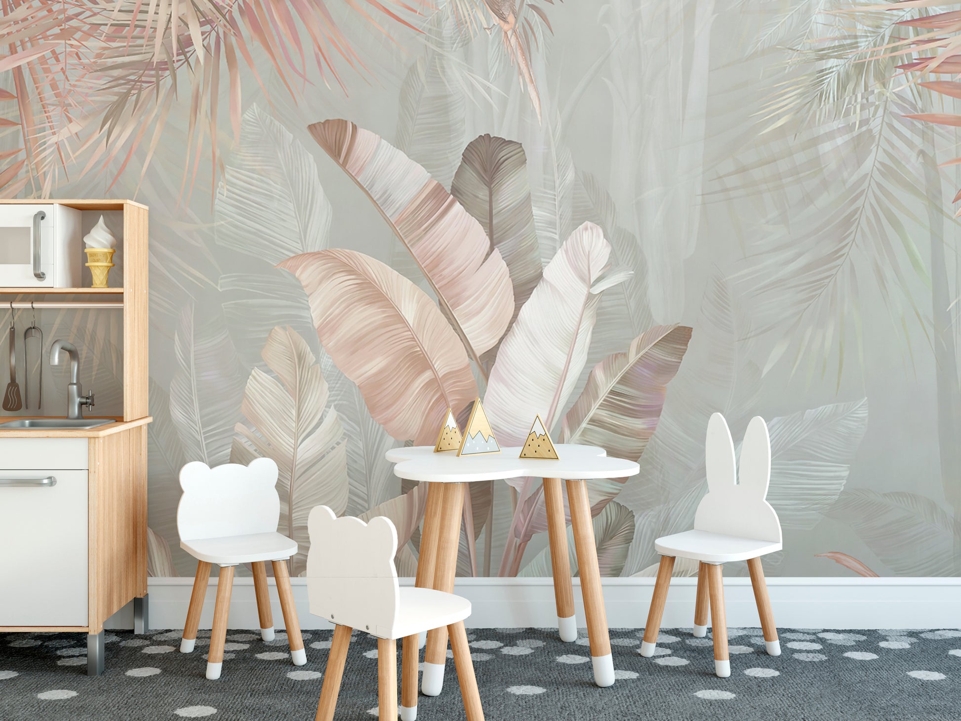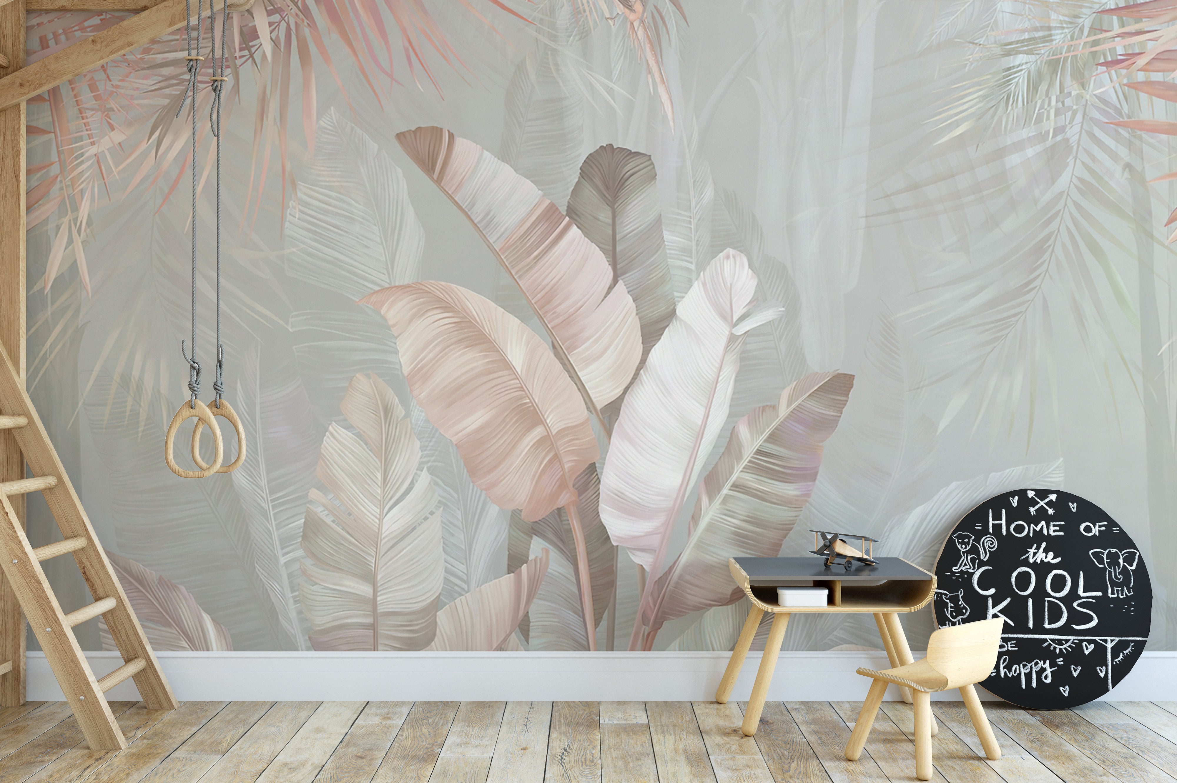Dive into a serene tropical paradise with our pastel palette tropical leaves mural wallpaper. Expertly designed to bring a touch of nature into your living space, this tropical wallpaper showcases a blend of soft pastel hues reminiscent of a tranquil beach sunset. The prominent banana leaf pattern adds depth and texture, making it a perfect statement piece for any room. Whether you're looking to transform a bedroom or uplift a living area, this banana leaf wallpaper is sure to impress. Not only does it boast rich details and calming colors, but it also serves as a versatile backdrop that complements various decor styles. Elevate the aesthetics of your interiors and let your walls speak volumes with this exquisite wallpaper for walls. Perfect for those who appreciate the beauty of nature and the allure of understated elegance.