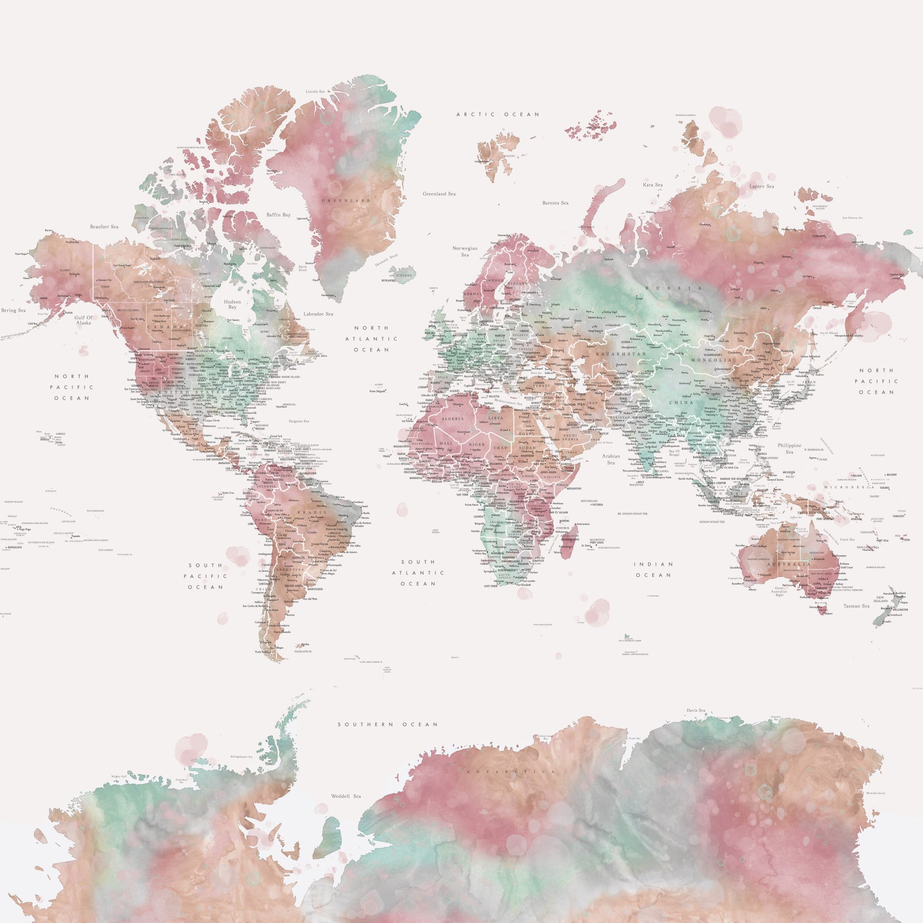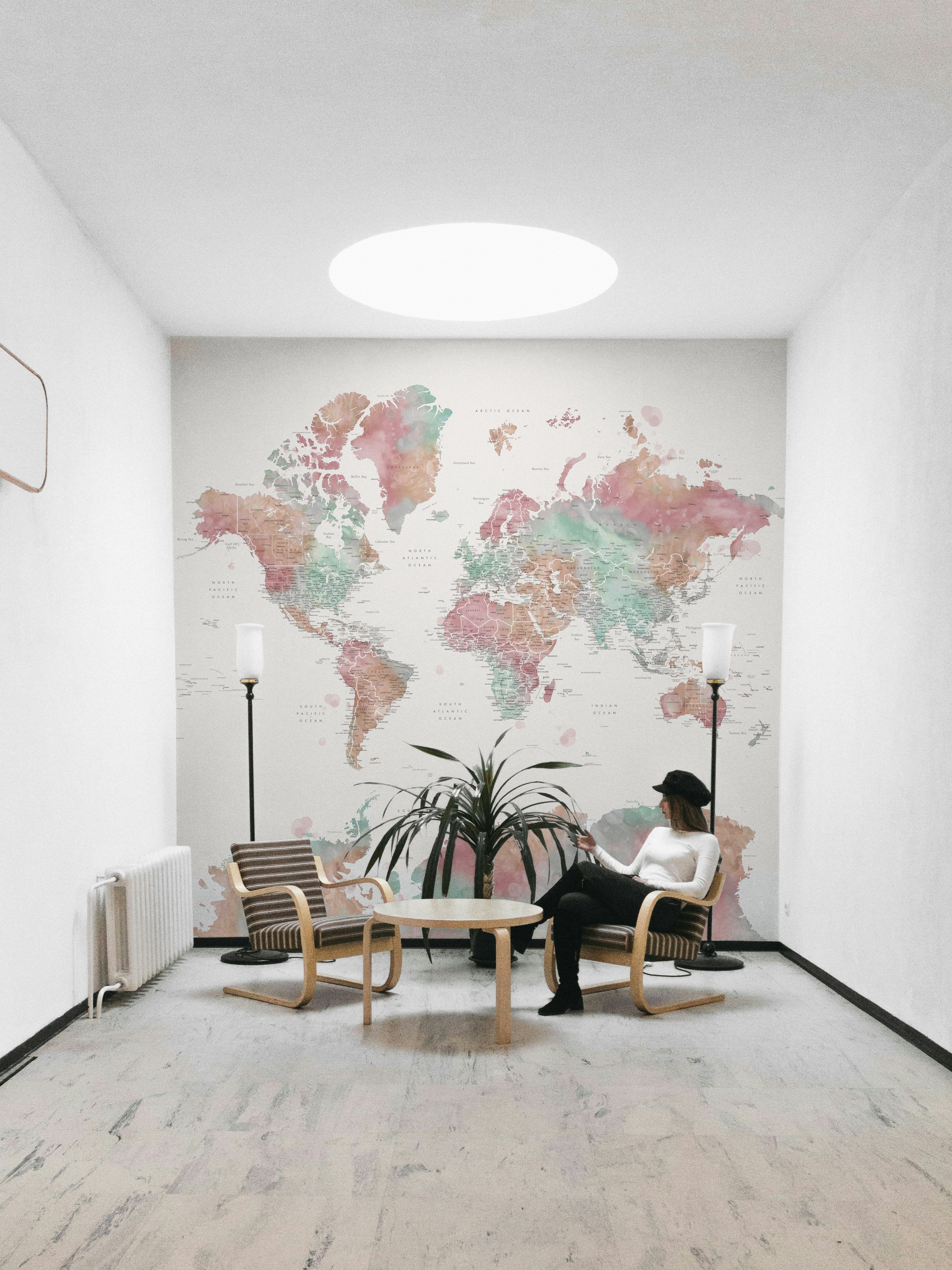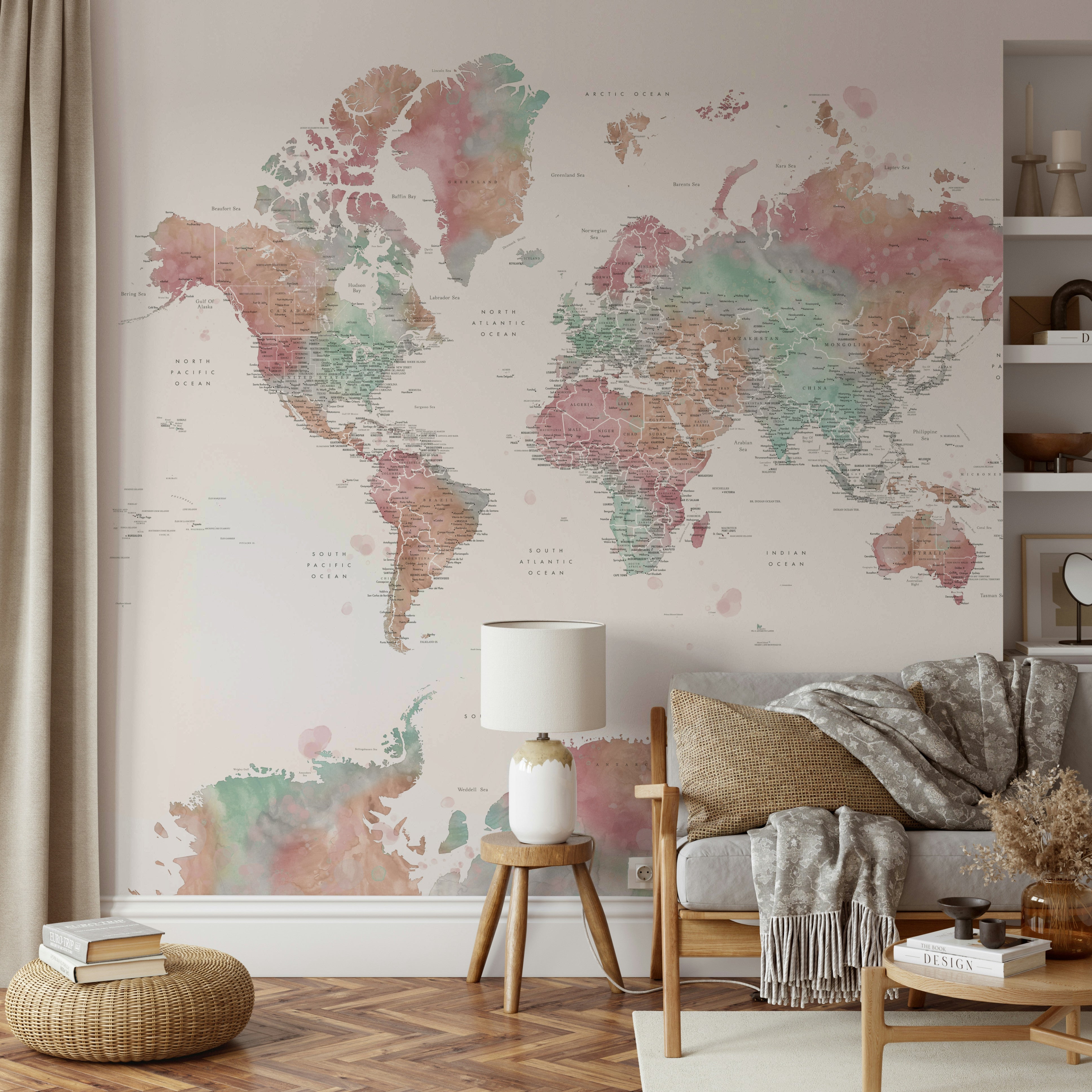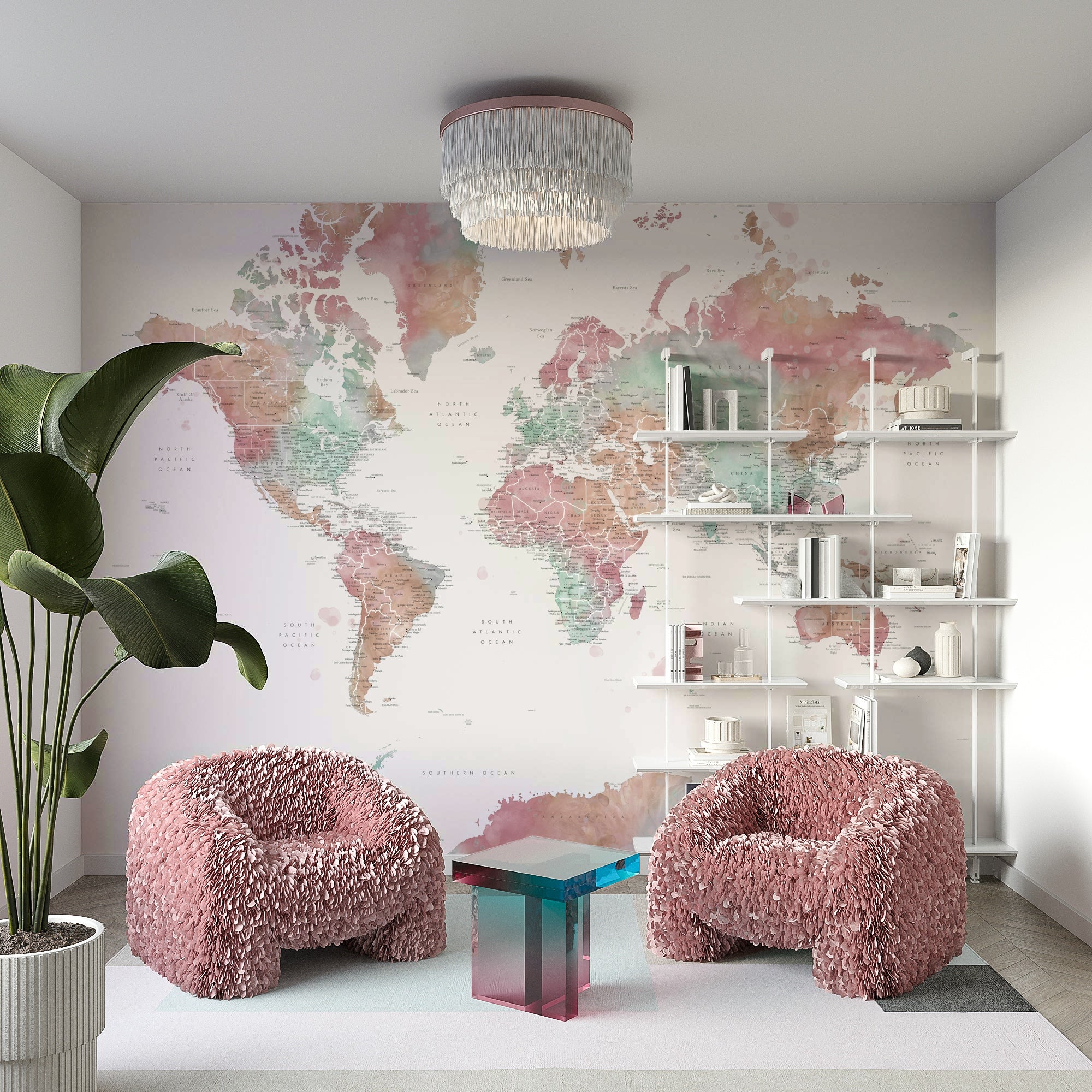 Add a dreamy touch to your space with the Pastel Watercolor World Map Wallpaper. Featuring a delicate blend of soft pinks, greens, peaches, and beige, this mural brings a calming, artistic feel to any room. Each country and city is clearly labeled, offering a perfect balance of beauty and function. Ideal for nurseries, creative workspaces, living rooms, or classrooms, it pairs beautifully with light, neutral, or boho-inspired decor. Available in peel-and-stick or traditional wallpaper styles, it's easy to apply and eco-friendly. Let your walls tell a gentle, global story with this elegant pastel map design.