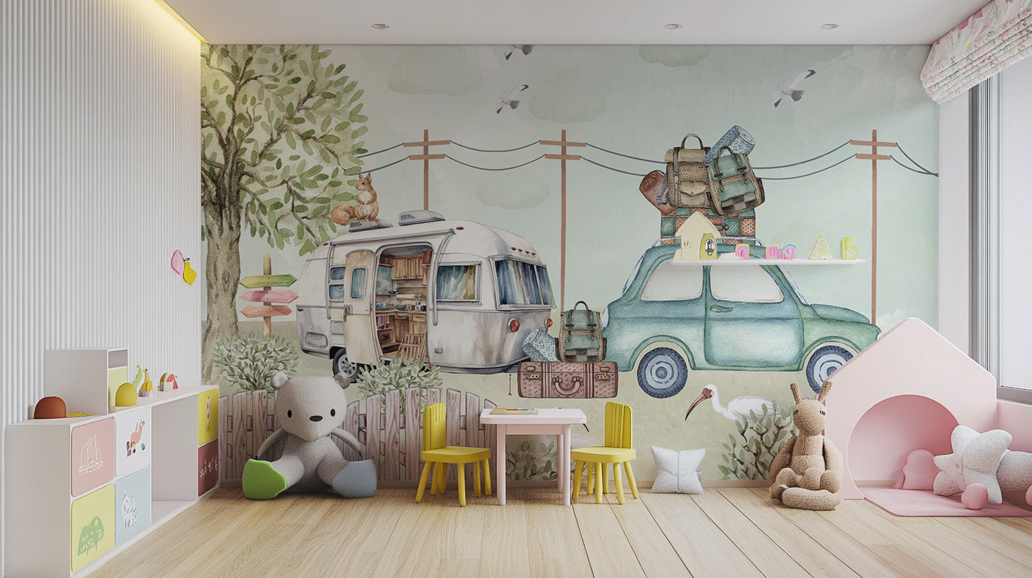 Embrace a playful adventure with the pastoral caravanning scene mural, a perfect addition to any child's bedroom. This enchanting wall art paints a picture of gentle exploration, where imagination roams free among rolling hills, cozy campers, and friendly animal companions. Crafted in soothing watercolor hues, it's a visual storybook that unfolds on your walls, inviting little ones on a whimsical journey right from their room. Ideal for creating a nurturing environment that fosters curiosity and joy, this kids room wallpaper serves as a backdrop for countless tales of adventure. Let the narratives of outdoor escapades spark creativity during playtime and usher in sweet dreams at night, making every moment in your child's room a cherished memory in the making.