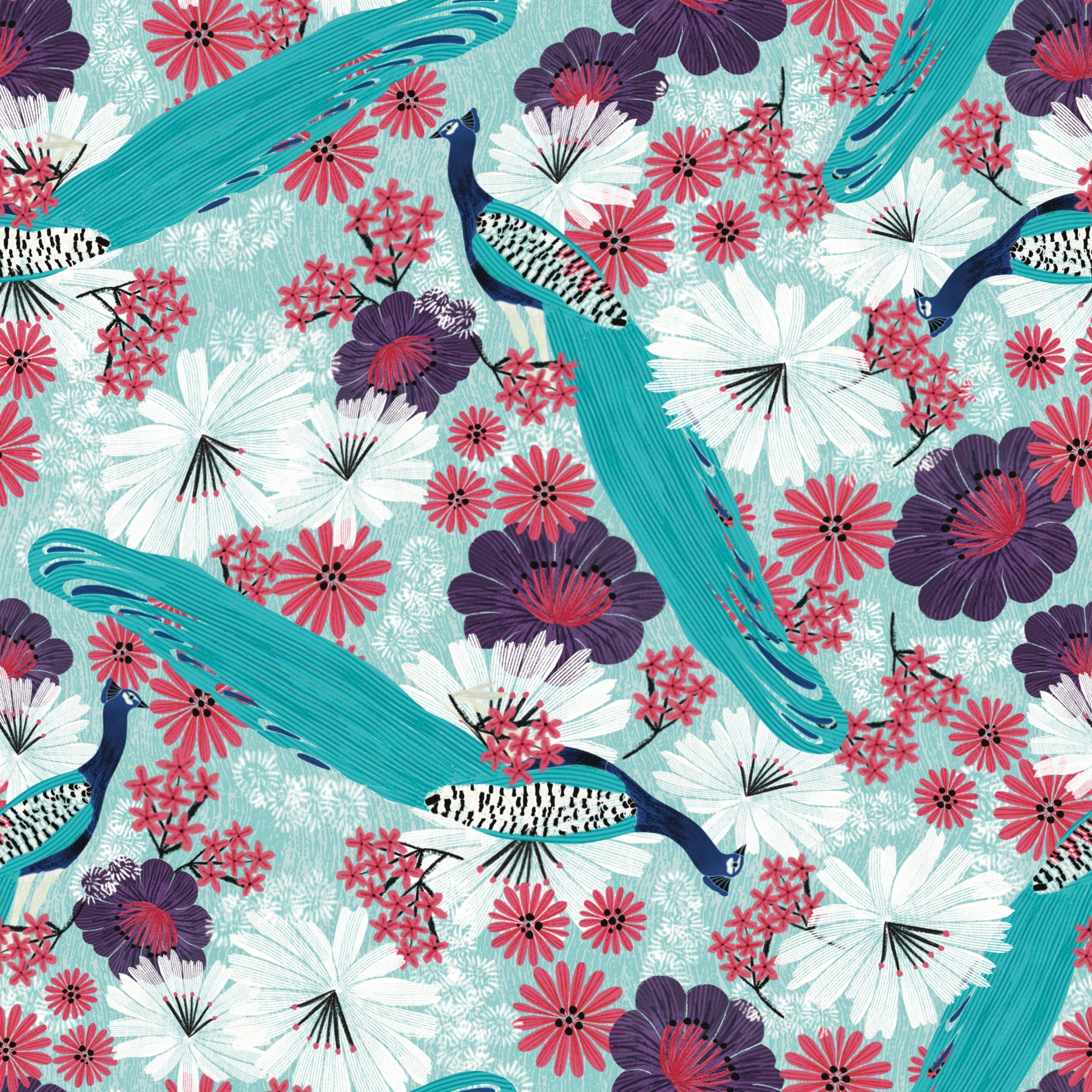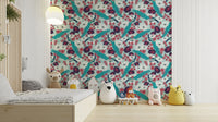 Stroll through a vibrant garden with Peacock Promenade - Blue a wallpaper that blends elegance with whimsical charm. This delightful design features majestic peacocks gracefully interspersed amongst a profusion of stylized flowers. A calming blue backdrop sets the stage for a stunning display of white, pink and purple blossoms, creating a cheerful and captivating atmosphere. The striking turquoise tail feathers add a pop of color and a touch of artistry to the design. The stylized patterns and brushstroke textures provide depth and a contemporary aesthetic. Bring a touch of sophisticated nature into your space with this charming and visually rich design – perfect for creating a serene yet stylish environment.