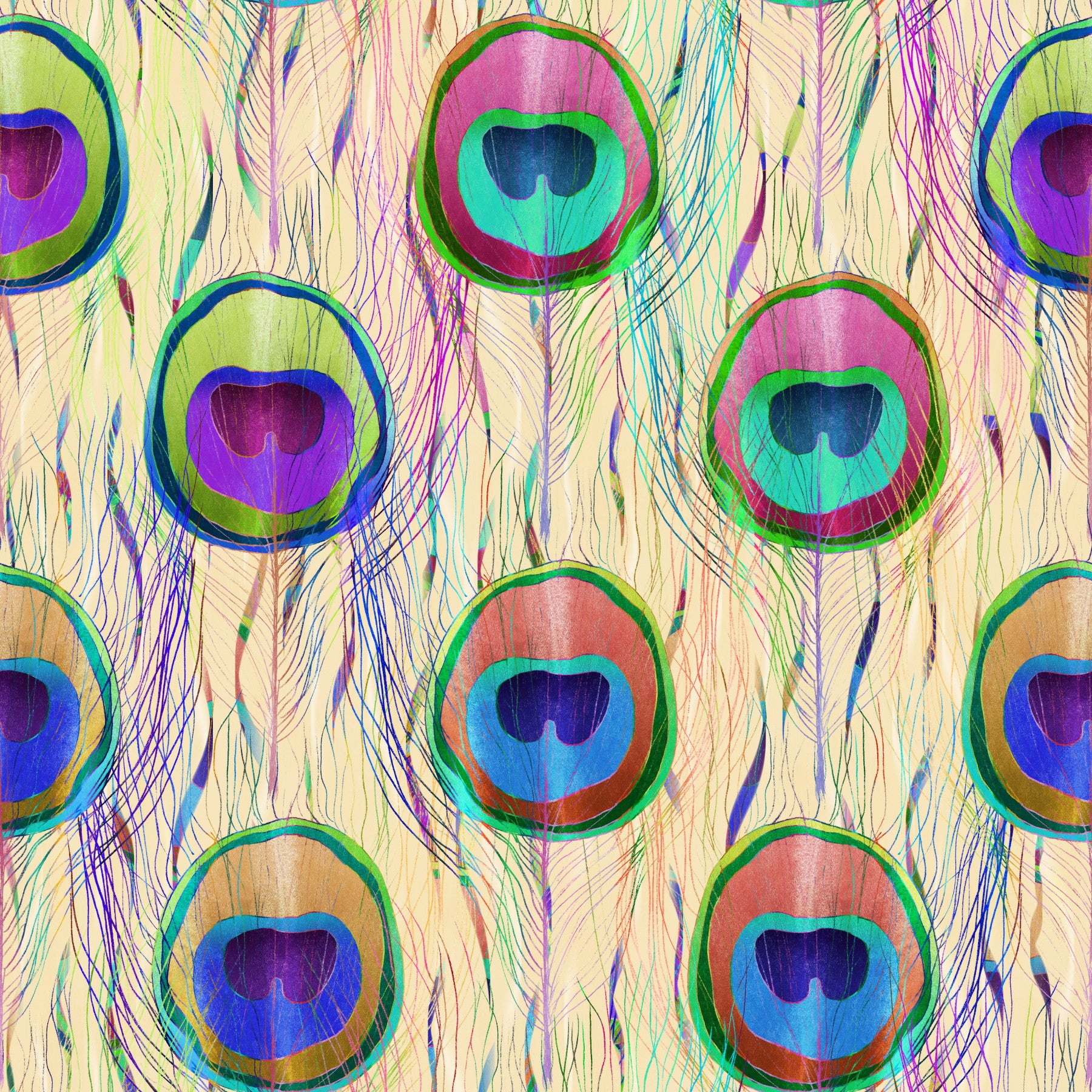 A repeating pattern of colorful peacock feathers.