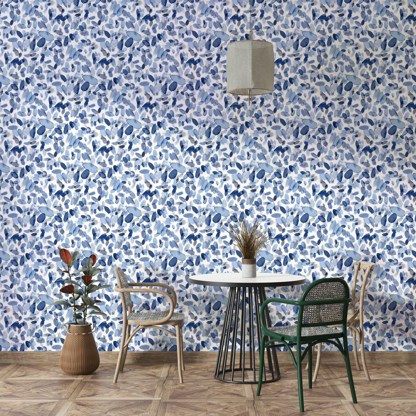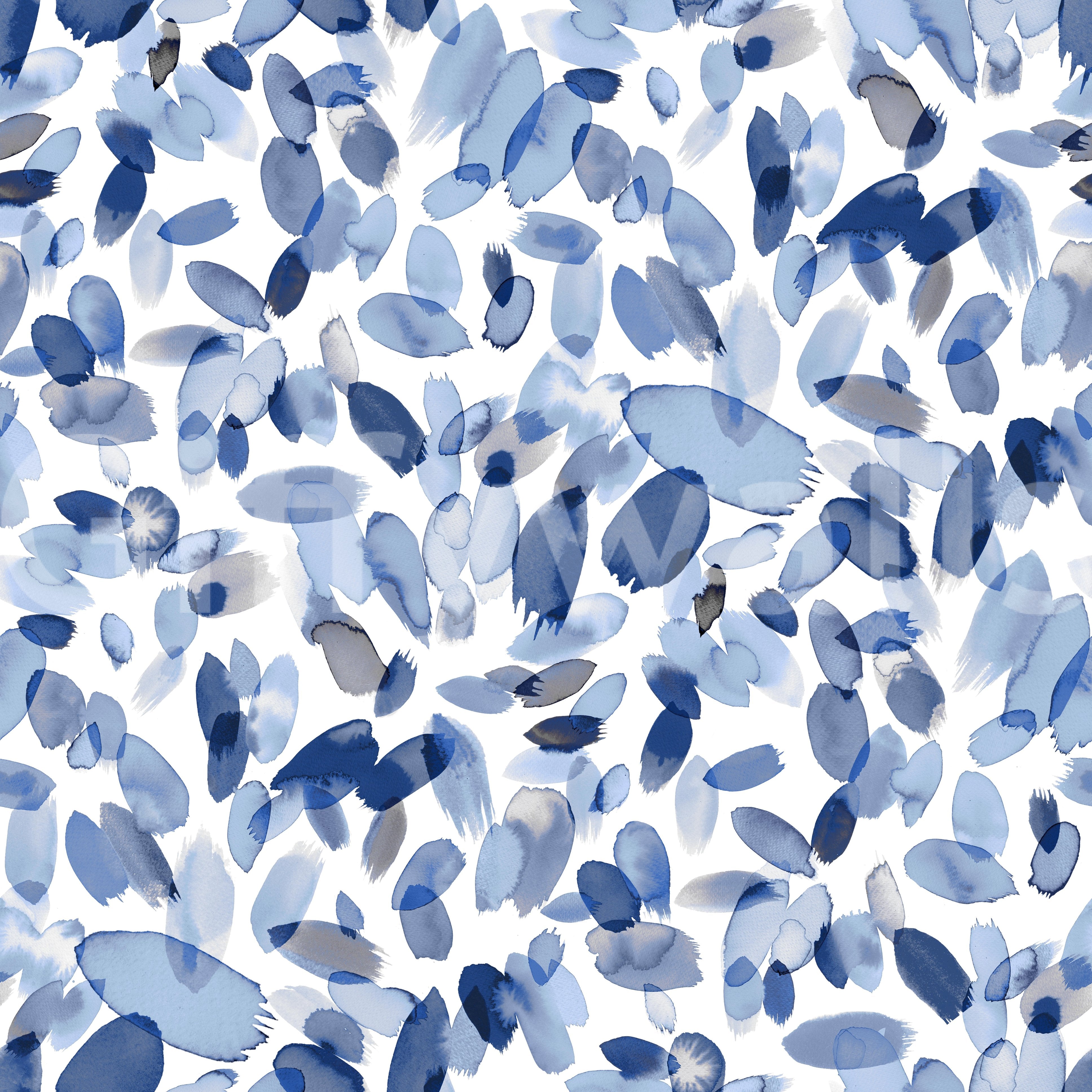 Dive into a serene world of abstract artistry with this 'Petal Watercolor Stains Abstract' wallpaper. Delicate, blue watercolor petals, rendered in shades ranging from soft sky blue to deep indigo, dance across a crisp white background. The organic shapes and soft, slightly blurred edges create a calming, ethereal mood, perfect for a space seeking tranquility and understated elegance. This design offers a sophisticated blend of texture and fluidity, making it ideal for modern and minimalist interiors. The scattered petal motif adds a touch of whimsical charm without overwhelming the overall peaceful ambiance.