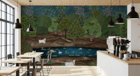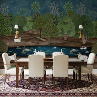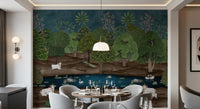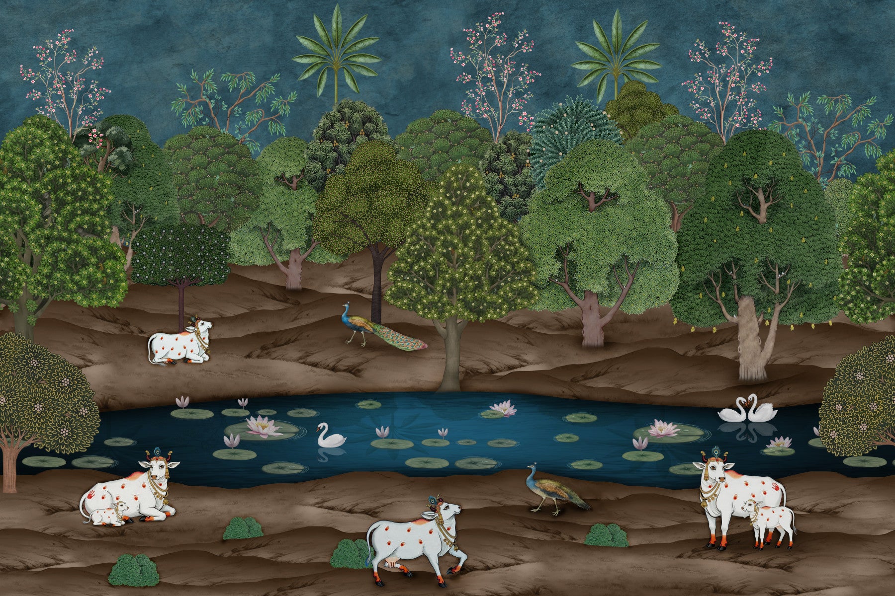 Transform your living space with this exquisite Pichwai-inspired wallpaper for walls. It showcases a lush, stylized forest scene in rich greens and earthy browns, under a deep teal sky. Sacred cows adorned with delicate handprints and ornate jewelry, serene swans, and majestic peacocks inhabit this tranquil landscape. Pink lotus blossoms float gracefully on a calm blue pond. This traditional Indian art style brings an air of serenity and opulence to any room. Ideal for living rooms, dining areas, or studies, the intricate details and vibrant yet harmonious color palette create a captivating feature wall. It invites peaceful reflection and adds unique cultural elegance to your interior design.