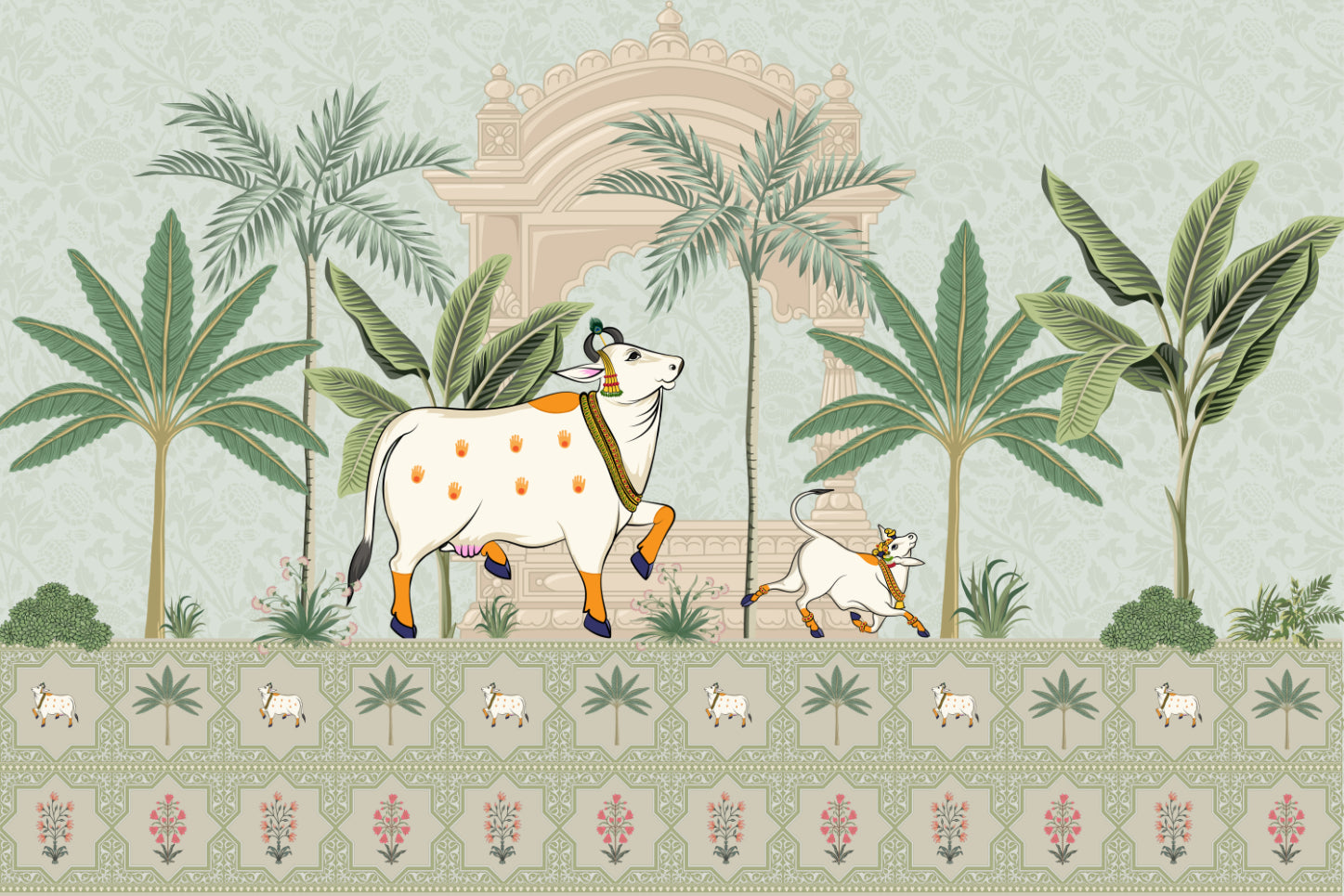 Bring cultural elegance to any setting with this Pichwai Sacred Cow Wallpaper Mural. Inspired by traditional Indian heritage, this design features sacred cows adorned with intricate patterns, lush palm trees and a royal palace backdrop. The soft pastel green tones create a vintage aesthetic that adds depth and character. Crafted with Pichwai painting influences, it reflects spiritual richness and timeless charm. Ideal for living rooms, meditation spaces, and heritage interiors, this Indian palace wallpaper blends beautifully with classic and modern themes. Enhance walls with this traditional Indian wall art, capturing the essence of sacred beauty.