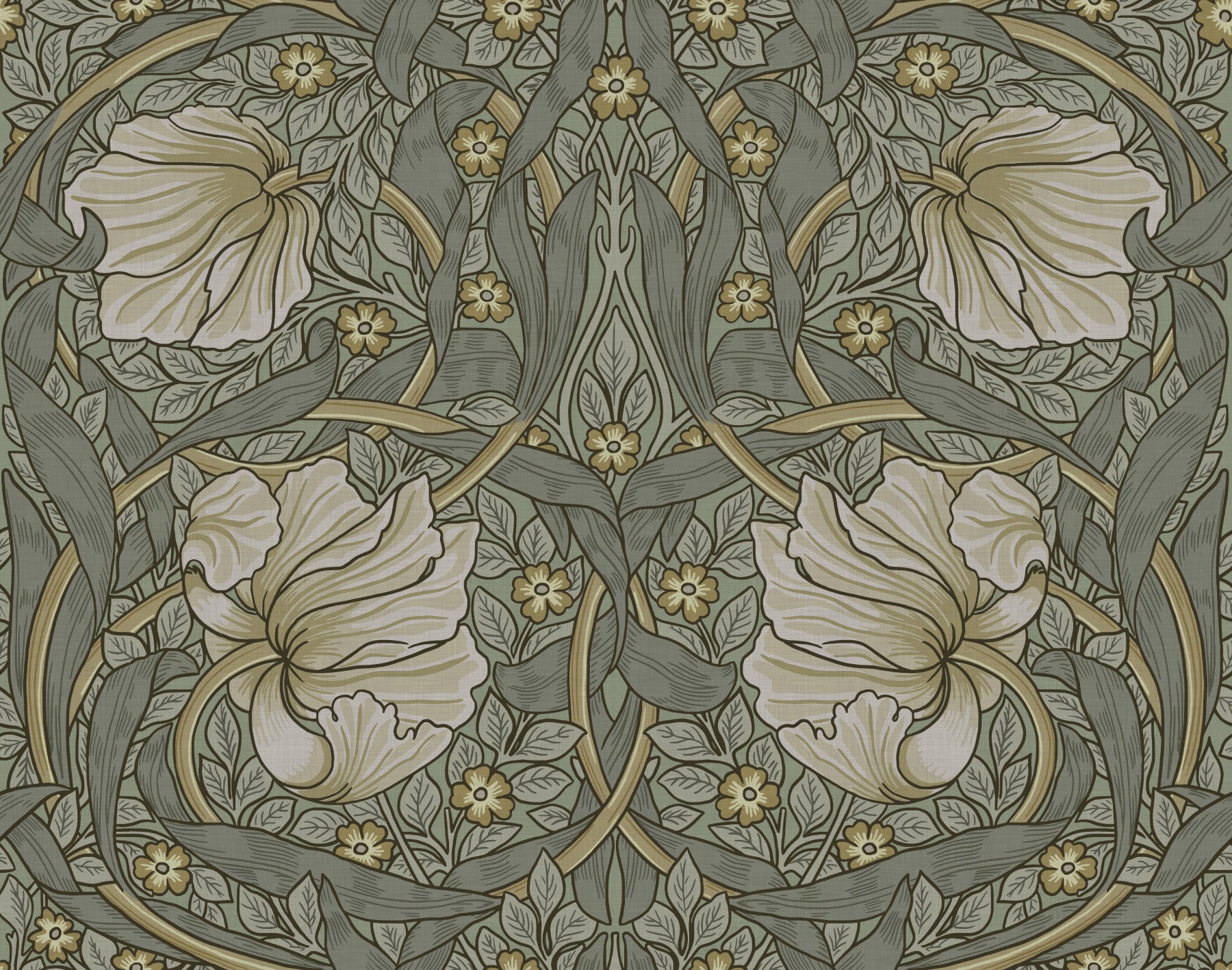 Indulge in the timeless elegance of 'Pimpernel by William Morris 1'. This wallpaper showcases a captivating tapestry of stylized pimpernel flowers and lush foliage, rendered in a sophisticated palette of sage greens and muted golds. The intricate, flowing lines and art nouveau-inspired design create a sense of serene sophistication, reminiscent of William Morris's masterful botanical artistry. A perfect blend of classic and contemporary, this wallpaper adds a touch of refined beauty to any space, evoking a feeling of calm and tranquility. The subtle texture adds depth, making it a luxurious choice for bedrooms, living rooms, or any area requiring an air of understated elegance.