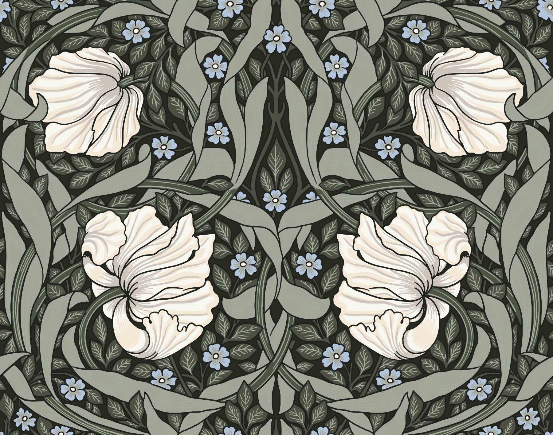Indulge in the timeless elegance of "Pimpernel by William Morris 17." This wallpaper showcases a captivating tapestry of stylized off-white blossoms, reminiscent of delicate pimpernels, nestled amongst lush, flowing green foliage and scattered petite blue flowers. The intricate Art Nouveau design creates a sense of serene sophistication, blending organic forms with elegant, swirling lines. A dark, moody background enhances the creamy flower details, offering a calming and sophisticated aesthetic perfect for adding a touch of classic beauty to any space. The meticulously detailed botanicals evoke a sense of quietude and natural grace, making it an ideal choice for a bedroom, study, or living area seeking a touch of refined vintage charm.