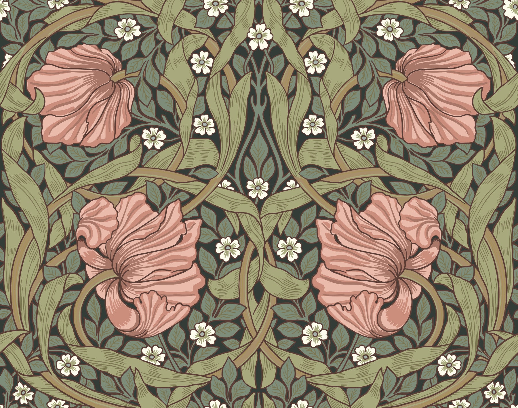 Indulge in the timeless elegance of "Pimpernel by William Morris 26." This captivating wallpaper showcases a mesmerizing tapestry of blush-pink pimpernel blossoms intertwined with lush, stylized foliage in muted greens and browns. The intricate, Art Nouveau-inspired design features a symmetrical arrangement, creating a sense of balanced harmony. Delicate white flowers punctuate the scene, adding a touch of ethereal beauty to the rich, dark background. This wallpaper evokes a sense of serene sophistication, perfect for adding a touch of classic beauty to any space. The detailed linework and elegant color palette make it a versatile choice for both traditional and modern interiors.