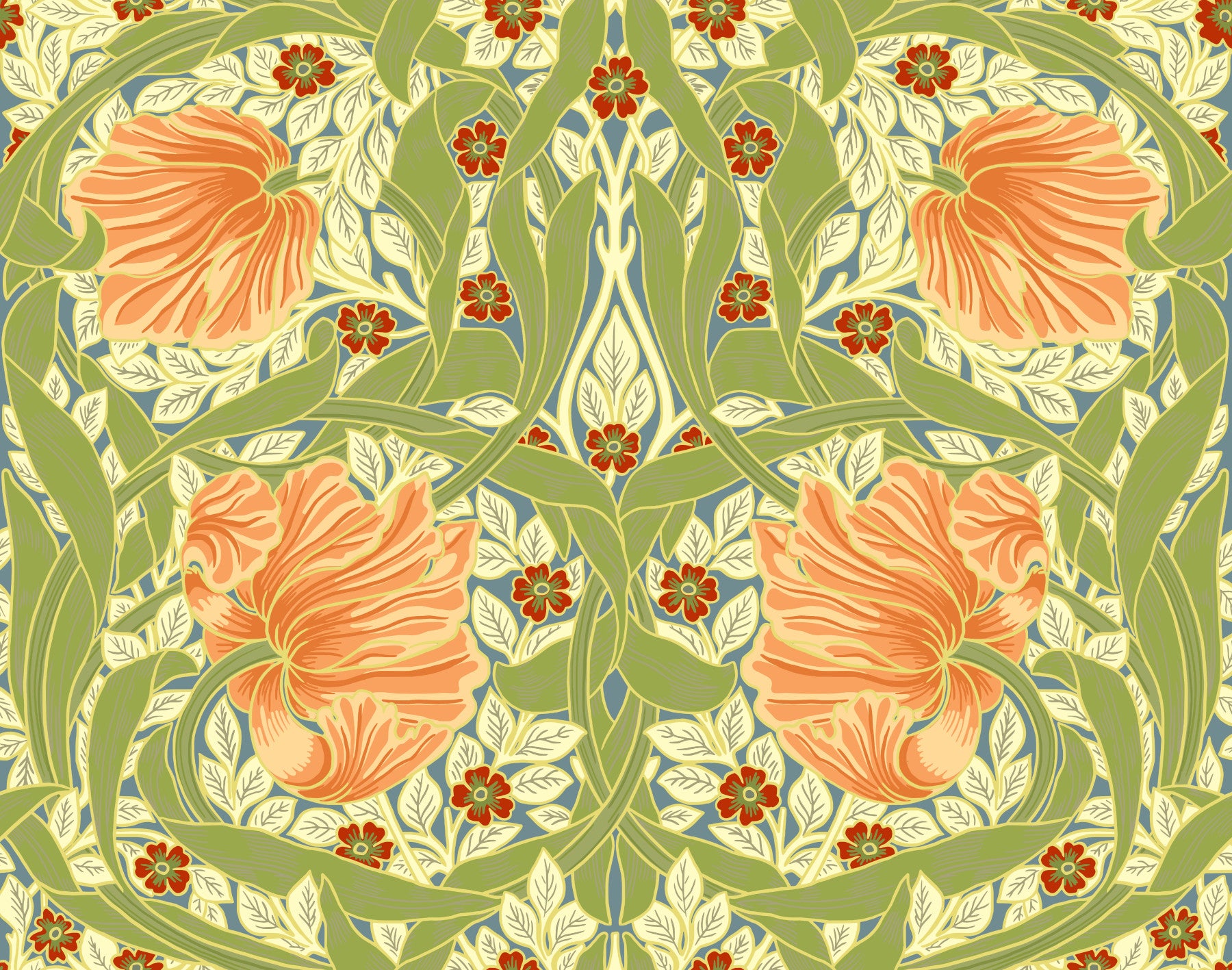 Immerse yourself in the timeless elegance of "Pimpernel by William Morris 8." This wallpaper showcases a breathtaking tapestry of stylized peach-toned blossoms, meticulously interwoven with verdant leaves and delicate crimson flowers against a muted blue-green backdrop. The design's intricate detailing and symmetrical composition evoke the rich artistry of the Arts and Crafts movement, creating a harmonious and sophisticated atmosphere. Perfect for adding a touch of classic beauty to any space, this wallpaper beautifully captures the spirit of William Morris's iconic floral designs, offering a refined and calming ambiance.