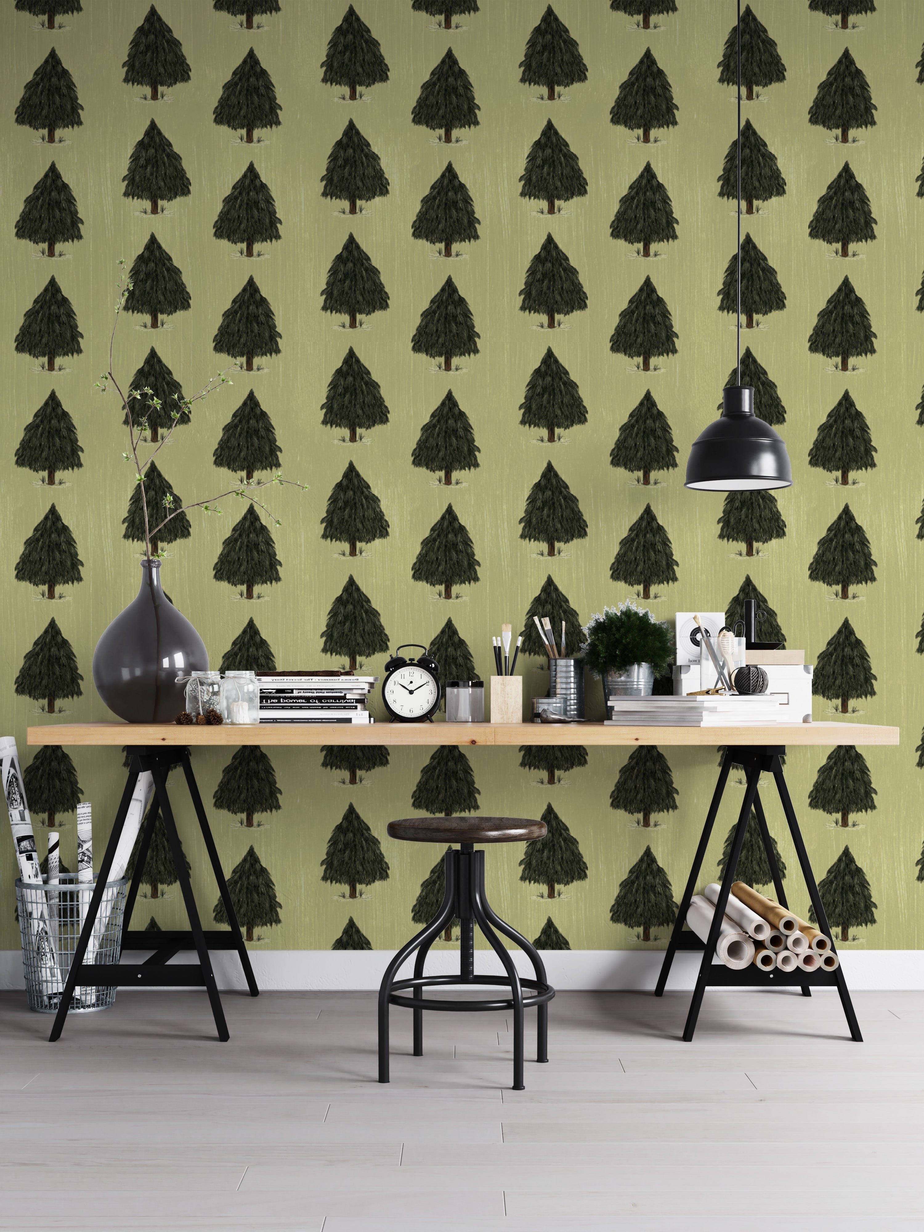 Nature-inspired green pine tree wallpaper for fresh and calming decor.