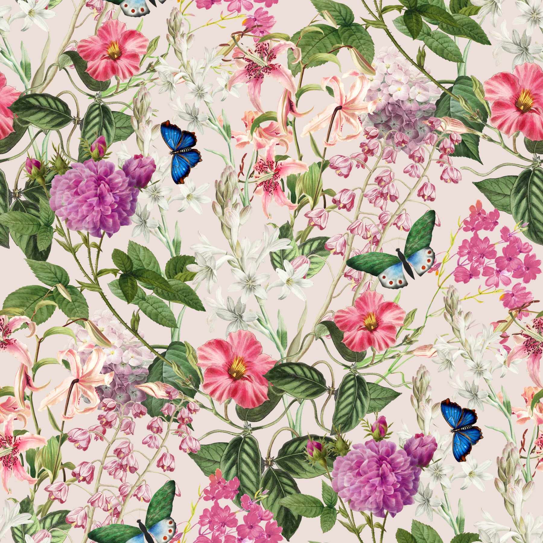 Bring the beauty of an English garden into your home with this delightful floral design. Featuring a symphony of pink, purple, and white flowers, intertwined with vibrant green leaves and fluttering butterflies, this wallpaper infuses spaces with nature's charm. The soft color palette adds a touch of elegance to bedrooms, living rooms, or hallways. Transform your home's atmosphere with this stunning floral artwork. Consider this elegant wallpaper for walls to create a warm and inviting space.