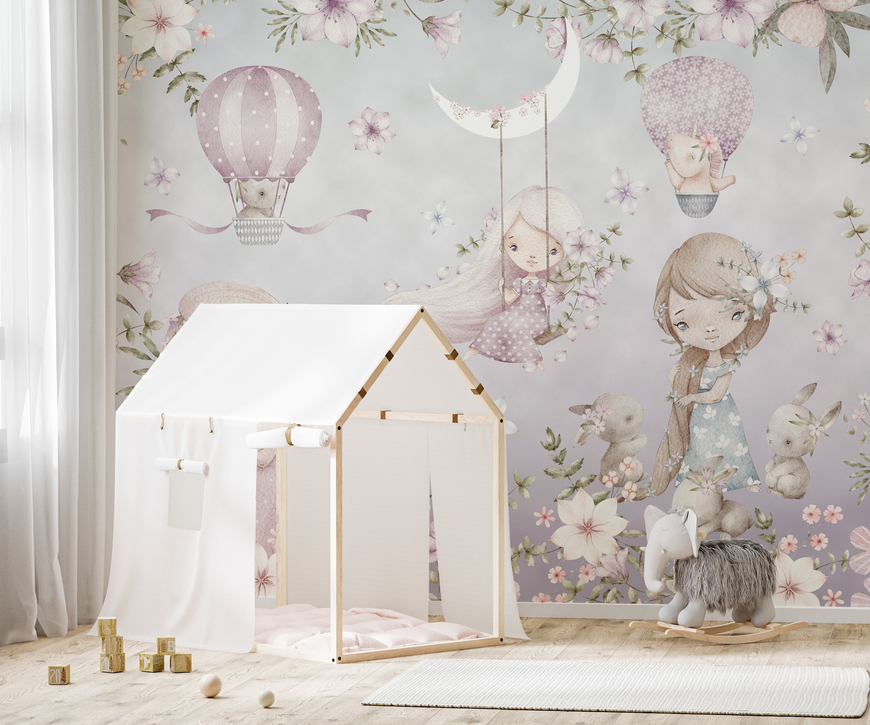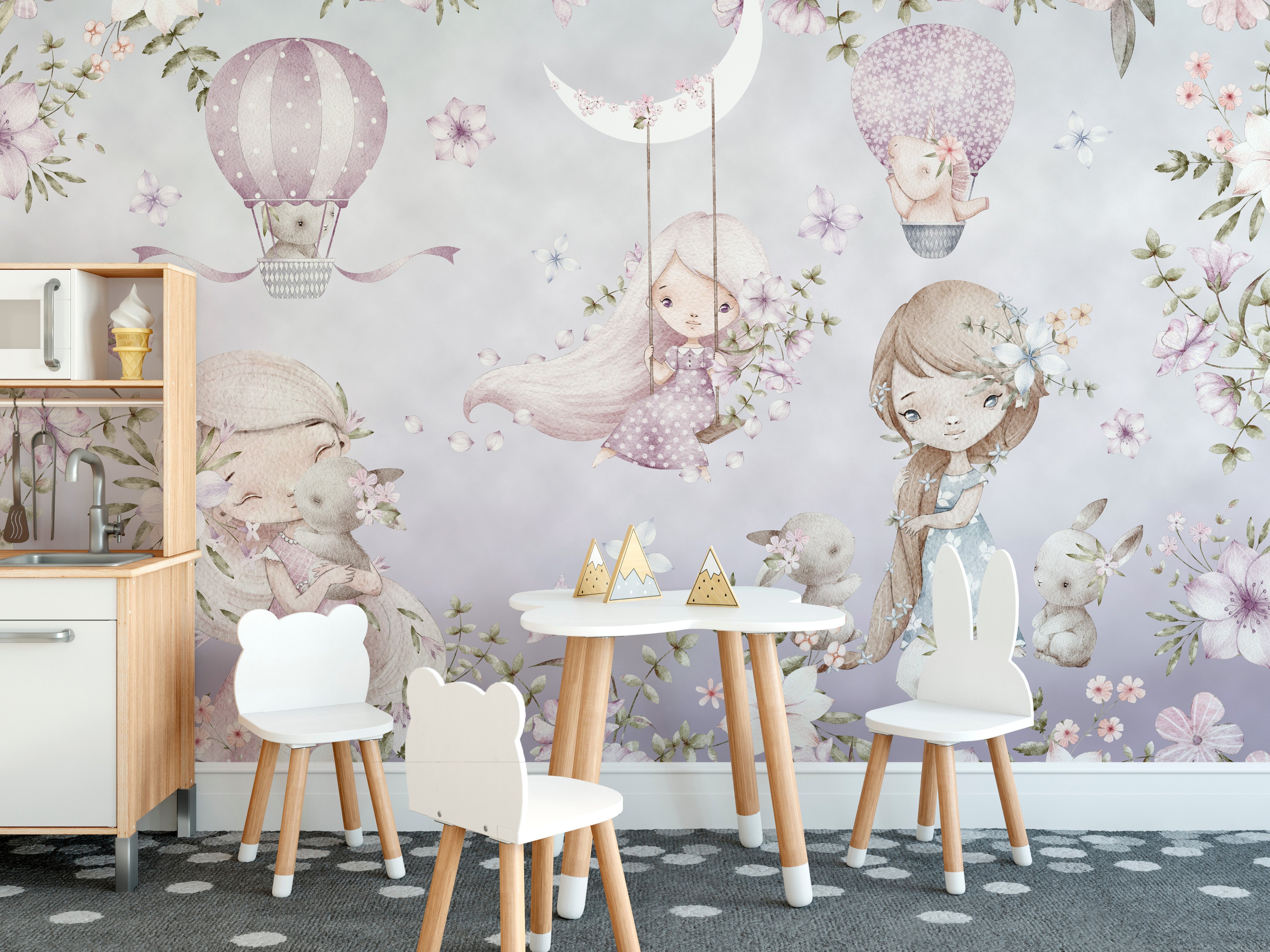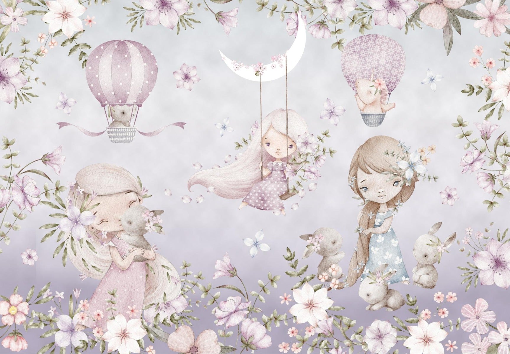 Add magic to your child's room with the pink garden wallpaper mural an imaginary yet natural blend. This mural feature soft pastel tones, delicate floral patterns, dreamy characters flying on hot air balloons, and a crescent moon that adds magic to any nursery or playroom. This quiet, imaginative space is perfect for encouraging creativity with its peaceful design. It also evokes the spirit of coziness and playing due to its ease of application and ideal suitability for childrens rooms. Perfect for a nursery or a refreshing update of a playroom or kids room with our pink garden wallpaper mural. Order now and make your child's dream room real!