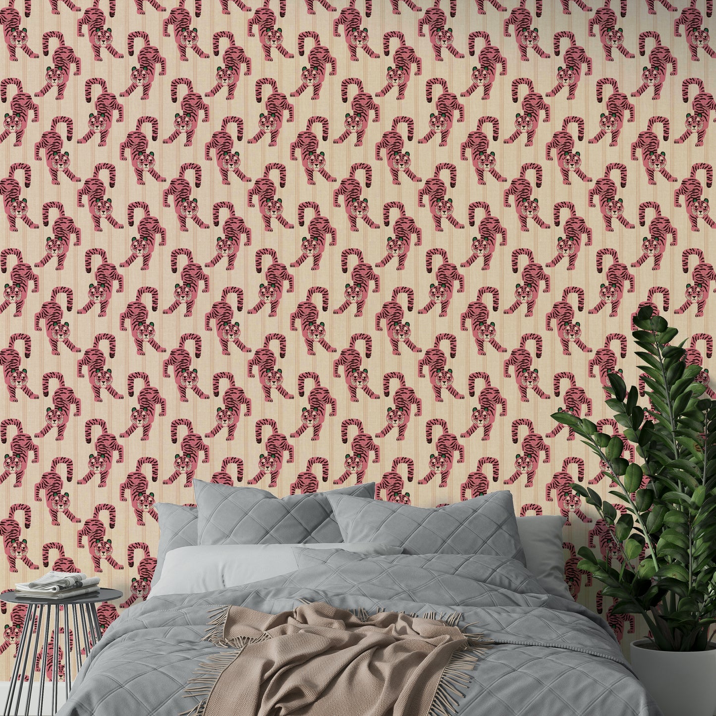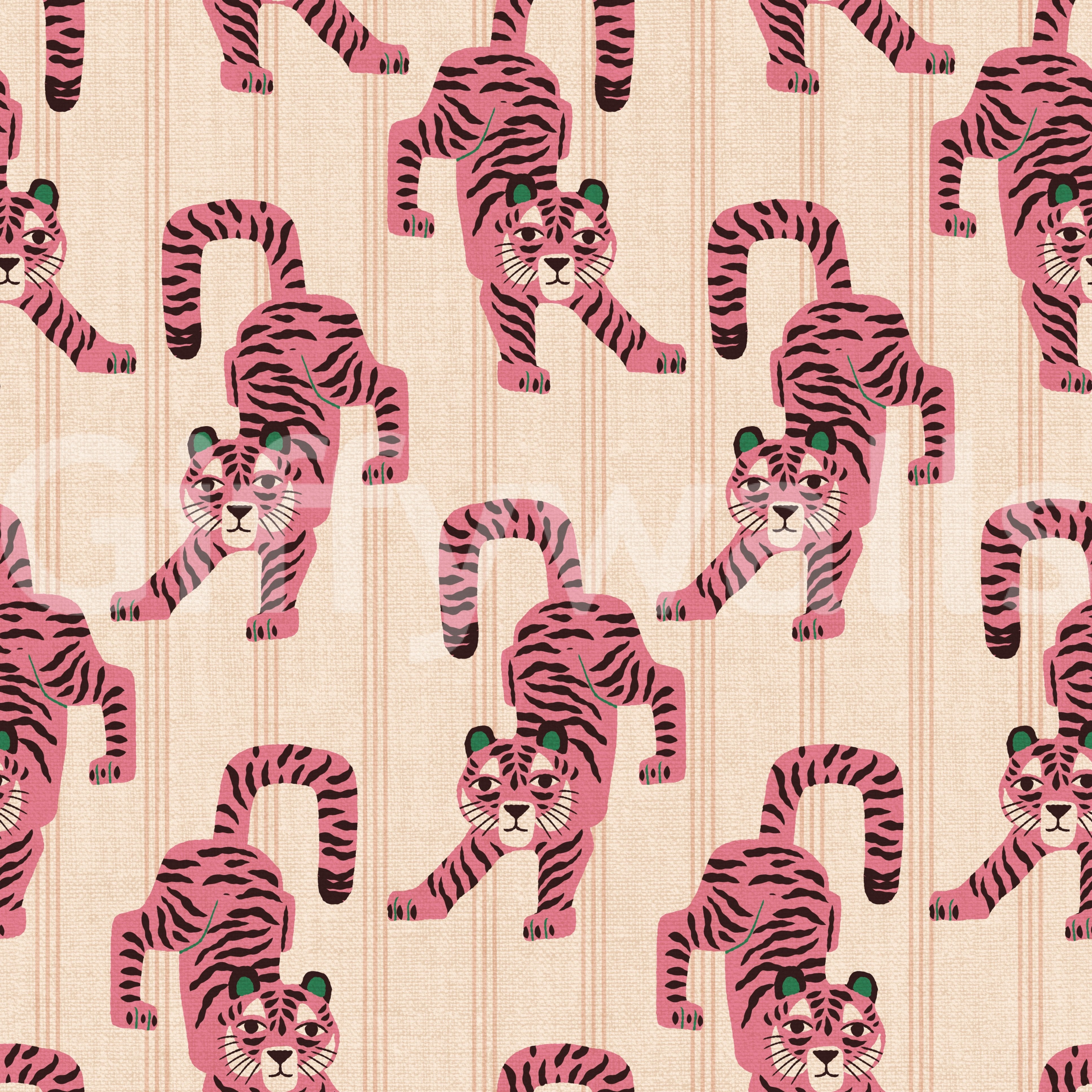 Embrace playful sophistication with this "Pink Jumping Tiger Jewel Jungle" wallpaper. A whimsical design features a repeating pattern of stylized pink tigers, their dark stripes contrasting beautifully against their vibrant hue. Each tiger is playfully depicted in a mid-leap, creating a dynamic and energetic feel. The subtle, pale pink and cream striped background adds a touch of elegance, reminiscent of a luxurious textile. This wallpaper effortlessly blends bold animal print with a sophisticated color palette, perfect for adding a touch of unexpected fun and personality to any space. The design is both modern and timeless, making it a versatile choice for various interior styles.