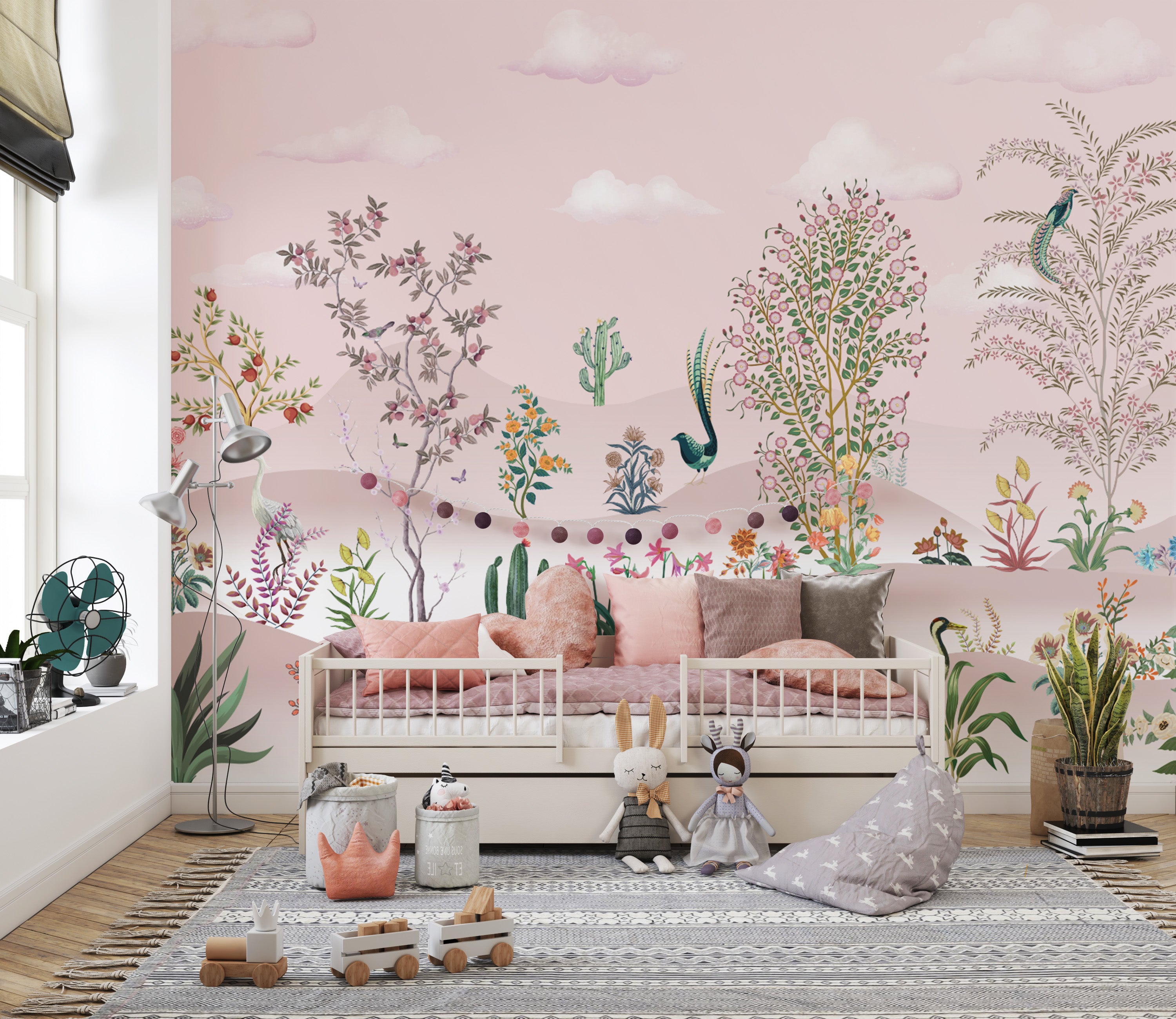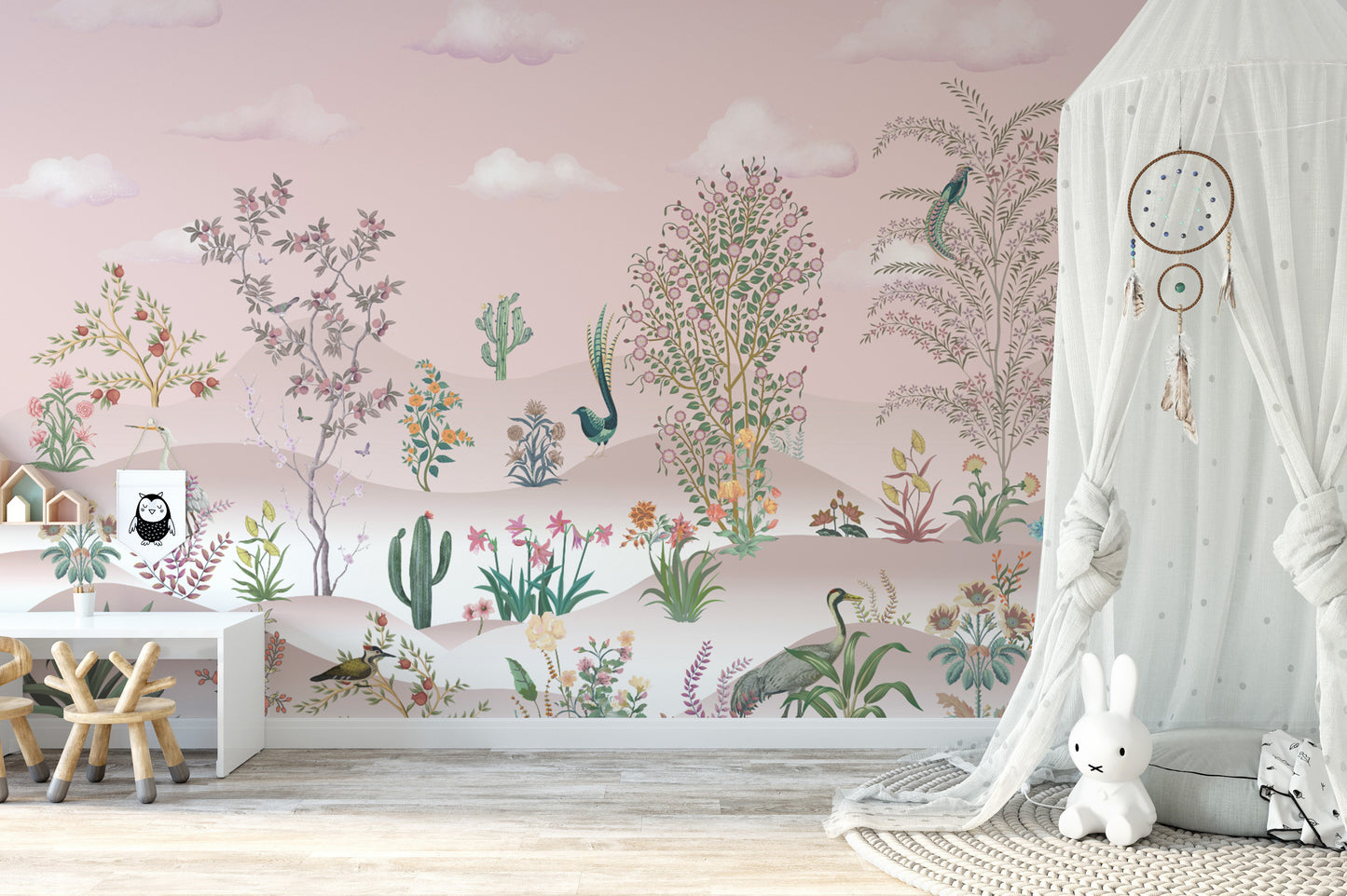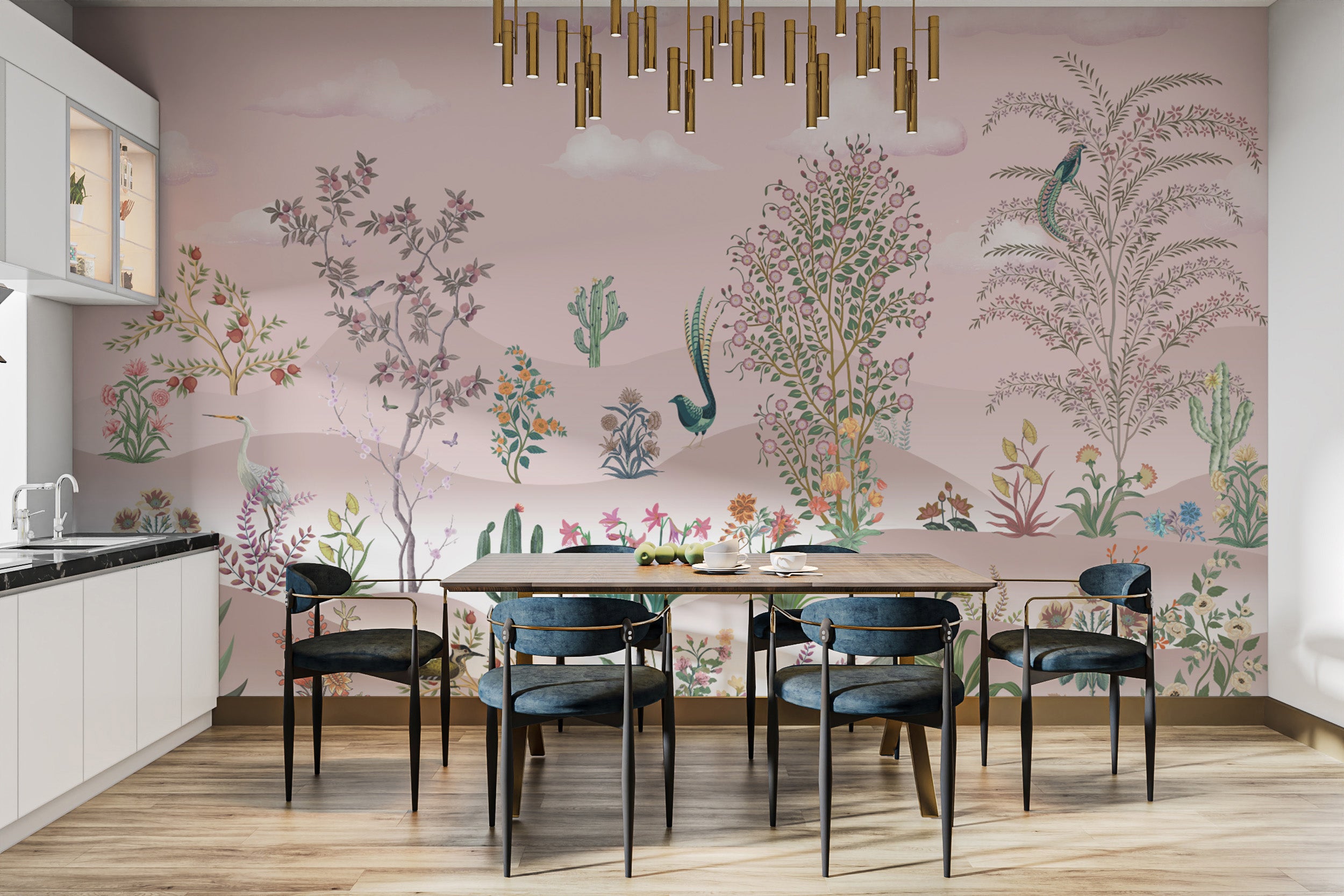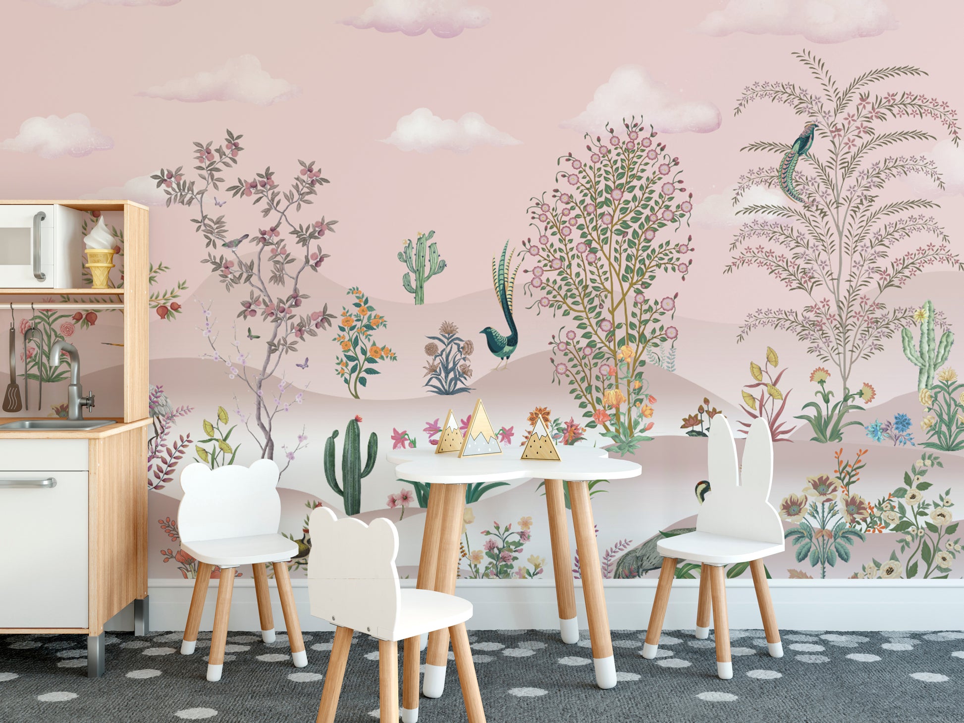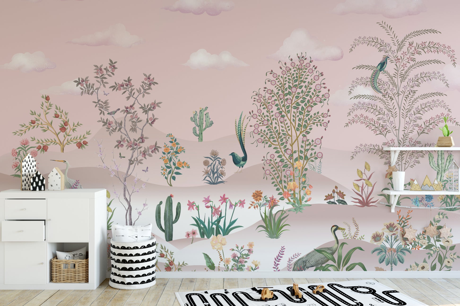 Pink vintage desert botanical wallpaper brings a soft, elegant touch with pastel dunes, delicate florals, and exotic birds. The detailed floral and fauna wallpaper showcases blooming trees, cacti, and graceful peacocks, creating a serene atmosphere. The hand-painted watercolor nature mural blends pink and earthy tones, complementing modern and classic interiors. Perfect for bedrooms, living rooms, and offices, this vintage botanical wallpaper highlights intricate botanical elements. The gentle hues and scenic details offer a timeless appeal. The desert garden scene wallpaper pairs well with neutral or bold accents, enhancing any room's unique natural charm and sophistication.