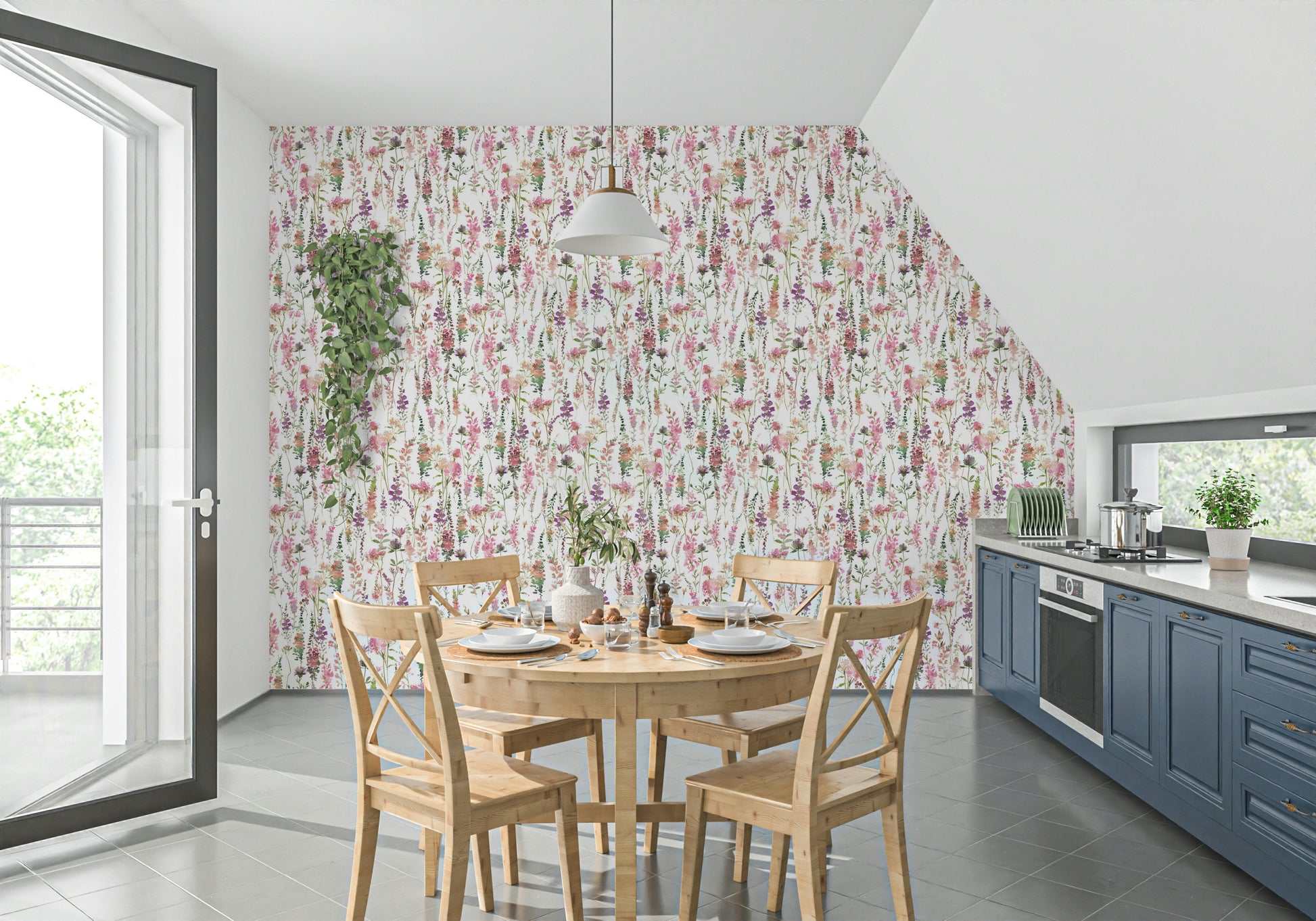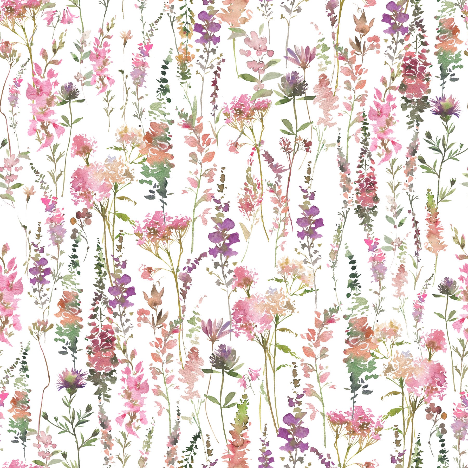 Immerse yourself in the delicate beauty of the 'Pink Watercolor Meadow' wallpaper by Uta Naumann. This serene design captures the essence of a tranquil floral landscape, rendered in soft, dreamy watercolor hues. Gentle pinks, subtle purples, and touches of earthy greens blend seamlessly against a crisp white background, creating a light and airy atmosphere. The intricate details of each flower and blade of grass are meticulously painted, giving the impression of a flourishing meadow bathed in the warm glow of the setting sun. This wallpaper brings a touch of nature's artistry to any space, fostering a sense of calm and peacefulness. Perfect for bedrooms, living rooms, or any area where you seek a soothing and aesthetically pleasing backdrop, the 'Pink Watercolor Meadow' evokes the quiet beauty of a blossoming spring day. Its artistic rendering will provide a subtle, sophisticated aesthetic, elevating your décor with its understated elegance.