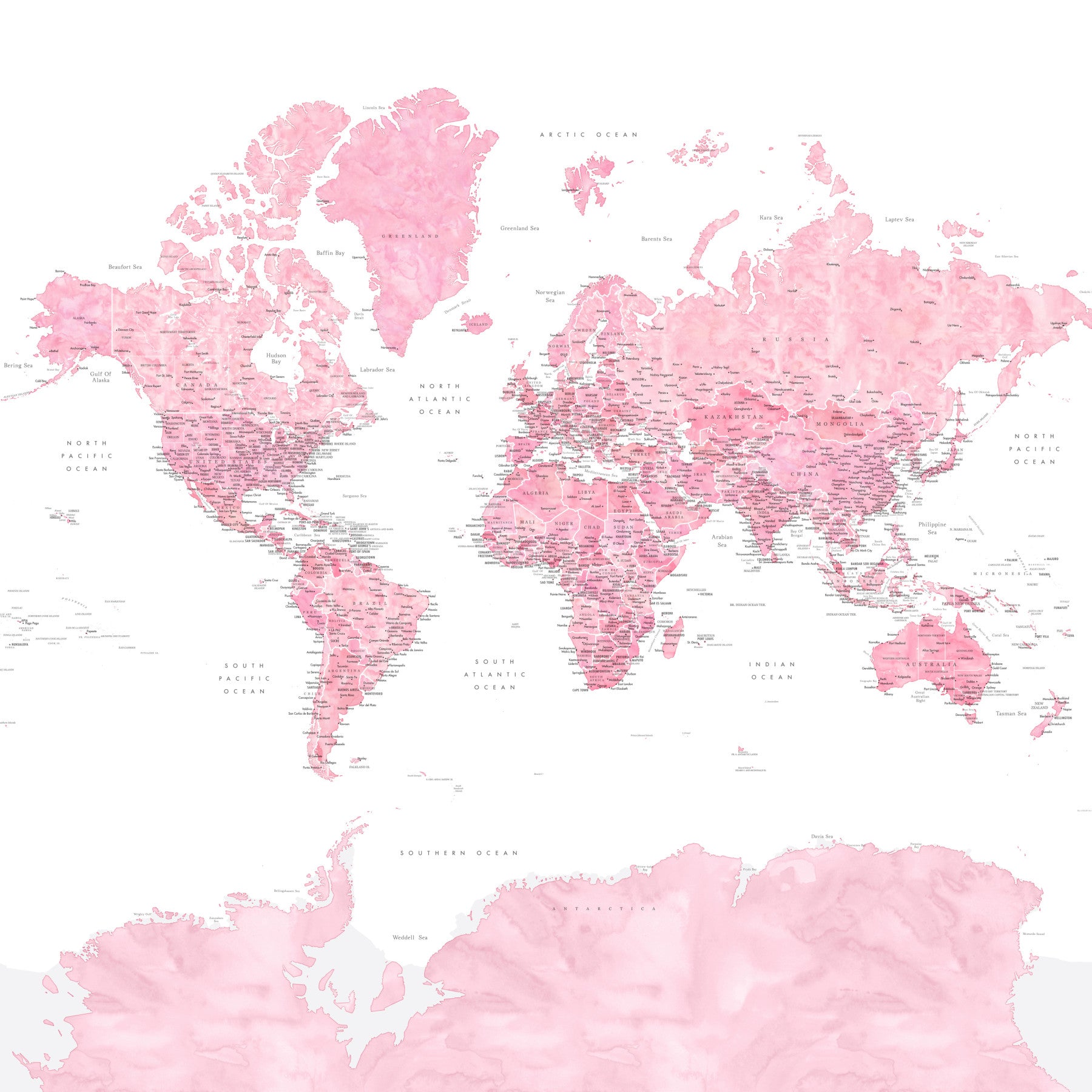 This dreamy wallpaper features a delicate watercolor world map in soft blush pink hues. Each country is subtly defined, creating a visually appealing and calming aesthetic. The map's soft, romantic color palette makes it perfect for bedrooms, nurseries, or any space needing a touch of gentle elegance. City names are subtly included, adding a touch of detail without overwhelming the artistic design. This wallpaper offers a unique blend of artistic expression and geographical representation, perfect for those who appreciate beautiful design and global wanderlust.