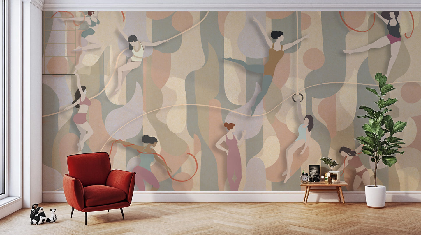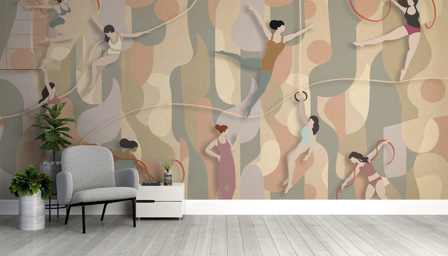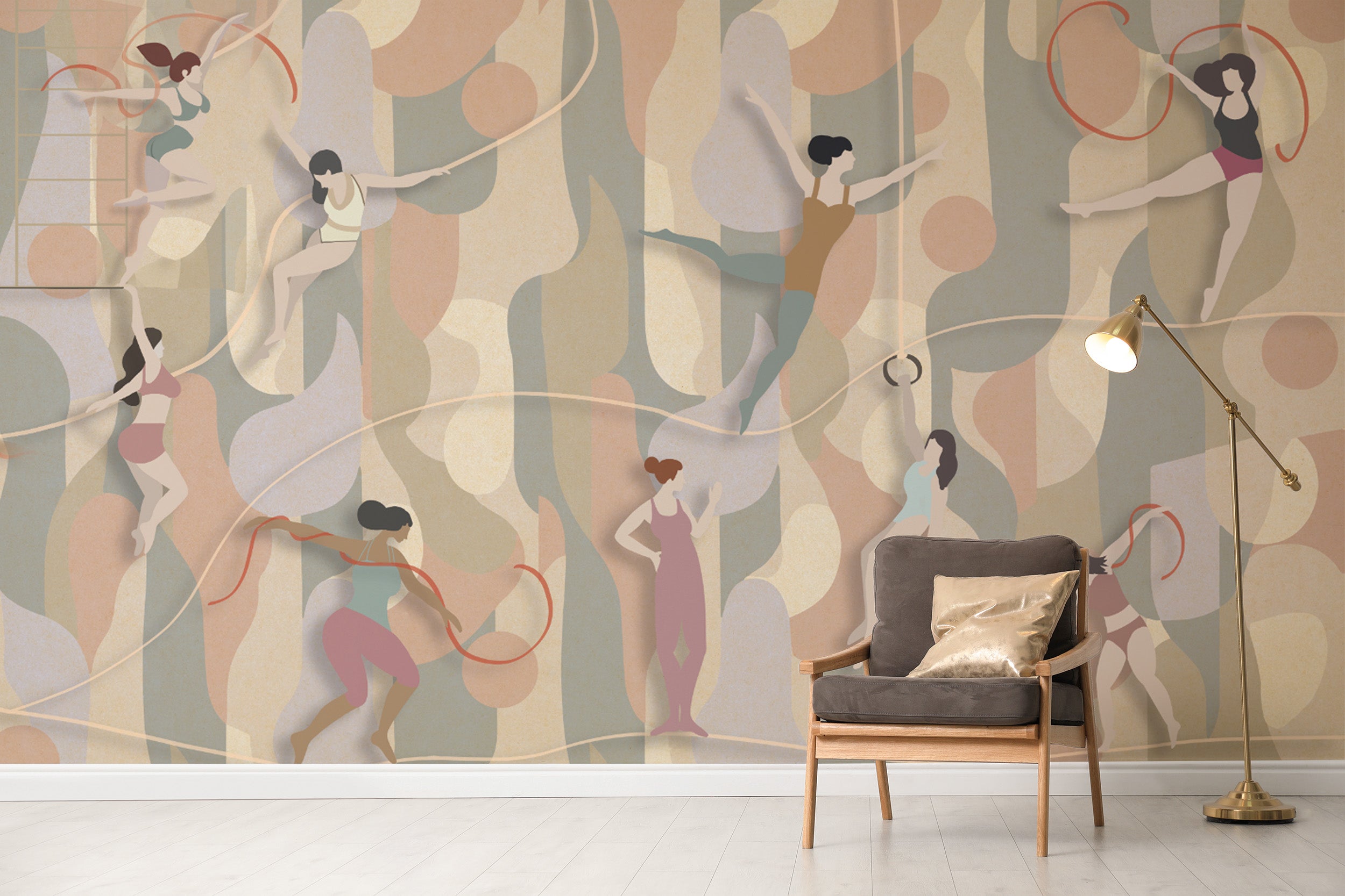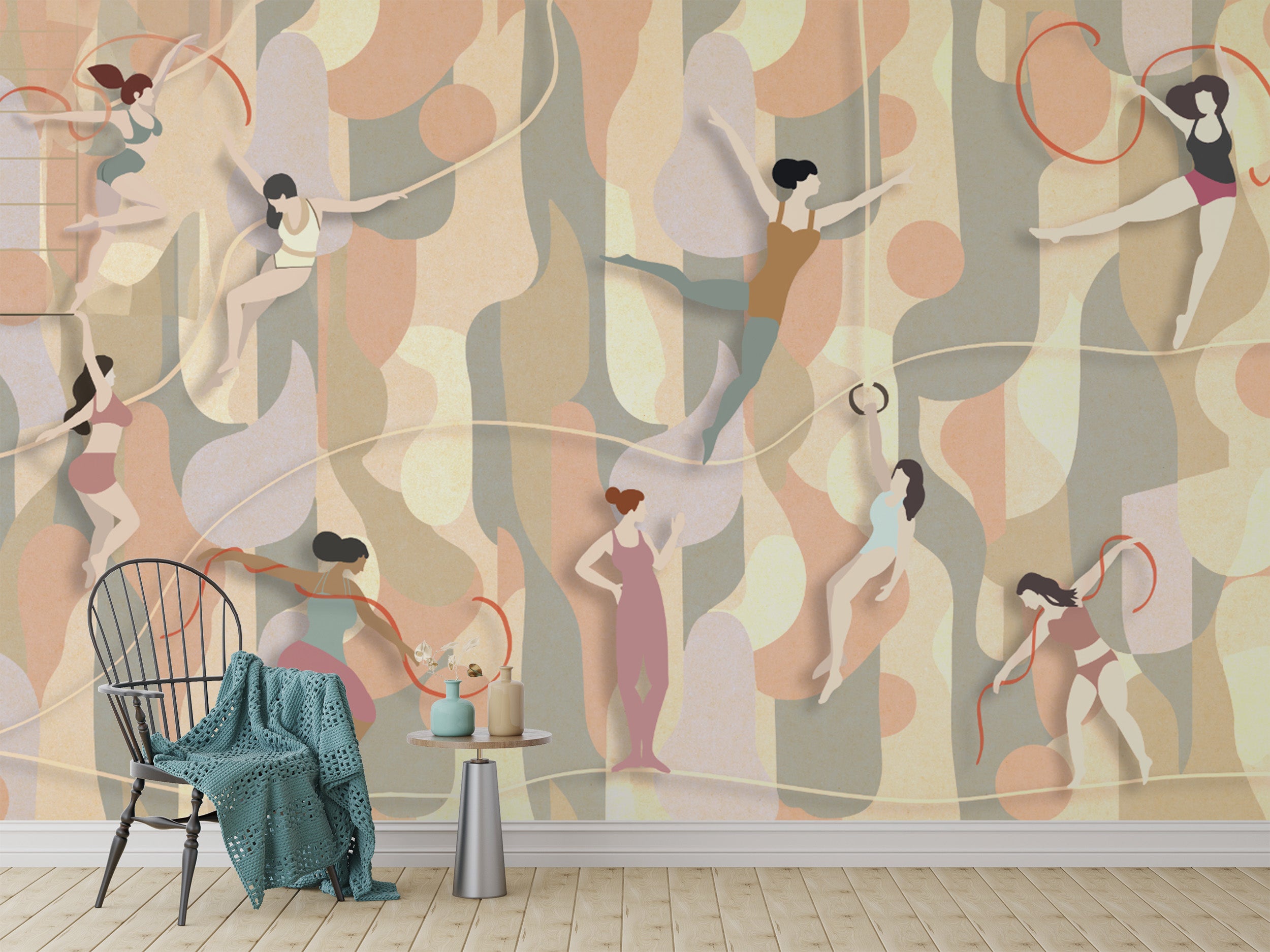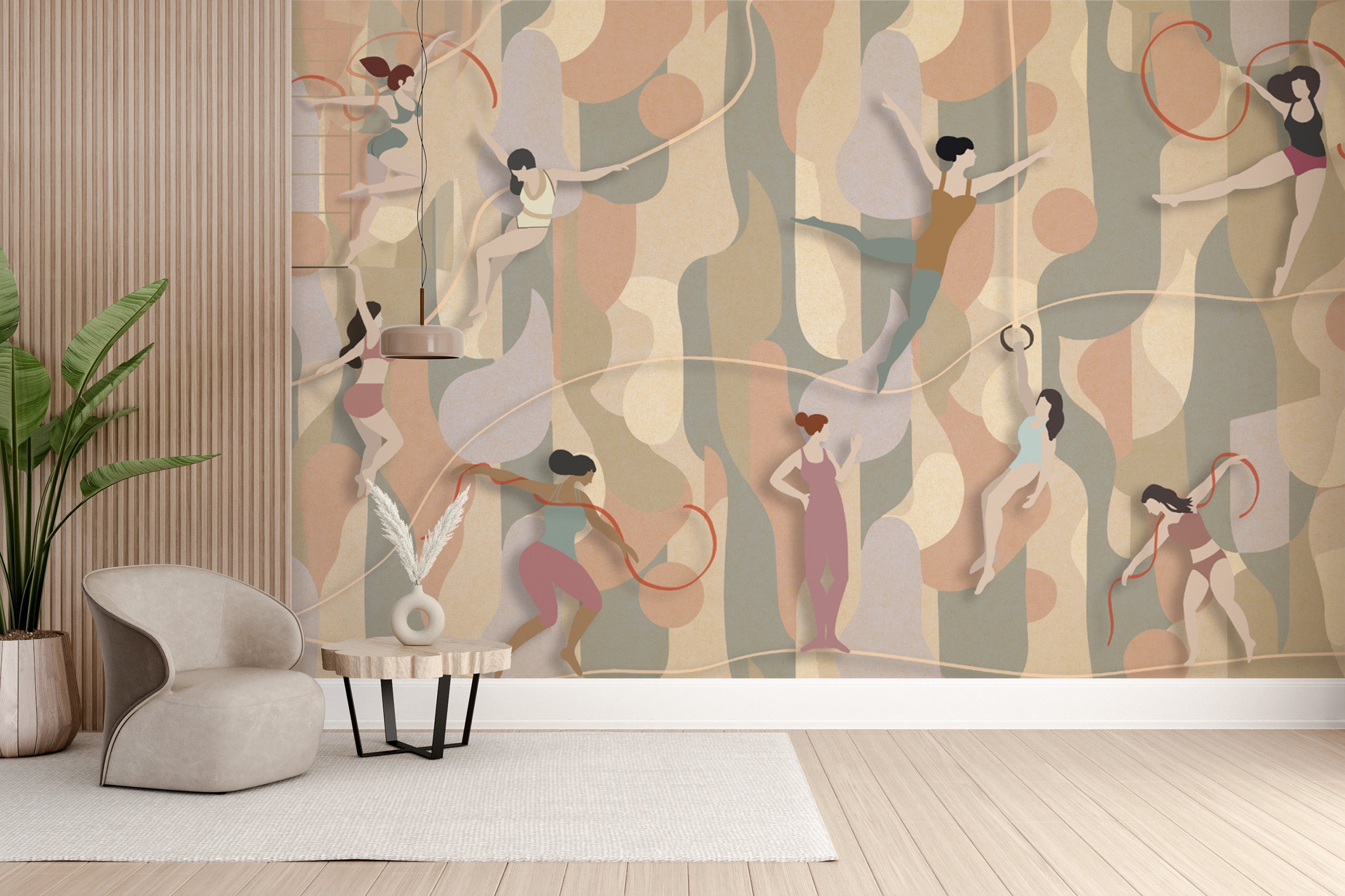 Dance into your life with Poise in Motion Rhythmic Dance Wallpaper. This striking design features fluid motion portrayals of graceful gymnasts and dancers, accentuated by rhythmic ribbons and artistic silhouettes. The soft, earthy tones set a soothing, dynamic tone, making them ideal for dance studios, creative spaces, or modern interiors. Inspired by the beauty of movement and balance, this wallpaper embodies poise in expression. Whether it is for a workout space or a work of art, this design will transform any room with rhythm, passion, and graceful motion.