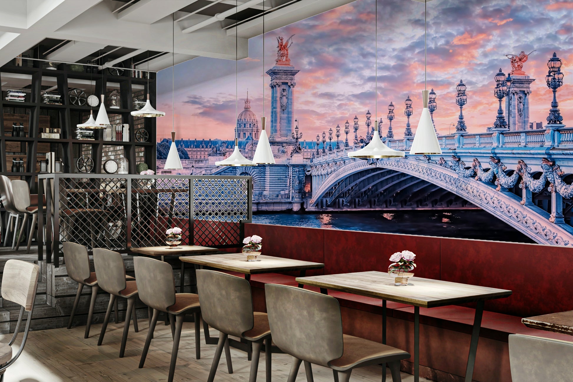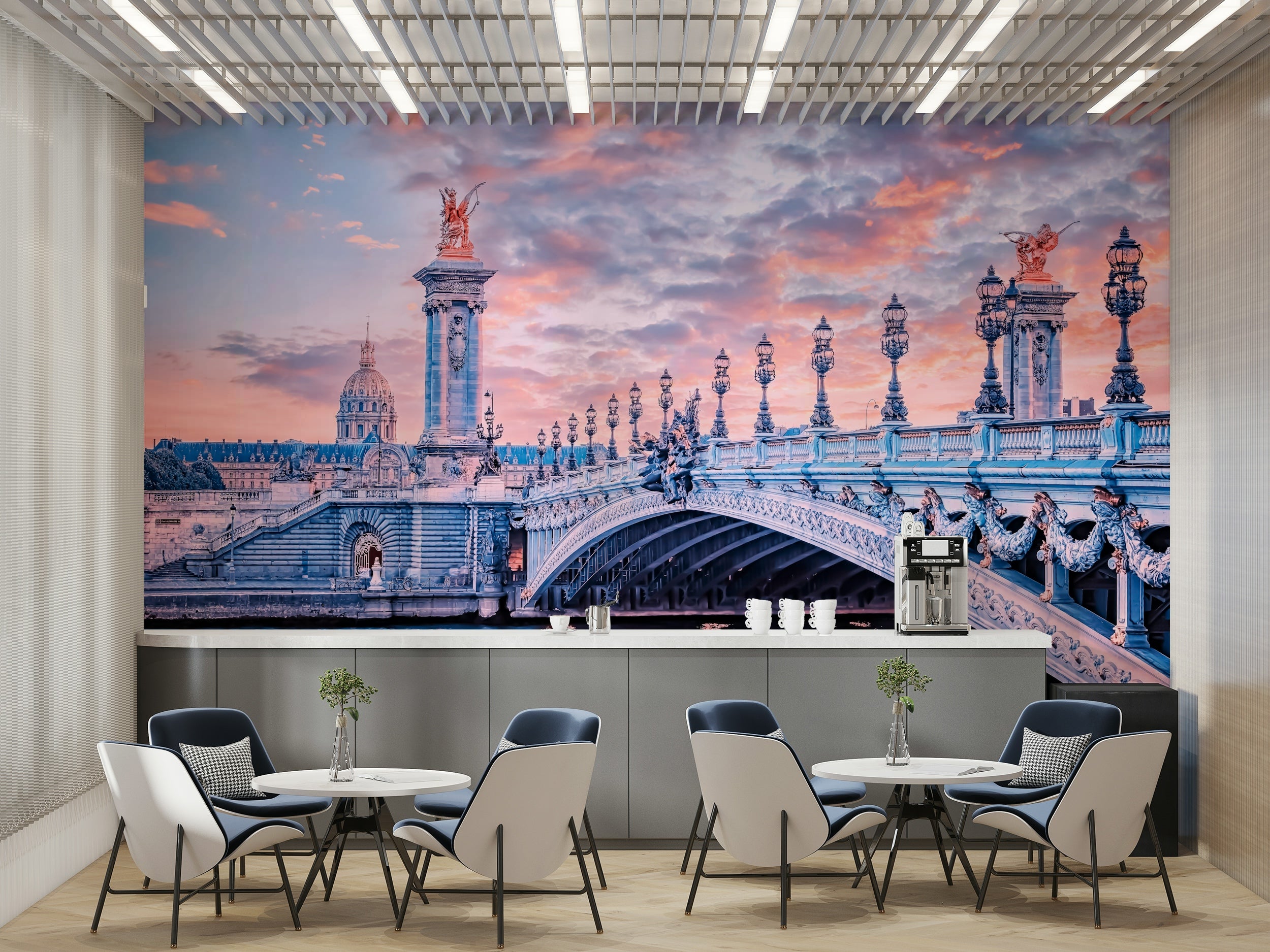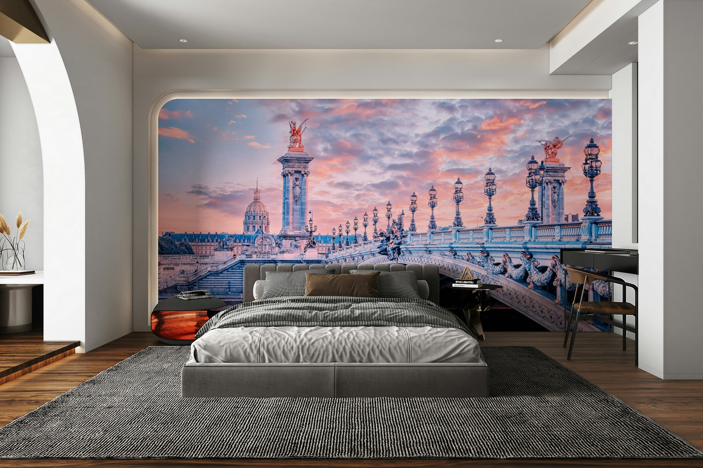 This captivating wallpaper transports you to the heart of Paris, capturing the breathtaking beauty of the Pont Alexandre III at sunset. The bridge's intricate design, adorned with statues and ornate lampposts, is dramatically highlighted against a sky awash in warm pink and soft lavender tones. The tranquil Seine River mirrors the bridge's elegance, creating a mesmerizing reflection. The image evokes feelings of romance, serenity, and wanderlust, perfect for those who dream of Parisian adventures.