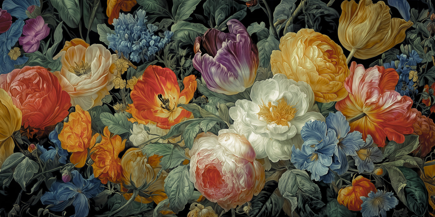 The design evokes the grandeur of classical floral paintings, with intricate details and a luxurious feel.